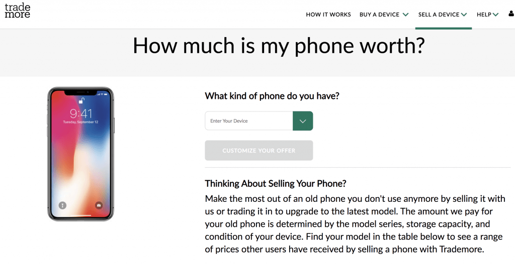 - Visit Trademore’s How Much Is My Phone Worth? page to quickly find out how much you can get for trading in your phone. You can sell your iPhone, smartphone, tablet, and smartwatches on their website and receive a competitive price.