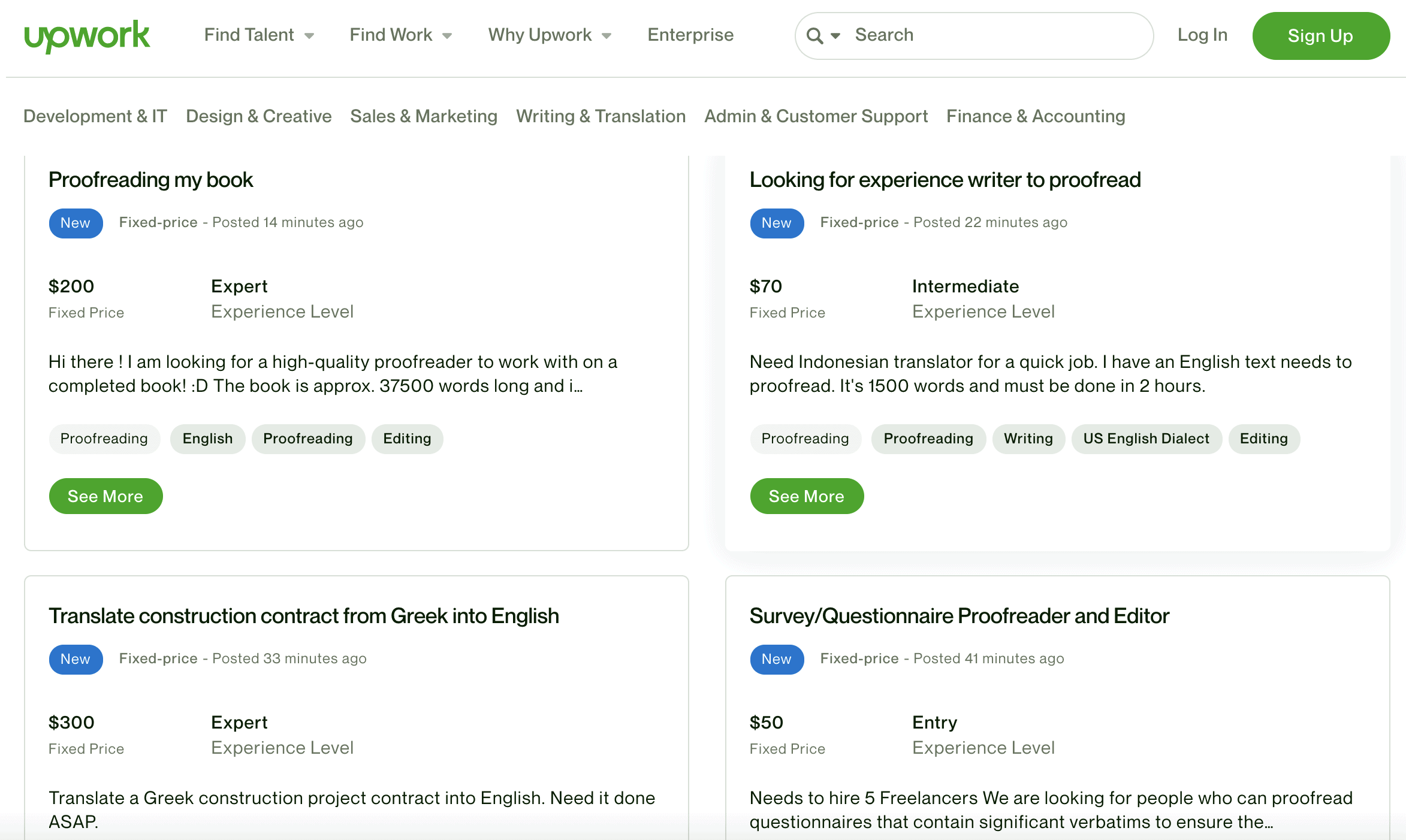 Below is a screenshot of some online proofreading jobs that I found on UpWork.