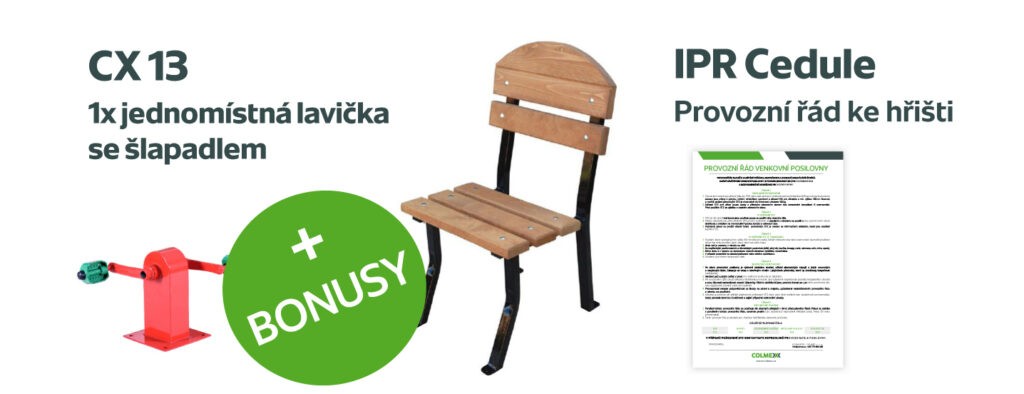 Bonusy: Jednomístná kovová lavička se dřevem a k ní šlapadlo CX 13a, IPR tabule Provozní řád, který je ukotvený na kovové tyči