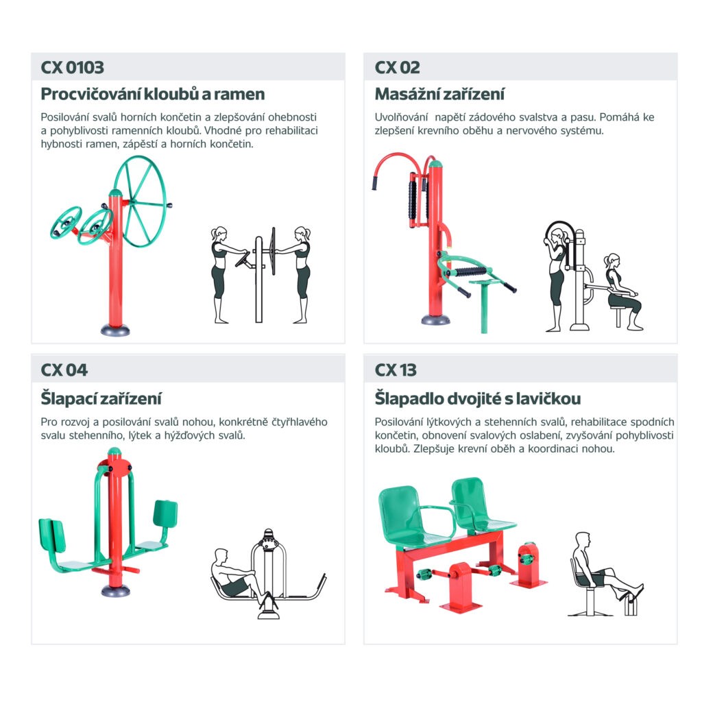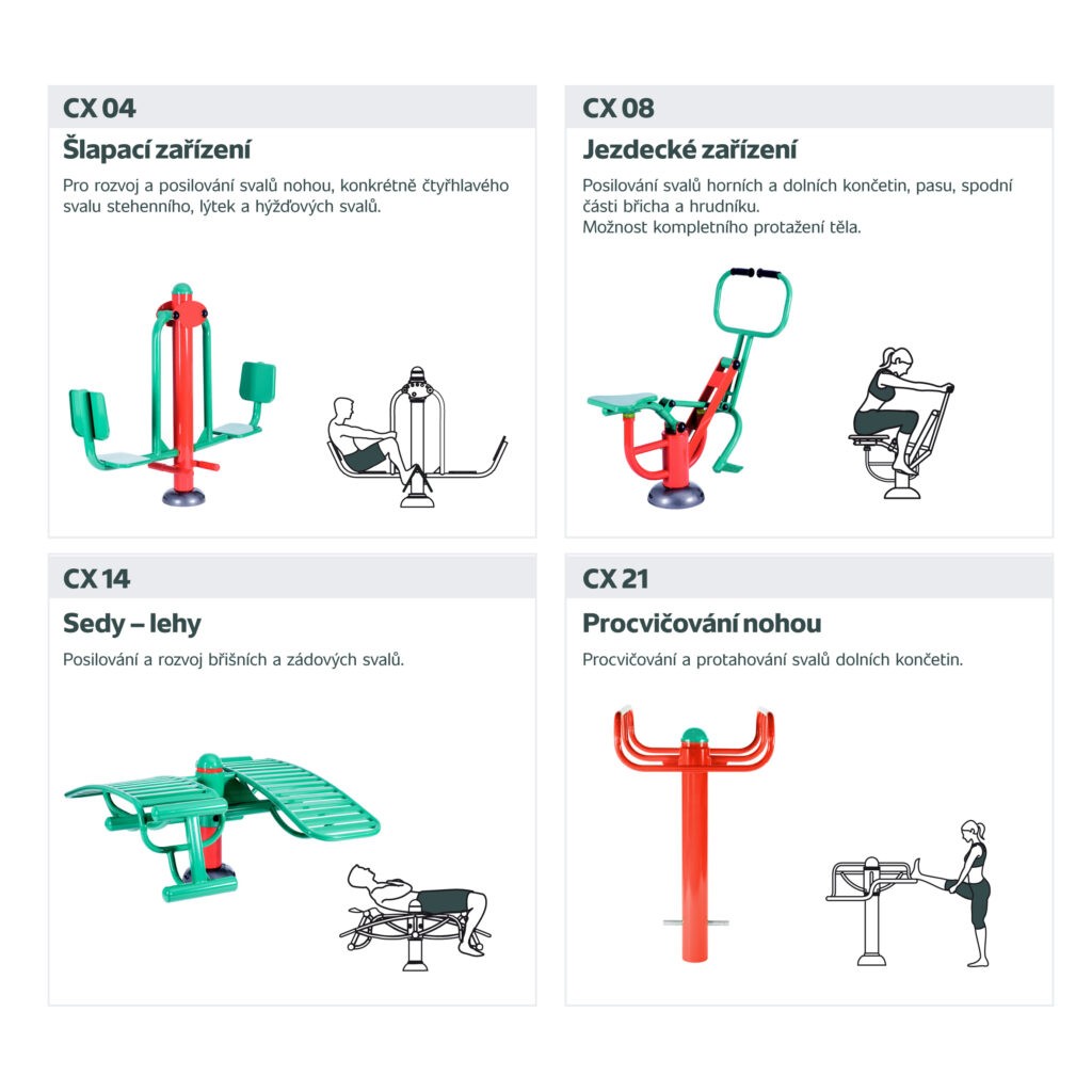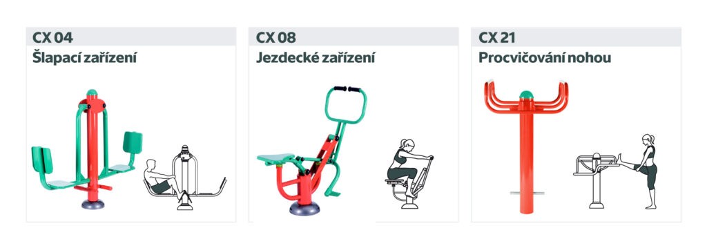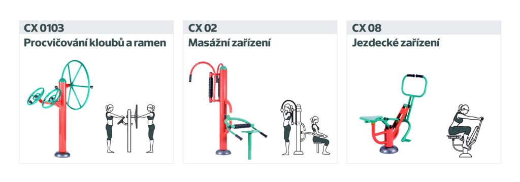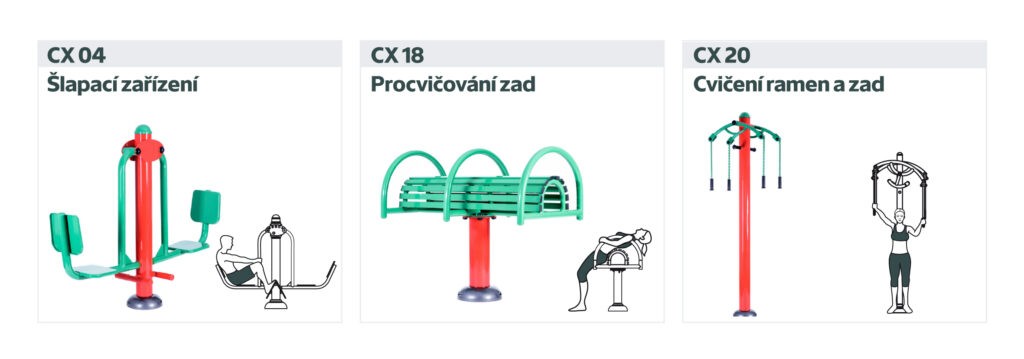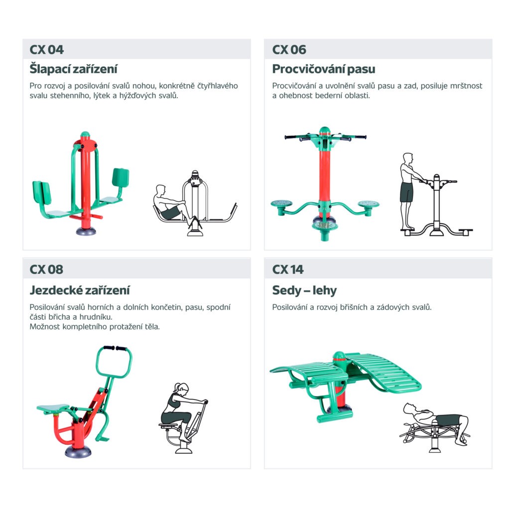 Připravili jsme 6 variant kombinací strojů řady CX, aby bylo z čeho vybírat. Ke každé variantě dostanete navíc několik BONUSŮ, který plánovaný fitpark ještě rozšíří a zpestří.