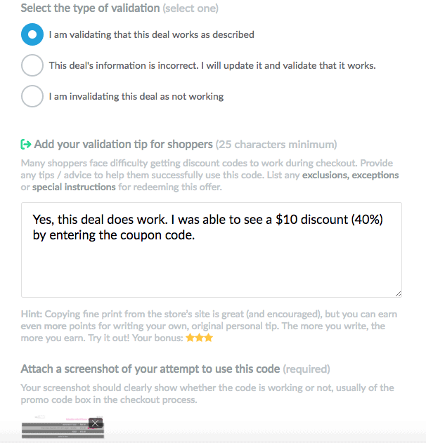 Validating deals is quite easy to do (it couldn’t be easier) and it’s great because you’re helping other members save money, as well as earning rewards as well!