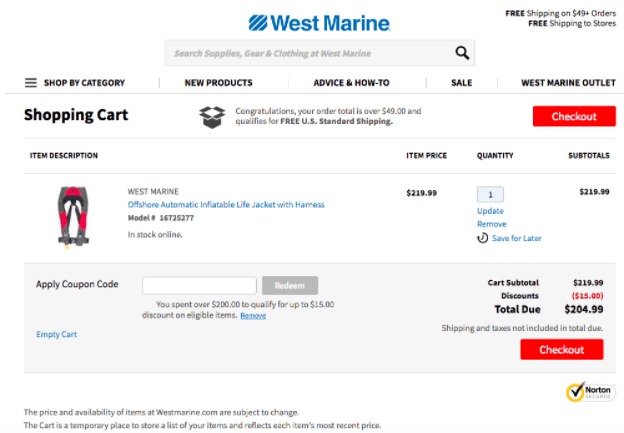 I then went to West Marine’s Dealspotr page to try my luck. I saw that I could save $15 by entering this coupon code.