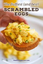 - Water – This is the secret to the fluffiest eggs. Cream is a common and delicious addition, but won’t yield as fluffy eggs as water. Think “steam.”