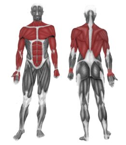 Posilování celé horní poloviny těla, břišního a zádového svalstva.