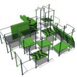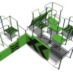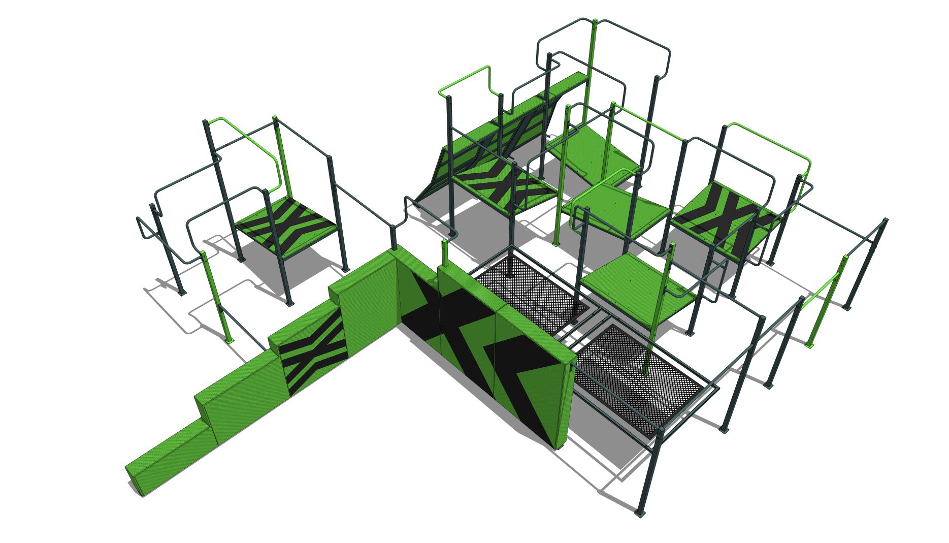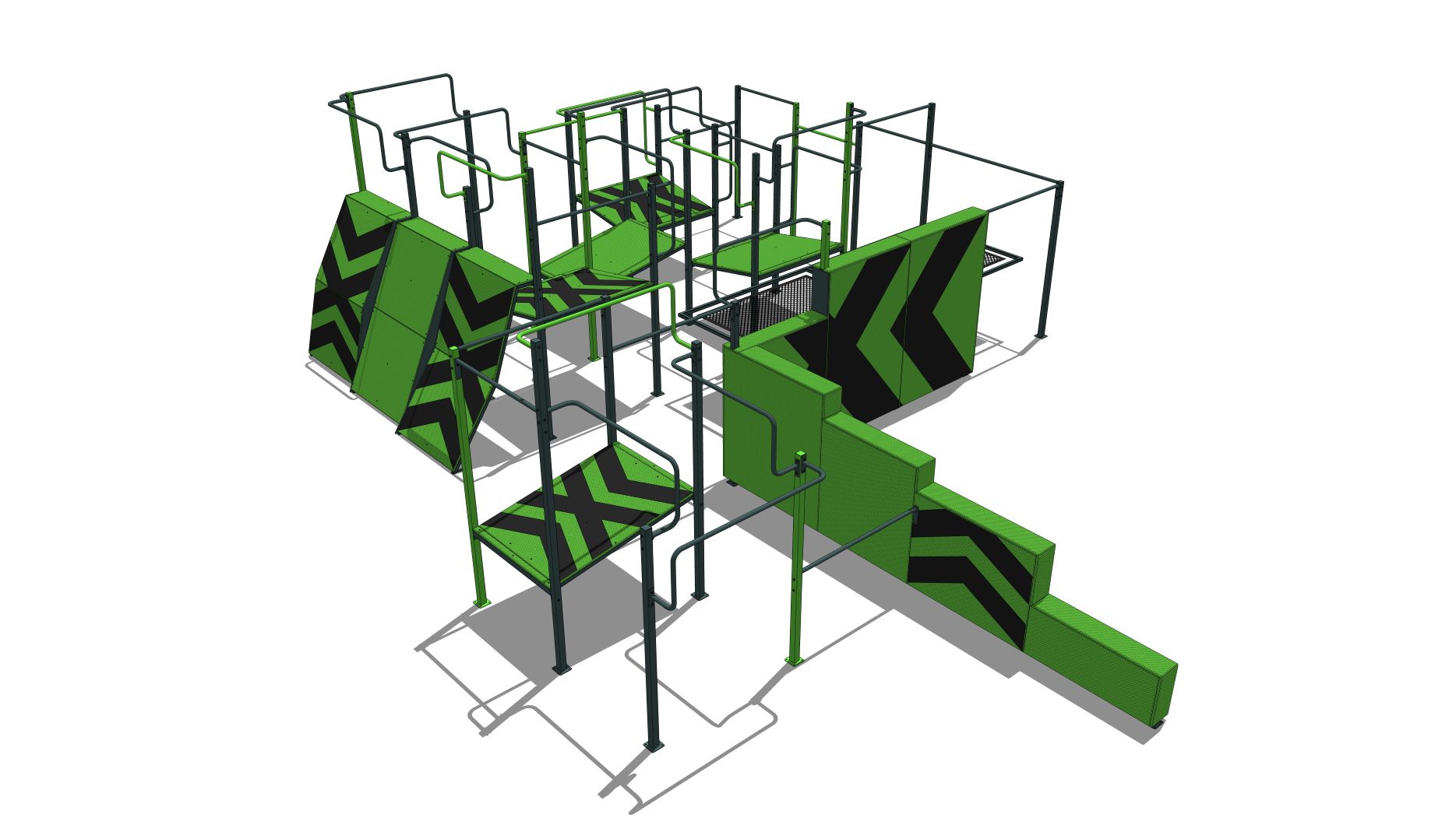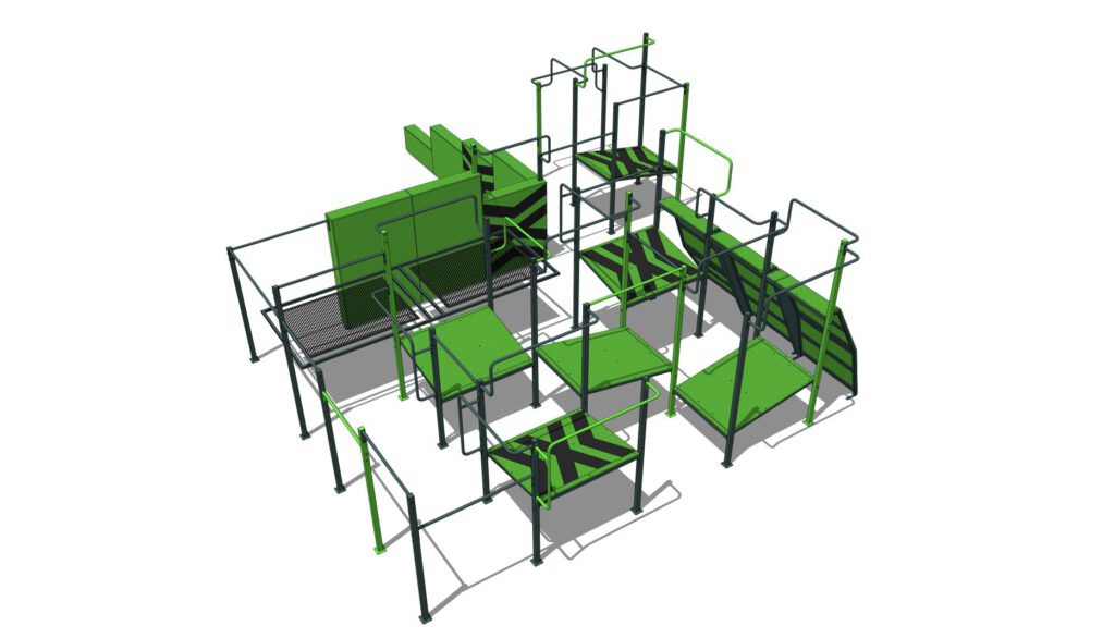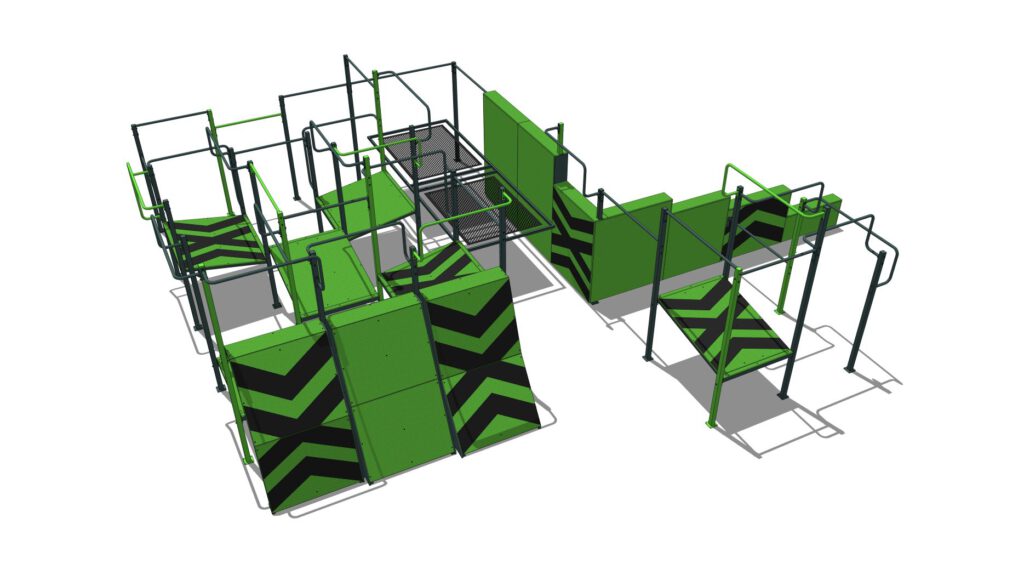 Poznámka: Sestava obsahuje šikmé odrazové desky v několika provedeních, speciálně tvarované hrazdy umožňující více variant úchopu včetně provádění vlajek, přítahů a proskoků, šikmé plošiny pro trénink držení rovnováhy.