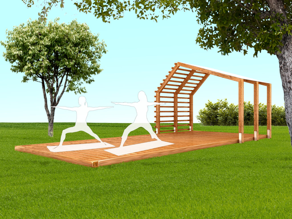 Funkce: Venkovní akátová učebna, kancelář a pódium pro nejlepší nápady a výkony na čerstvém vzduchu v souladu s přírodou. Mentální rozvoj při studiu; zdravé pracovní návyky při práci ve venkovní kanceláři; rozvoj koordinace, síly, pružnosti a lásky k přírodě při józe.
