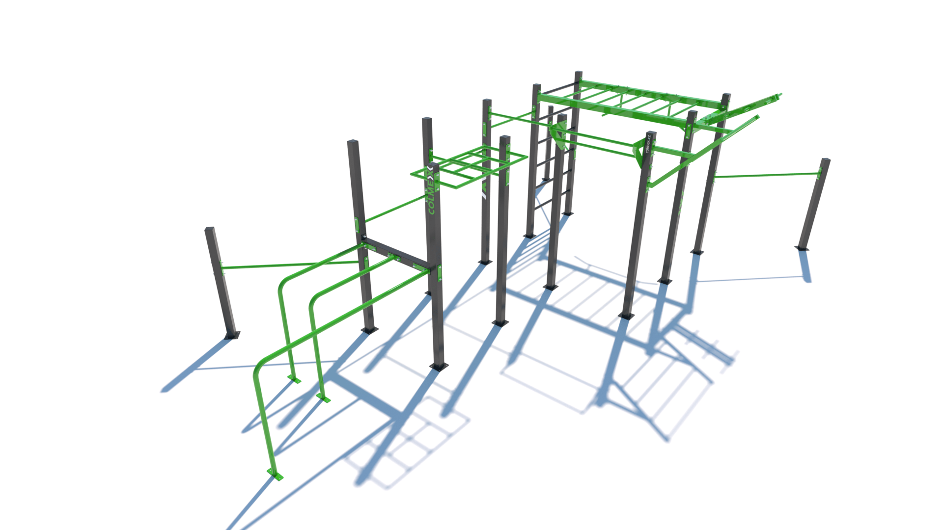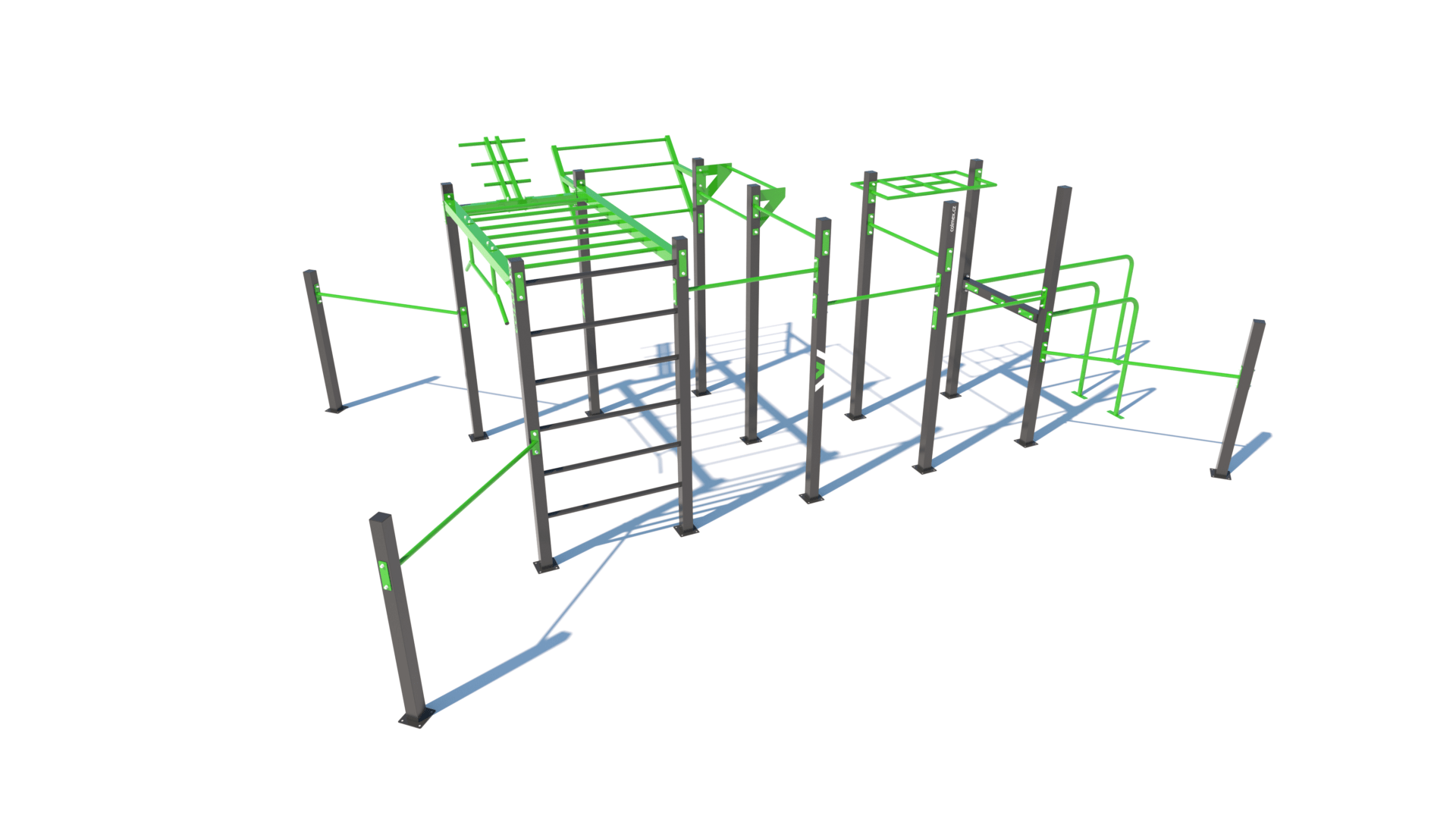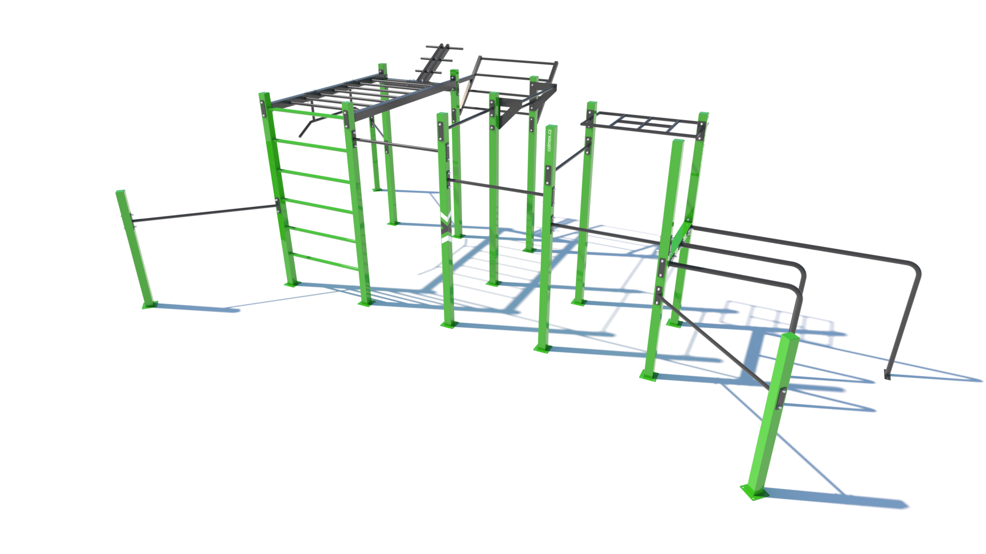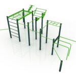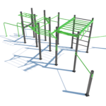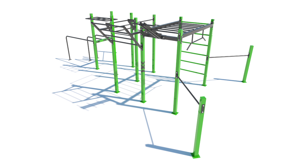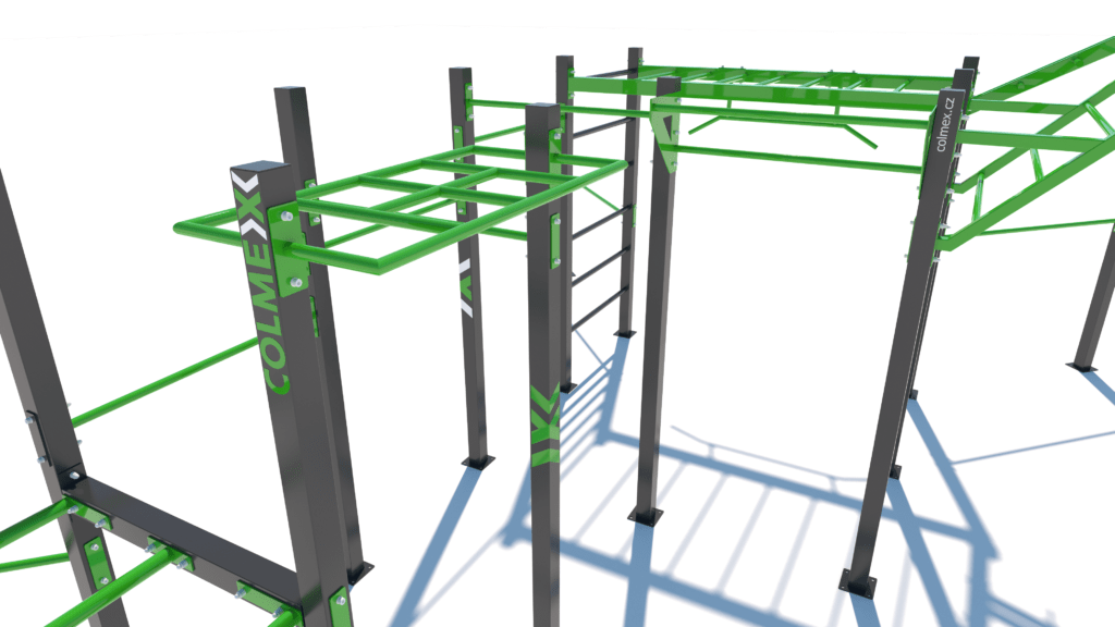 Poznámka: Sestava obsahuje následující workoutové segmenty: soustavu hrazd v různých výškách, boční hrazdy, hrazdu podvěšenou, hrazdu střední, vodorovný, svislý a šikmý žebřík, trojitá bradla, multifunkci (slouží pro zavěšení kruhů, systému TRX aspod.) a spletenec. Ve standardní nabídce máme zeleno-antracitové nebo antracitovo-zelené provedení. Máte možnost objednání barvy i dle vlastní specifikace.