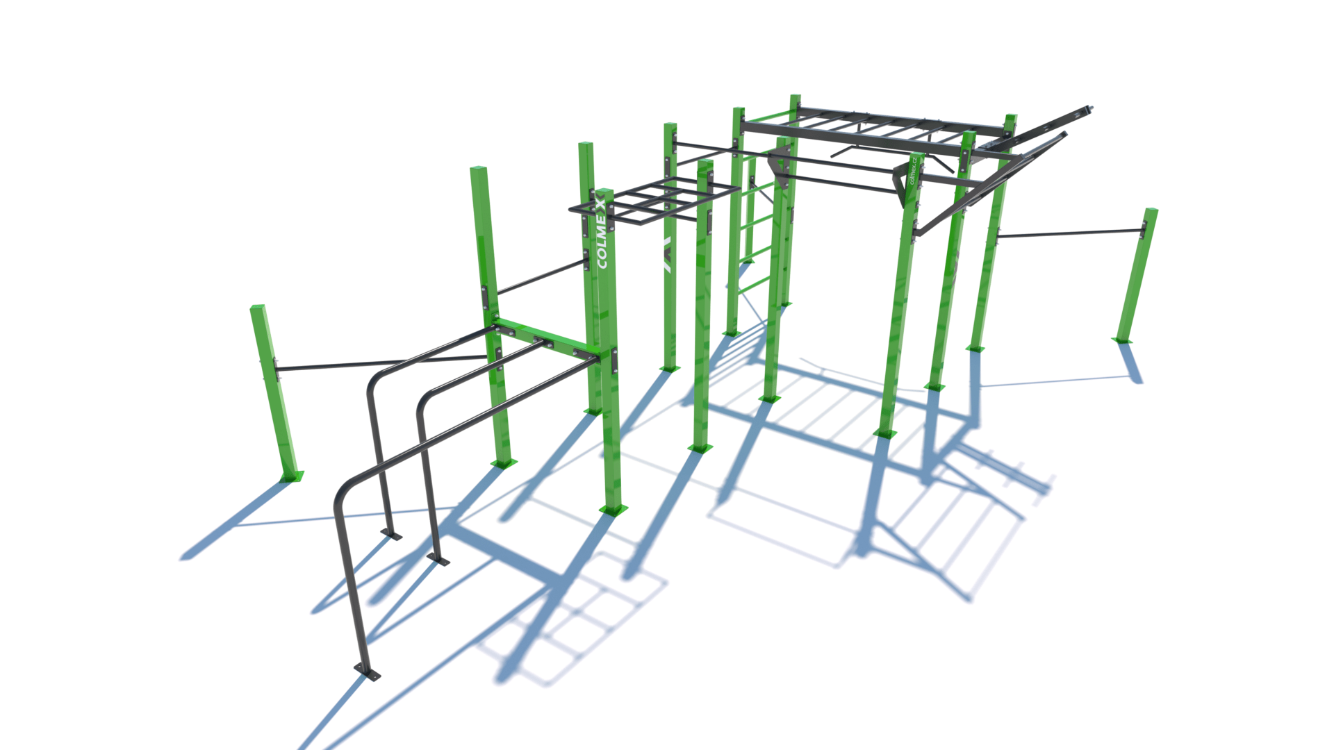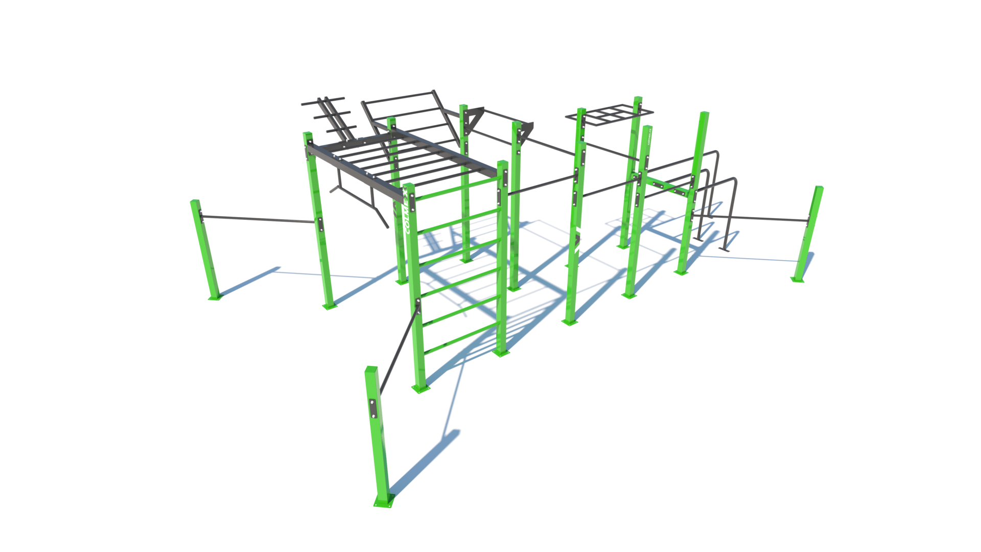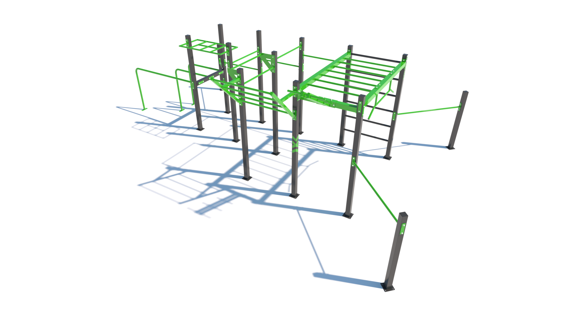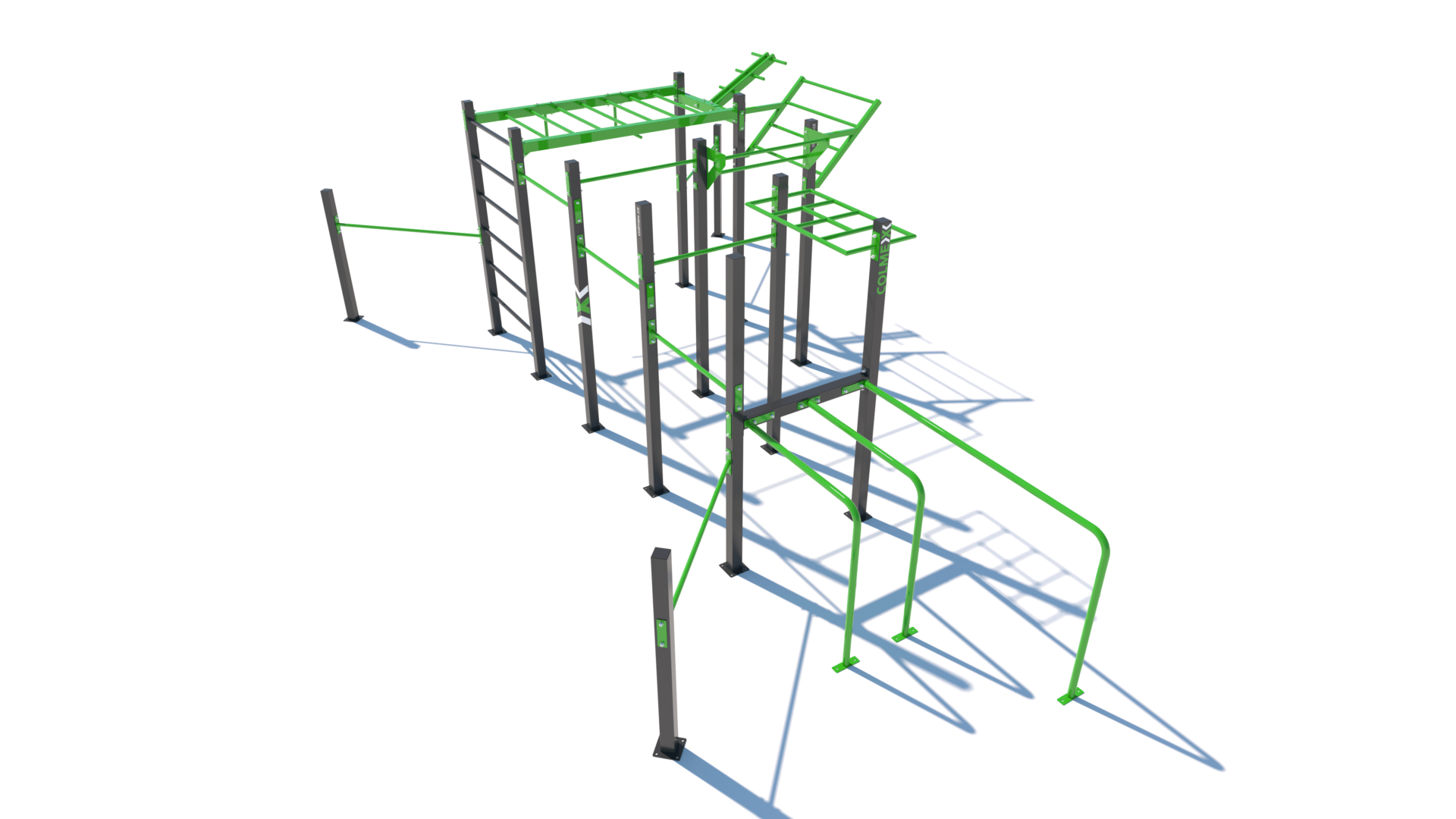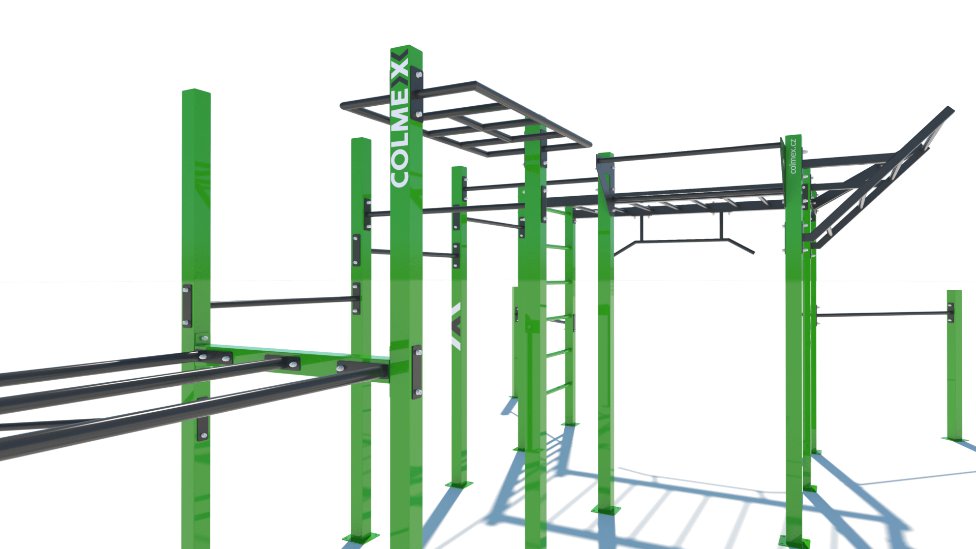 Poznámka: Sestava obsahuje následující workoutové segmenty: soustavu hrazd v různých výškách, boční hrazdy, hrazdu podvěšenou, hrazdu střední, vodorovný, svislý a šikmý žebřík, trojitá bradla, multifunkci (slouží pro zavěšení kruhů, systému TRX aspod.) a spletenec. Ve standardní nabídce máme zeleno-antracitové nebo antracitovo-zelené provedení. Máte možnost objednání barvy i dle vlastní specifikace.