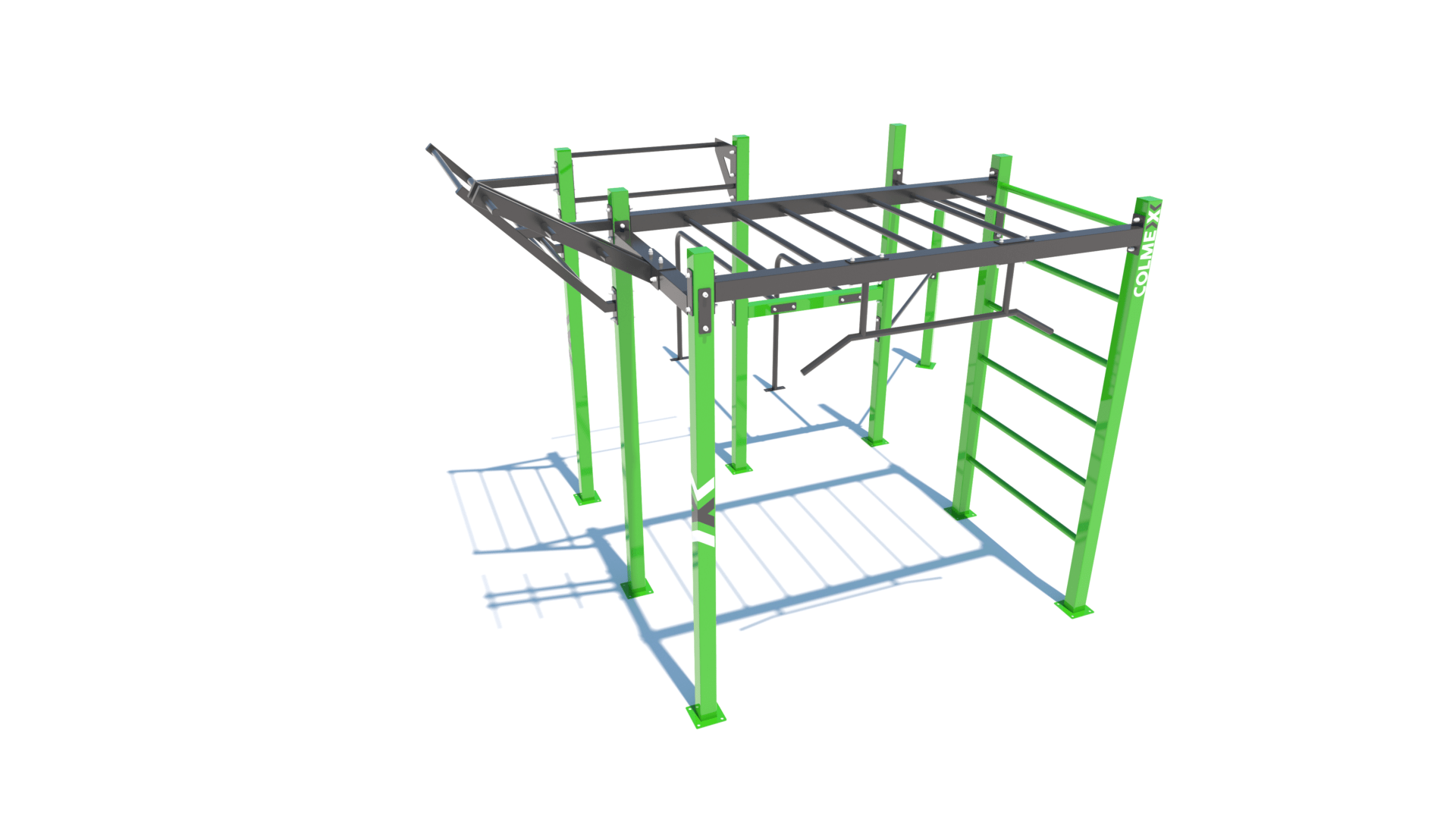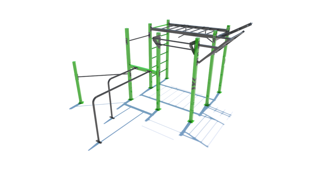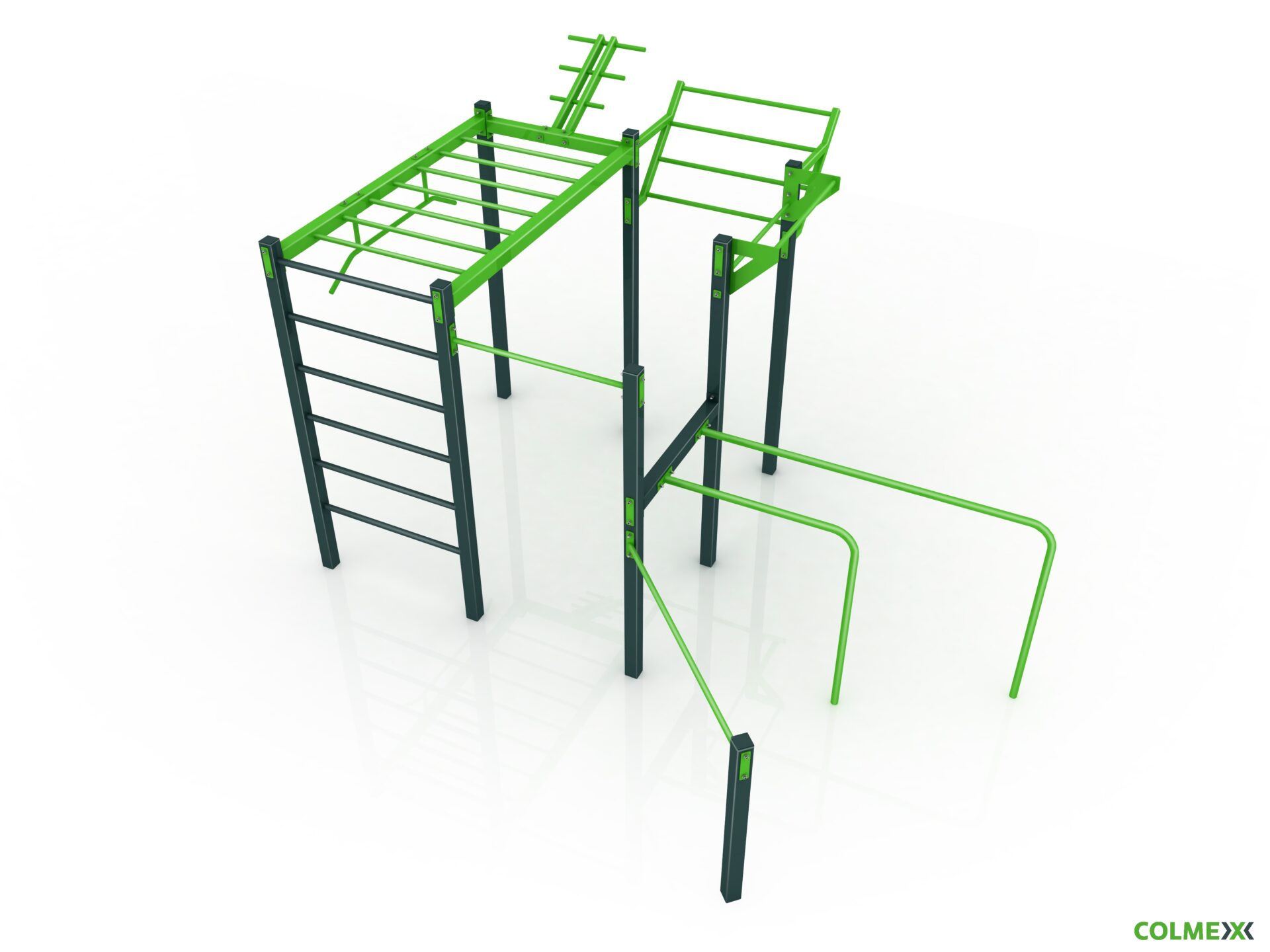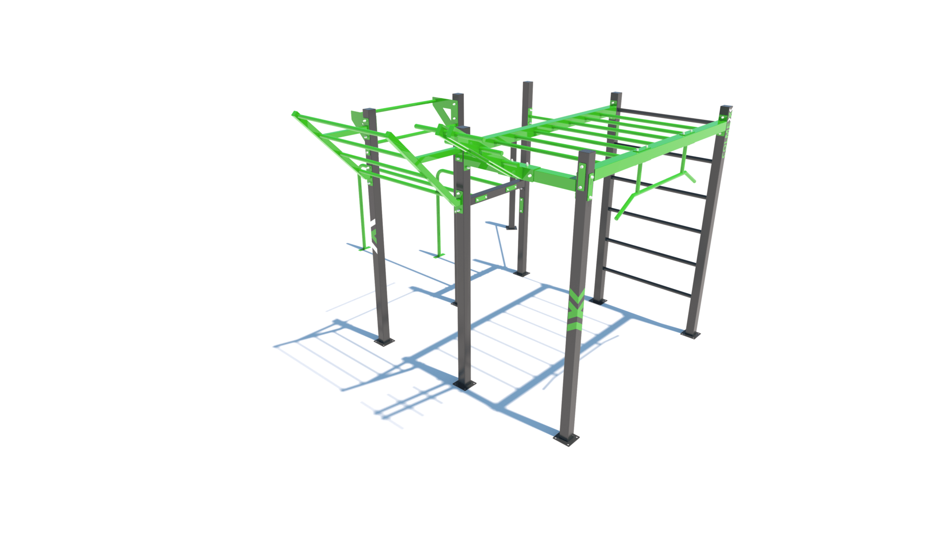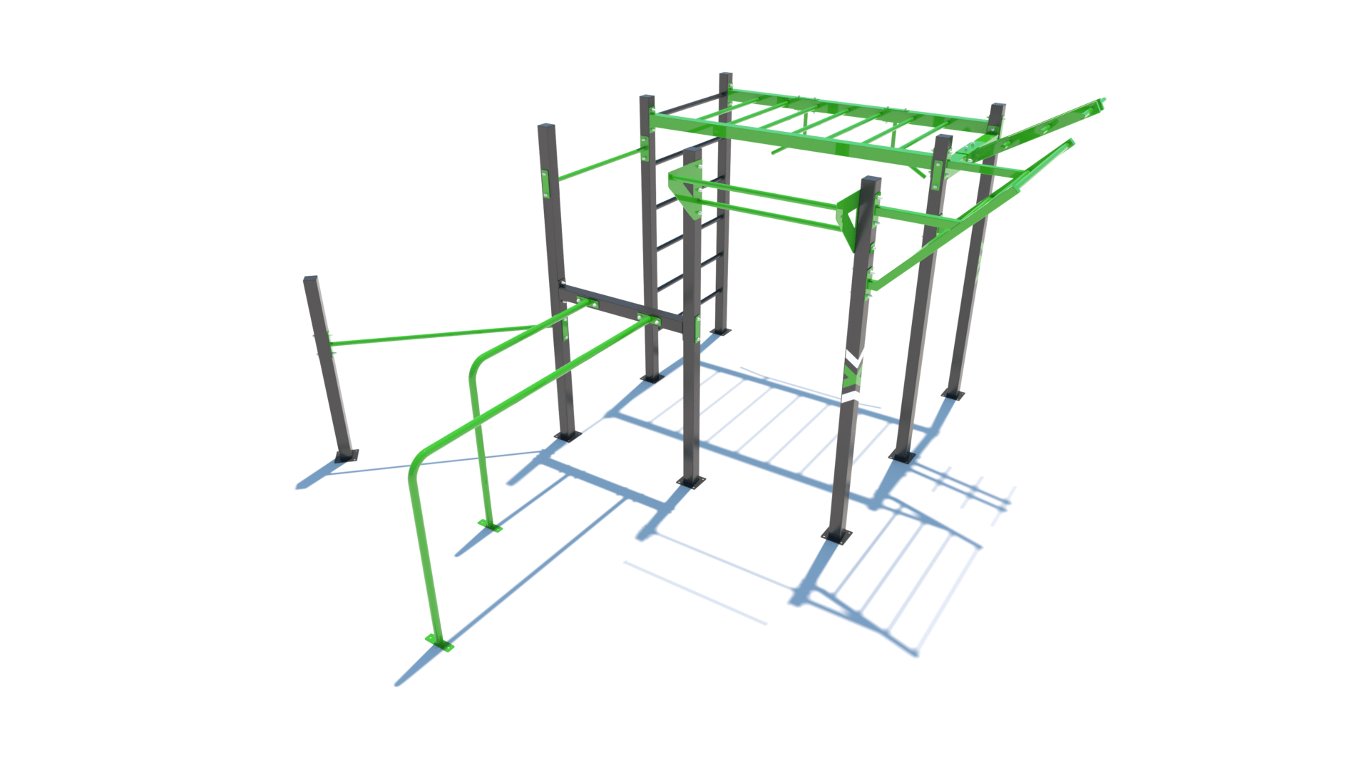 Poznámka: Sestava obsahuje následující workoutové segmenty: jednoduchou hrazdu, boční hrazdu, hrazdu podvěšenou, hrazdu střední, vodorovný, svislý a šikmý žebřík, dvojitá bradla a multifunkci (slouží pro zavěšení kruhů, systému TRX aspod.). Ve standardní nabídce máme zeleno-antracitové nebo antracitovo-zelené provedení. Máte možnost objednání barvy i dle vlastní specifikace.