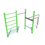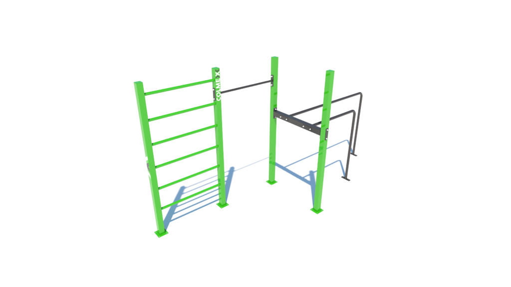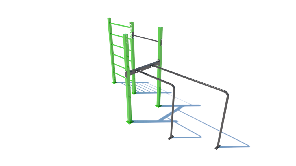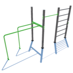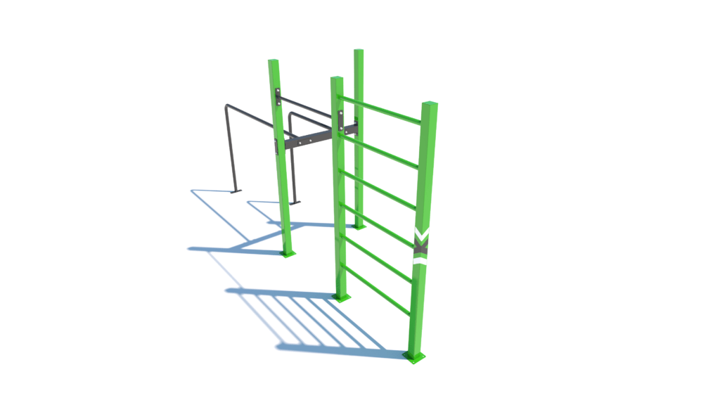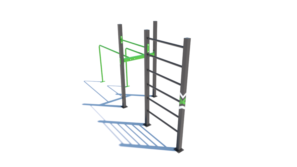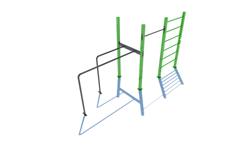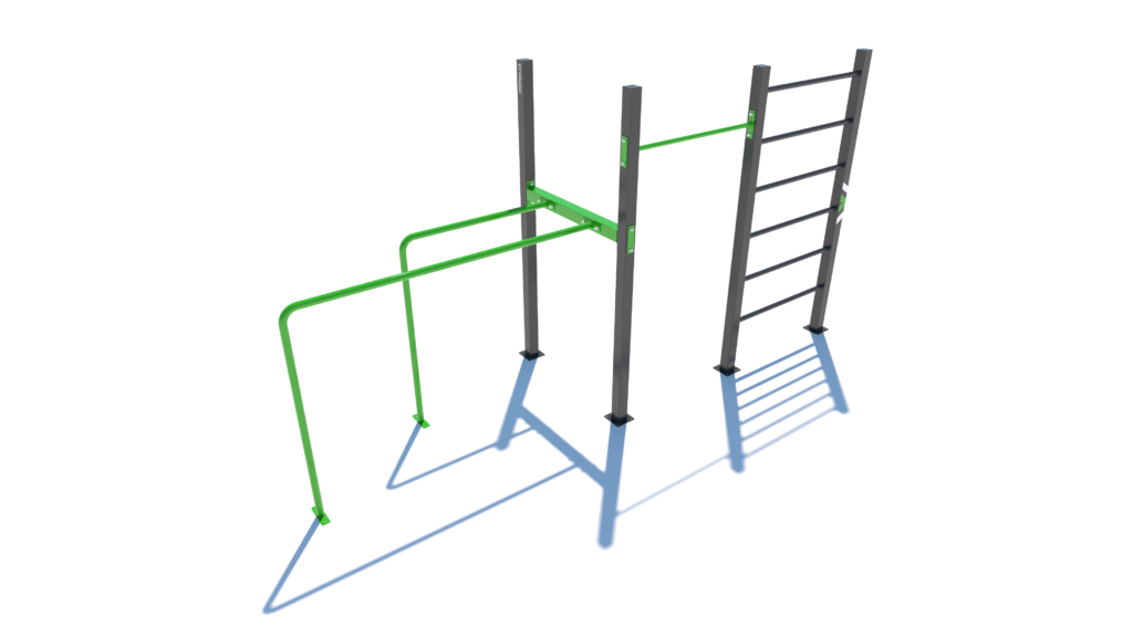 Poznámka: Základní sestava obsahuje následující workoutové segmenty: jednoduchou hrazdu, žebřiny a dvojitá bradla. Další modifikace této sestavy mohou obsahovat prvky spletence, kruhů, multifunkce (slouží pro zavěšení kruhů, systému TRX aspod.) či vodorovného žebříku.