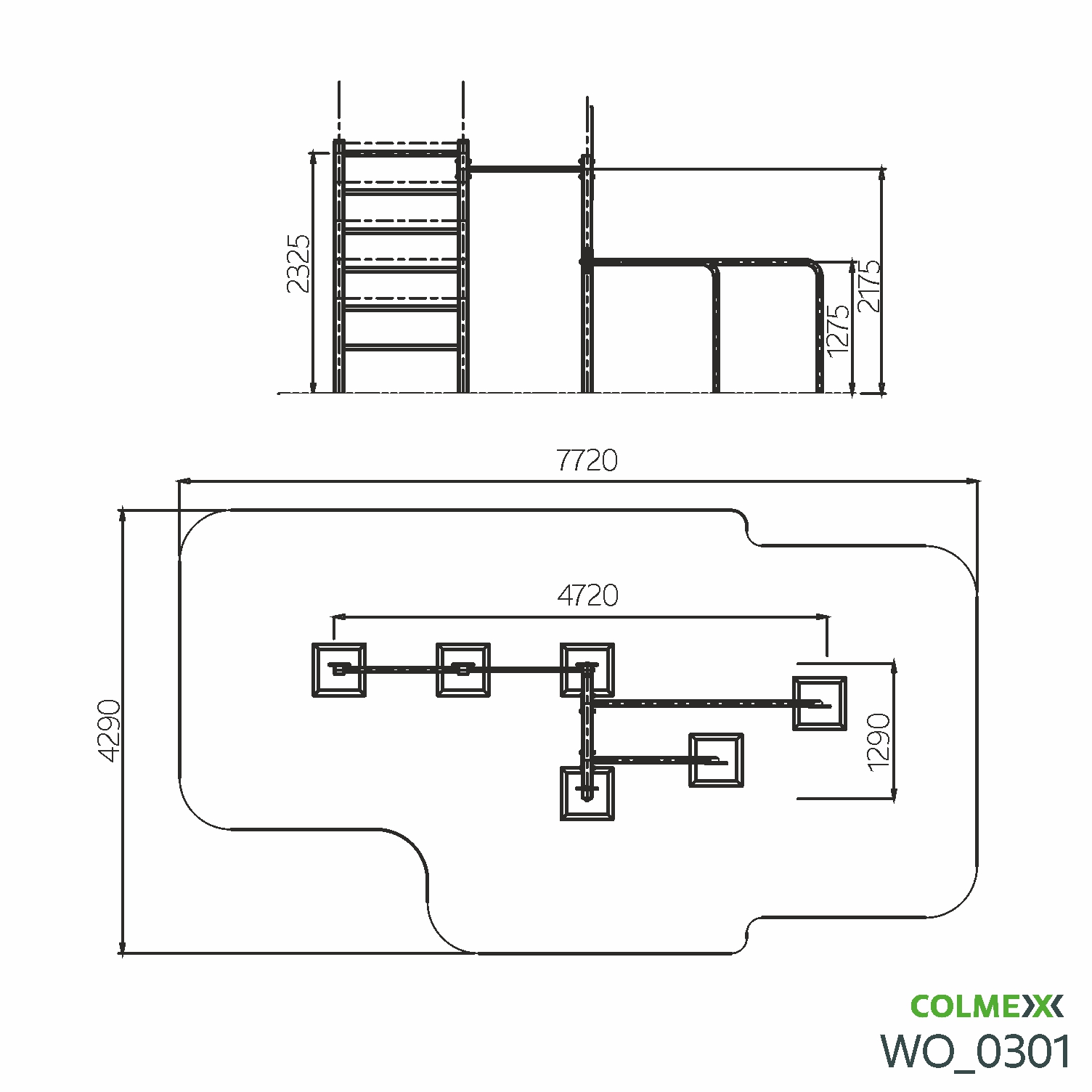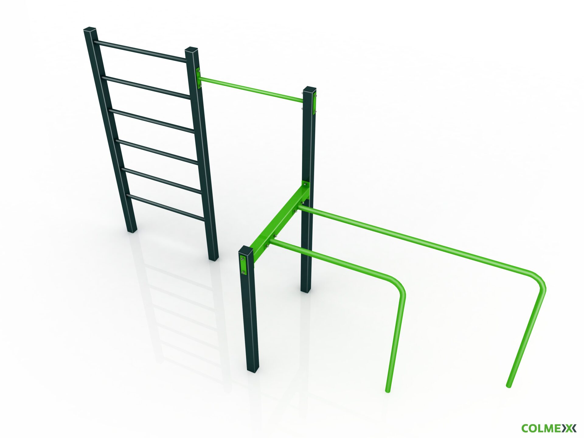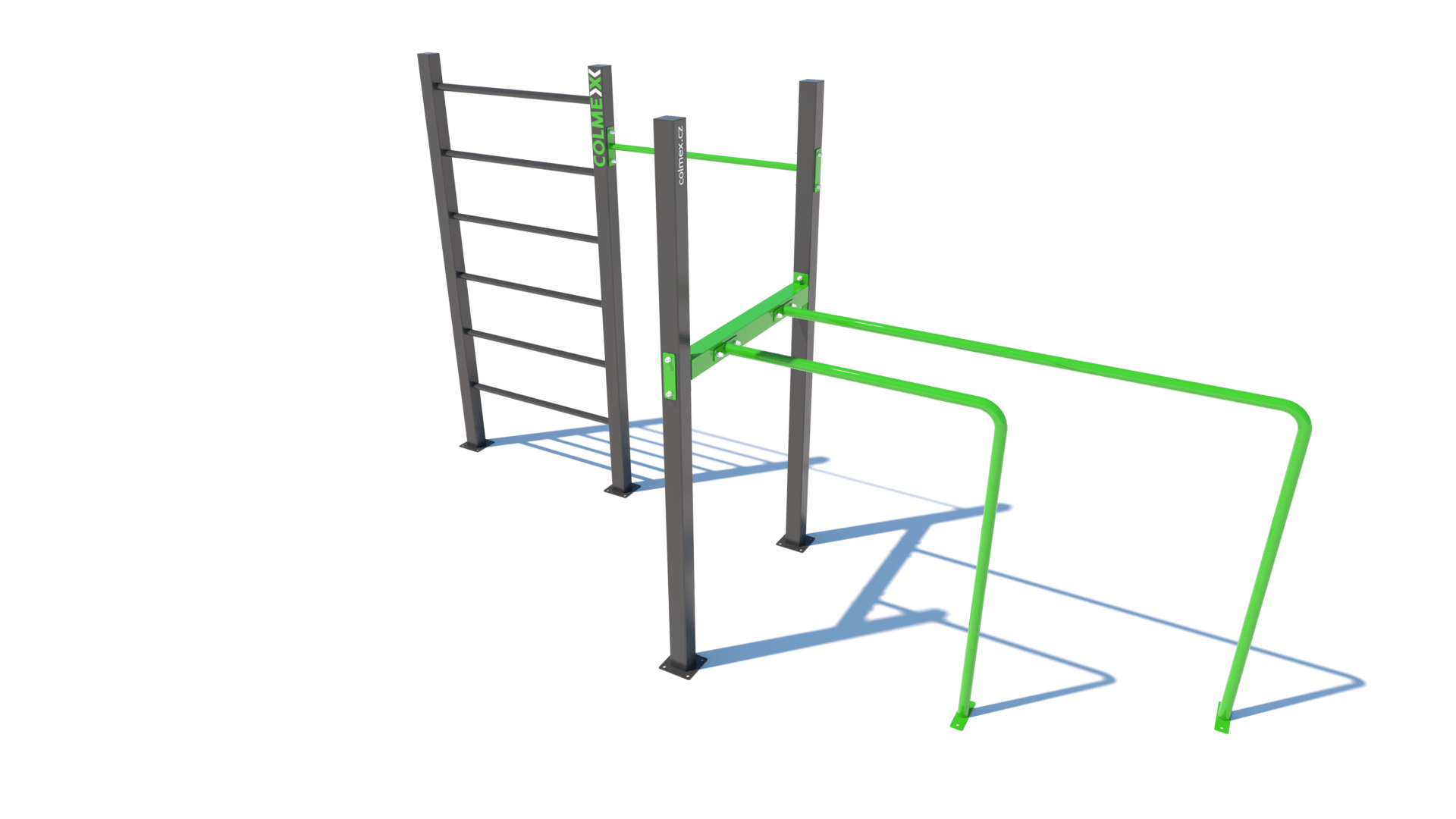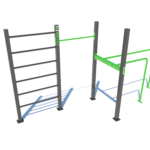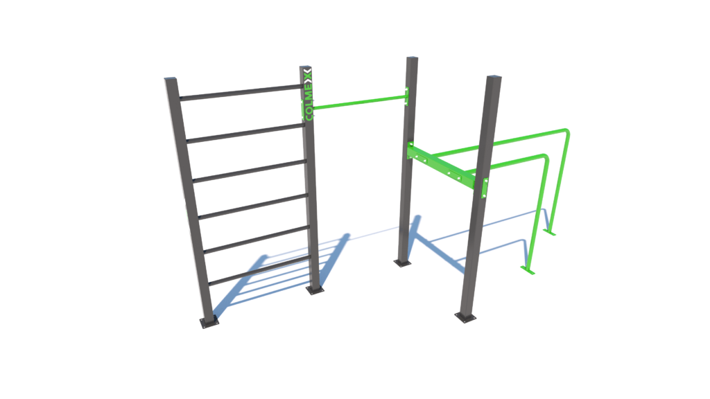 Poznámka: Základní sestava obsahuje následující workoutové segmenty: jednoduchou hrazdu, žebřiny a dvojitá bradla. Další modifikace této sestavy mohou obsahovat prvky spletence, kruhů, multifunkce (slouží pro zavěšení kruhů, systému TRX aspod.) či vodorovného žebříku.