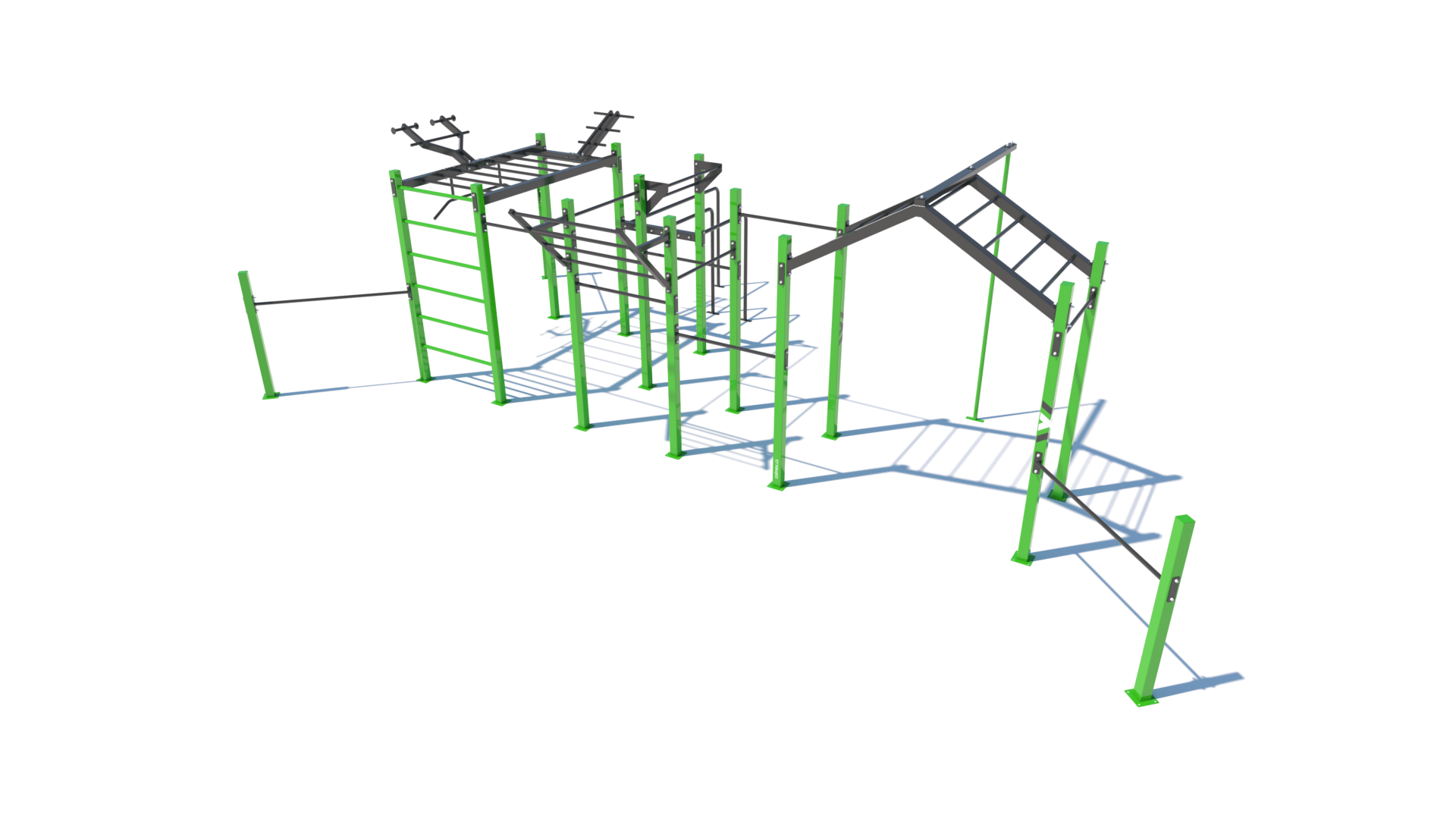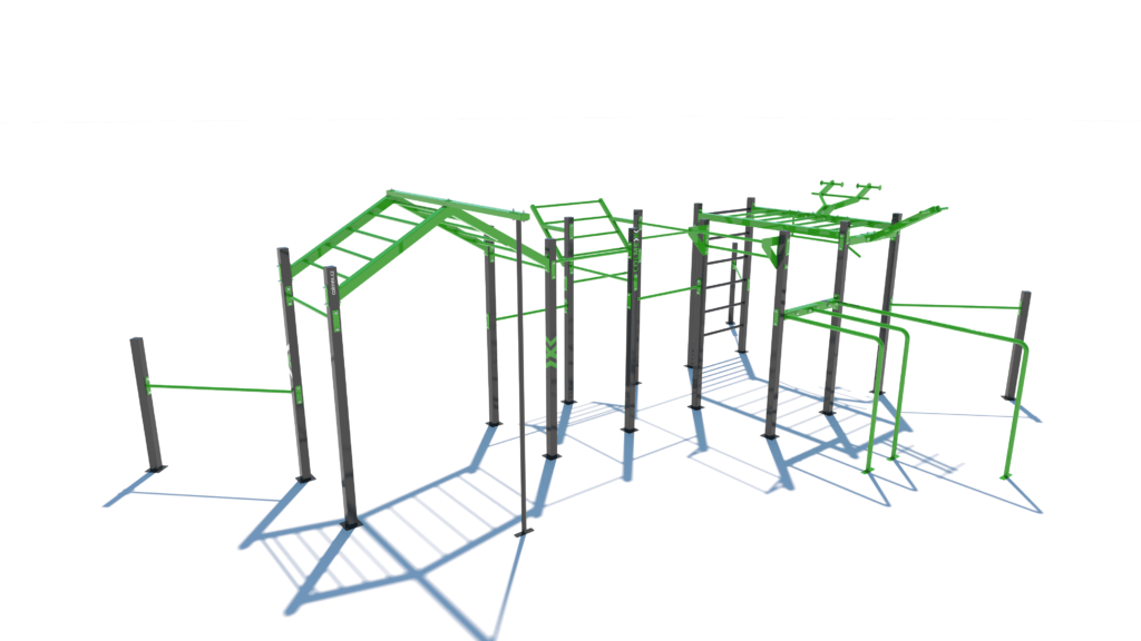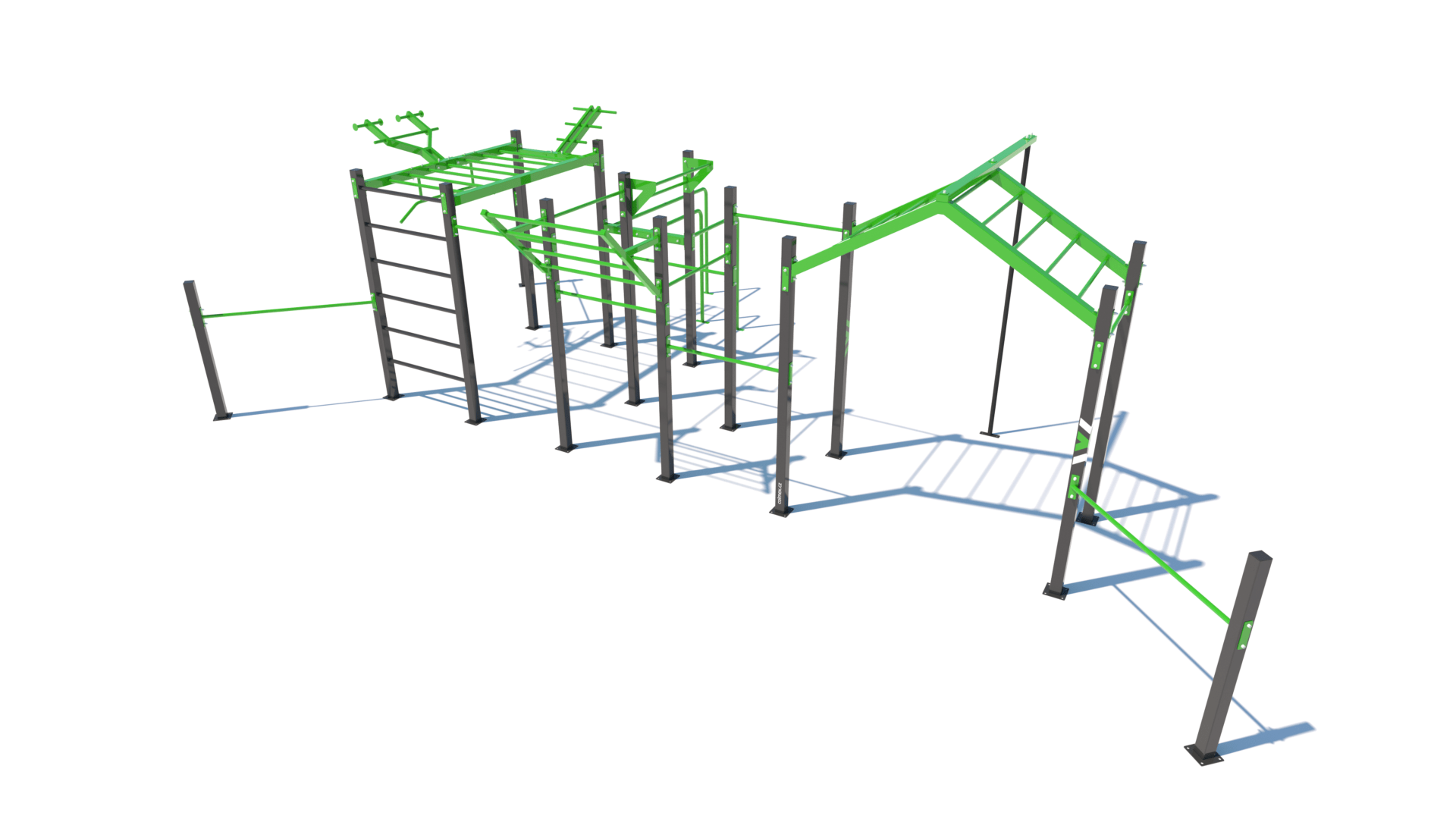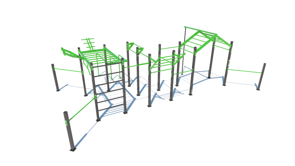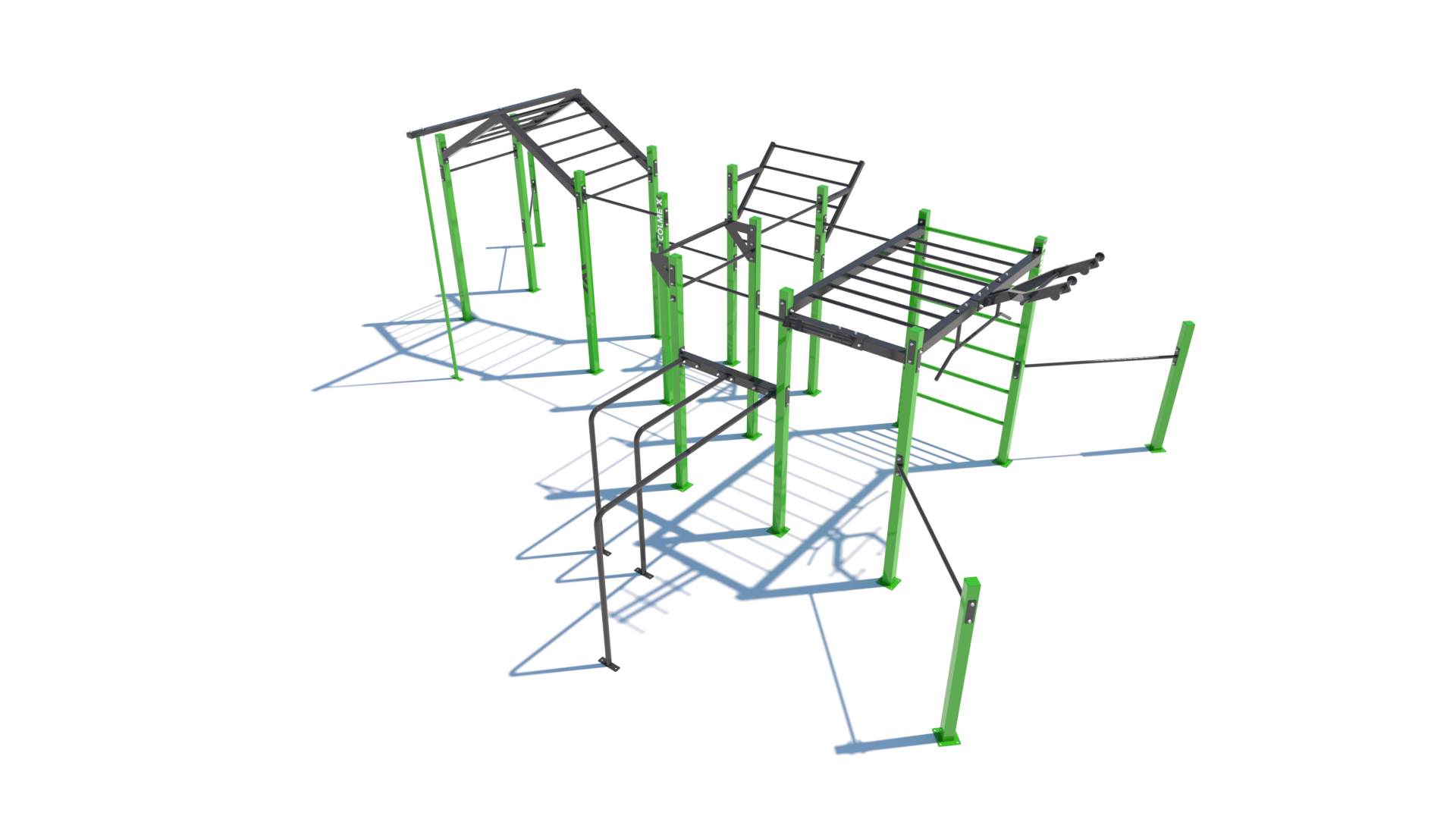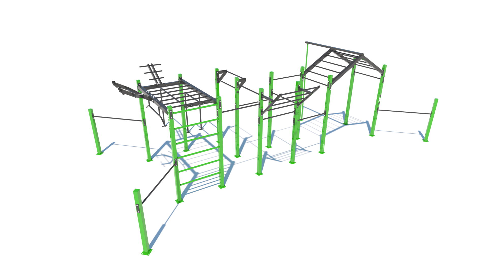 Poznámka: Sestava obsahuje následující workoutové segmenty: soustavu hrazd v různých výškách, boční hrazdy, hrazdu podvěšenou, hrazdu střední, vodorovný, svislý a šikmý žebřík, multifunkci (slouží pro zavěšení kruhů, systému TRX aspod.), závěs na kruhy, trojitá bradla a monkey bar "ačko".