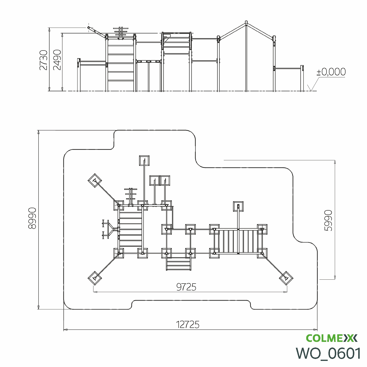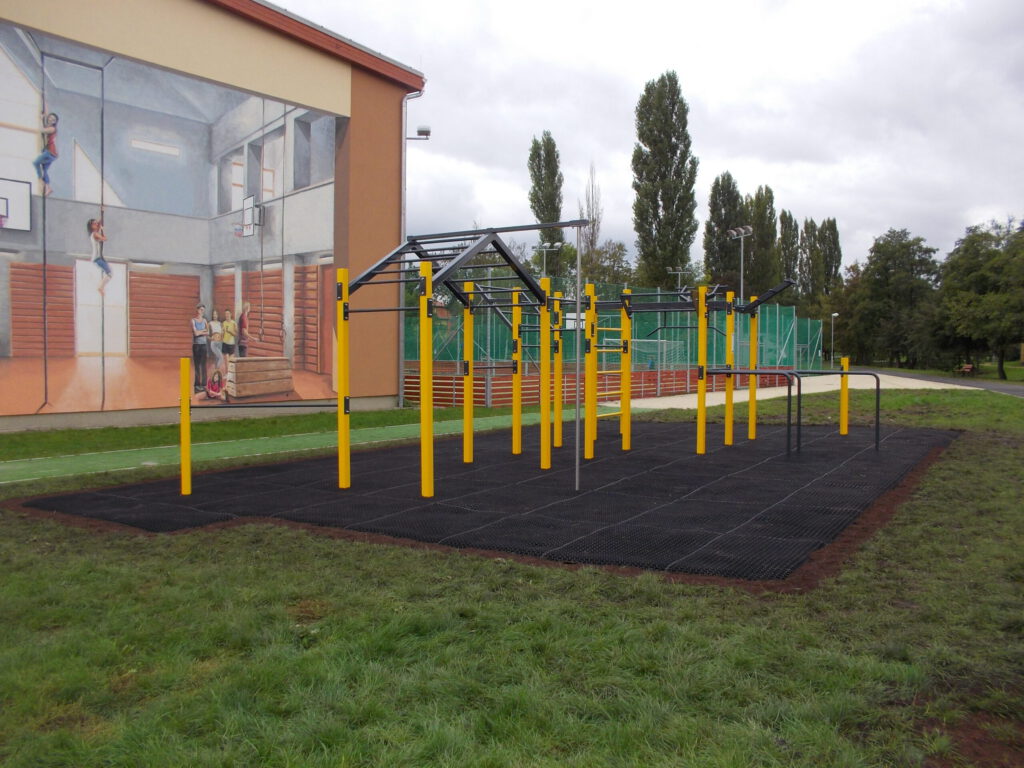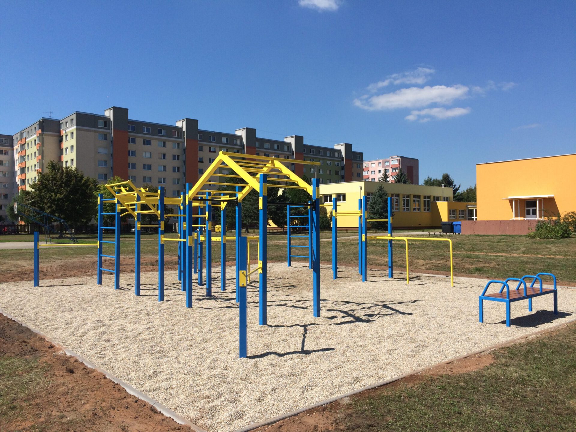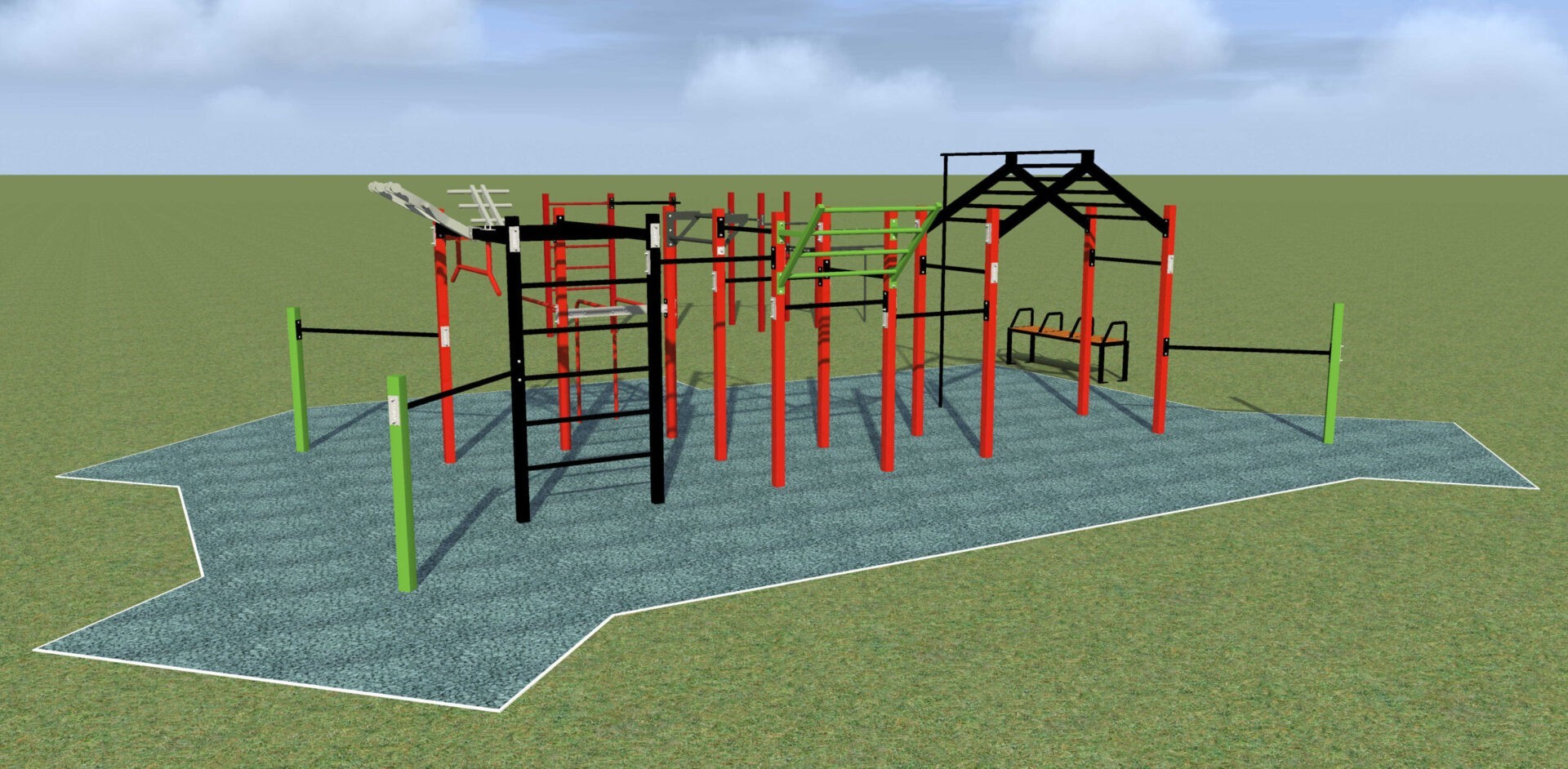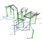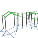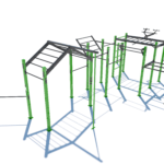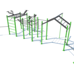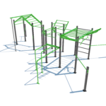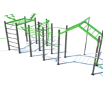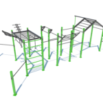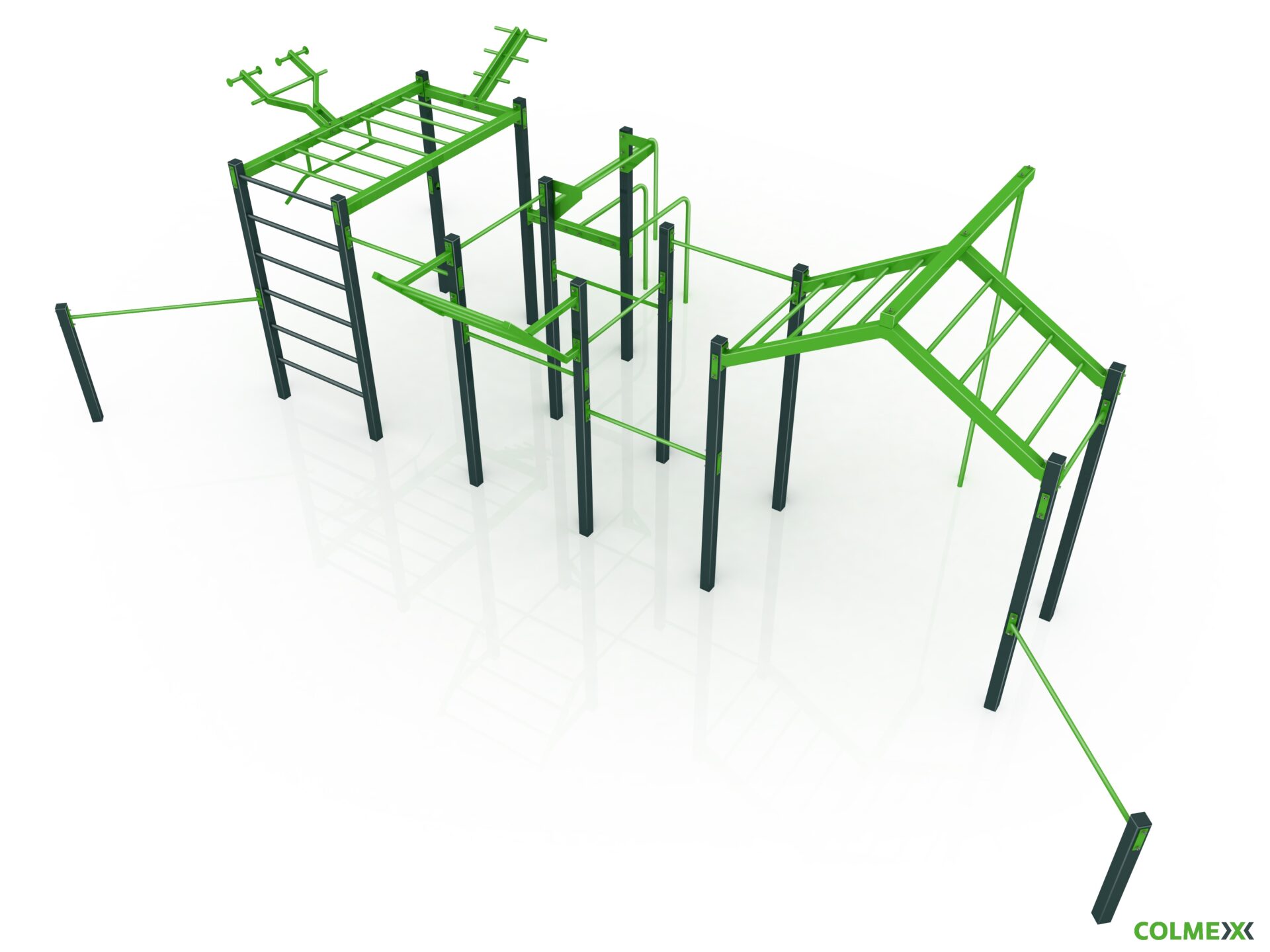 Poznámka: Sestava obsahuje následující workoutové segmenty: soustavu hrazd v různých výškách, boční hrazdy, hrazdu podvěšenou, hrazdu střední, vodorovný, svislý a šikmý žebřík, multifunkci (slouží pro zavěšení kruhů, systému TRX aspod.), závěs na kruhy, trojitá bradla a monkey bar "ačko".
