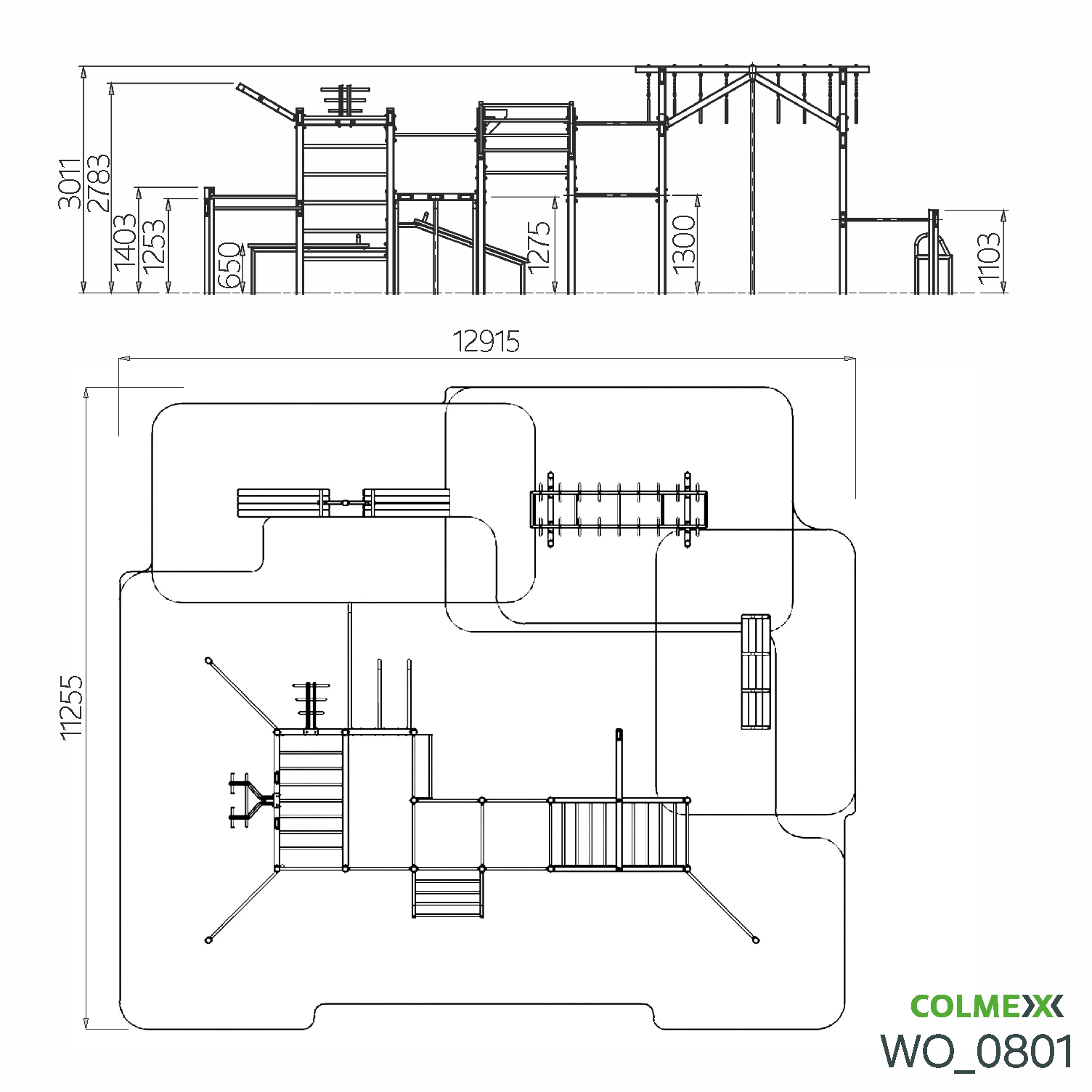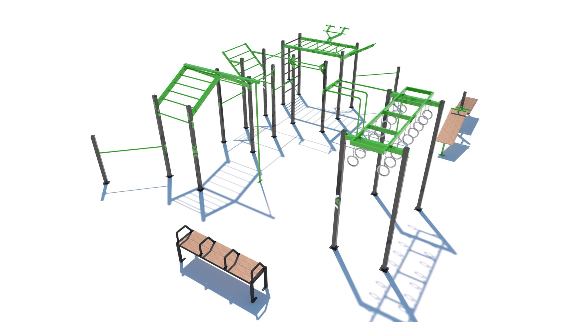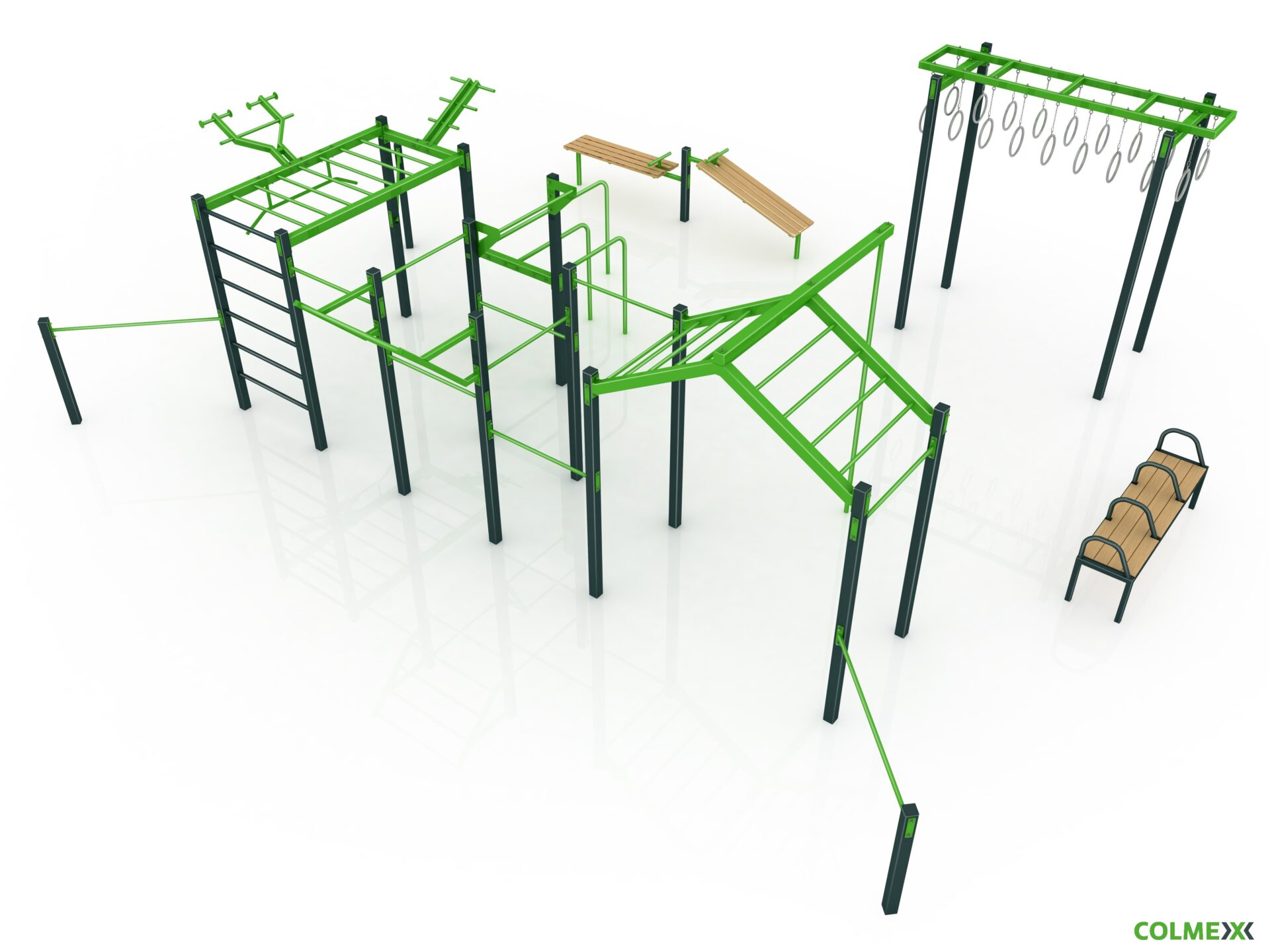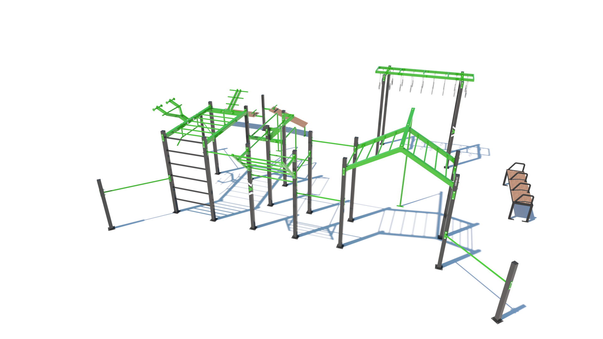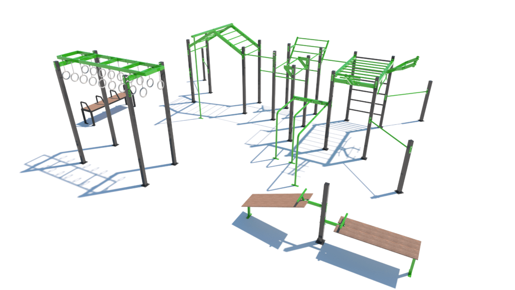 Poznámka: Park obsahuje segmenty základní sestavy Neraska: soustavu hrazd v různých výškách, boční hrazdy, hrazdu podvěšenou, hrazdu střední, vodorovný, svislý a šikmý žebřík, multifunkci (slouží pro zavěšení kruhů, systému TRX aspod.), závěs na kruhy, trojitá bradla a monkey bar "ačko" doplněnou o prvky Colorado rings, workoutovou lavici se stálky triple a workoutovou lavici na vzpřimování a sedy lehy.