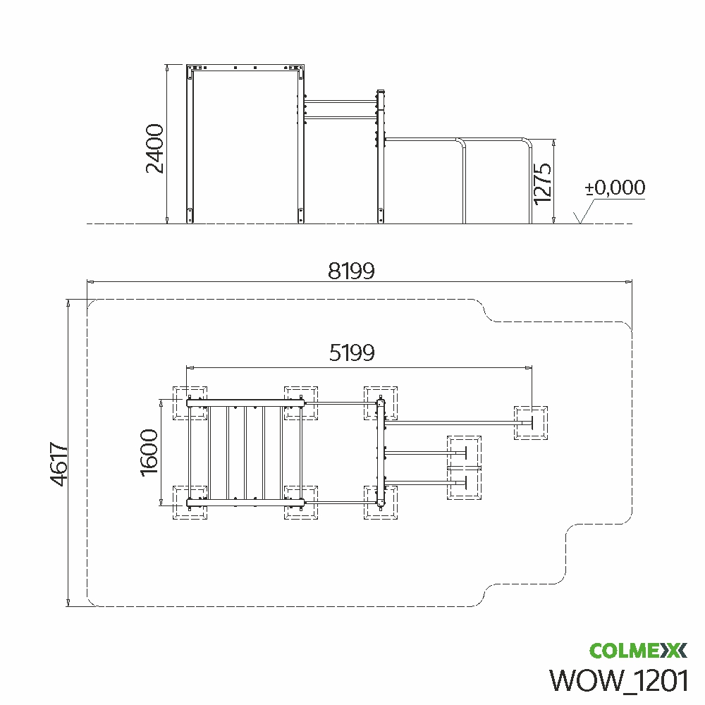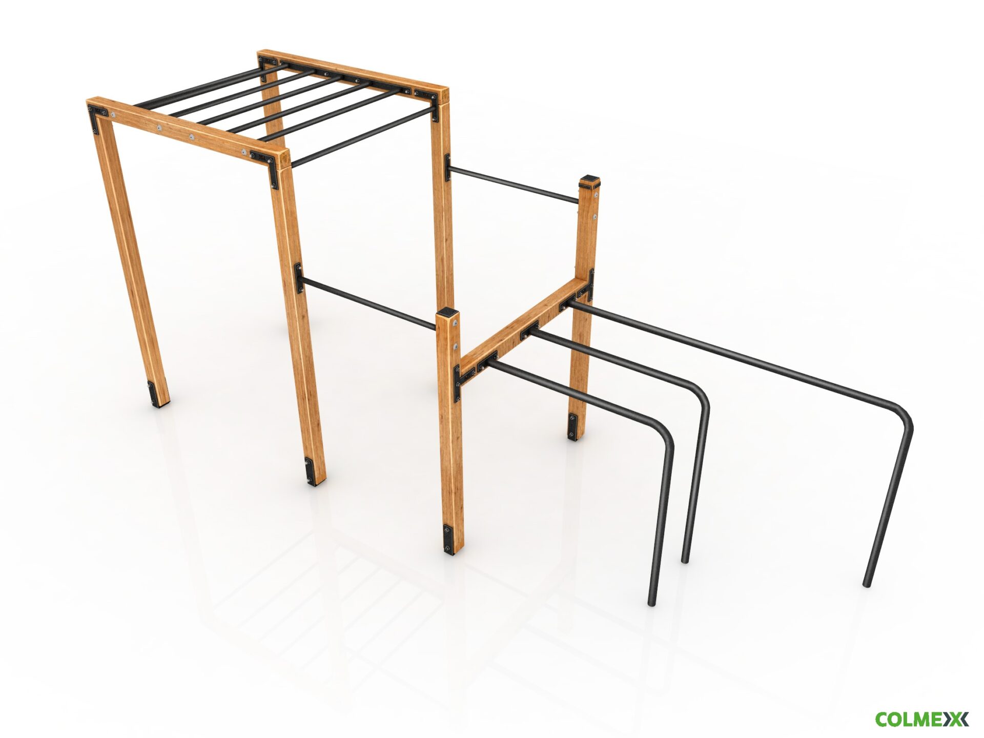 Poznámka: Sestava obsahuje následující workoutové segmenty: jednoduchou hrazdu S a L, vodorovný žebřík a trojitá bradla. Další modifikace této sestavy mohou obsahovat prvky kruhů, multifunkce (slouží pro zavěšení kruhů, systému TRX aspod.) či svislého žebříku. Možnost objednání barvy i dle vlastní specifikace.