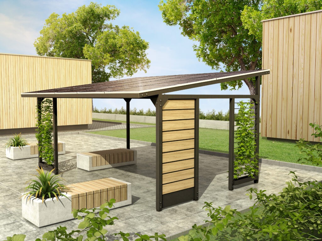 Solární panely nesluší jen střechám domů. Fotovoltaický altán využije sluneční energii nad zastřešenou venkovní posilovnou, školní zahradní dílnou nebo stáním pro auta.