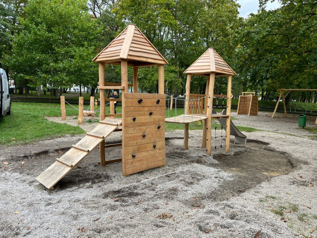 Dominantou hřiště je impozantní sestava se dvěma věžemi a skluzavkou, která vybízí děti k objevování a zapojuje jejich fantazii. Všechny prvky byly navrženy s důrazem na bezpečnost, funkčnost a estetiku, která citlivě zapadá do přírodního prostředí parku.