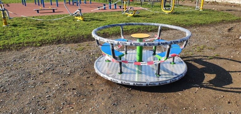 Děti si tu mohou zadovádět jak na tomto kolotoči, tak i na houpačce a na multifunkční sestavě se skluzavkou.