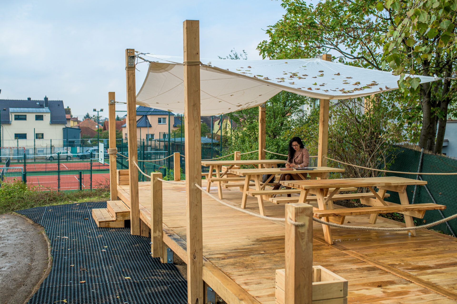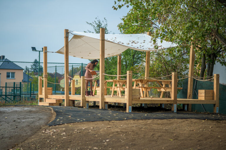 Hřiště se pyšní venkovní učebnou vhodnou nejen k výuce, ale využitelnou i jako venkovní kancelář, či pódium. Prostor lze dle potřeby měnit díky přenosnému mobiliáři.