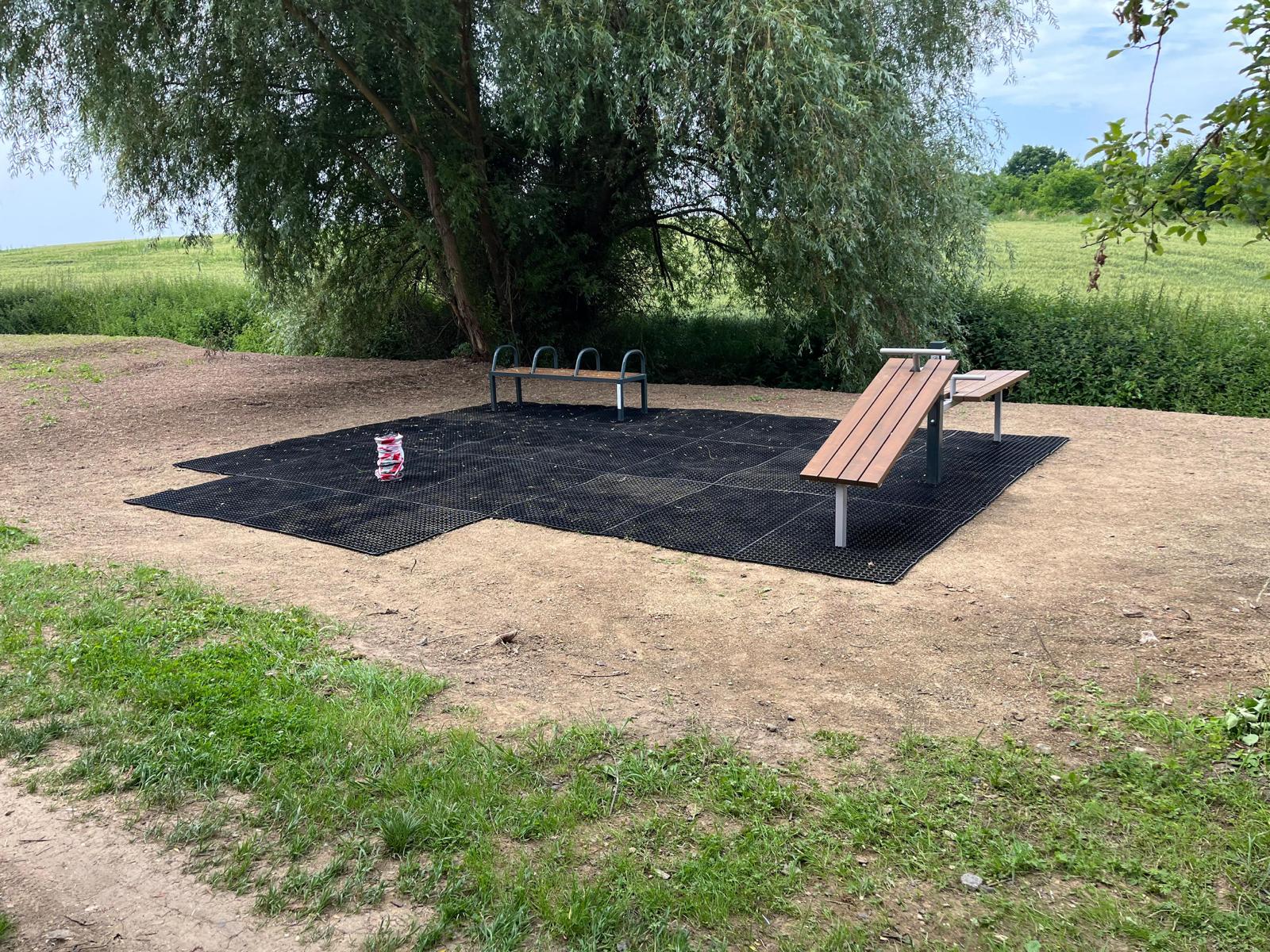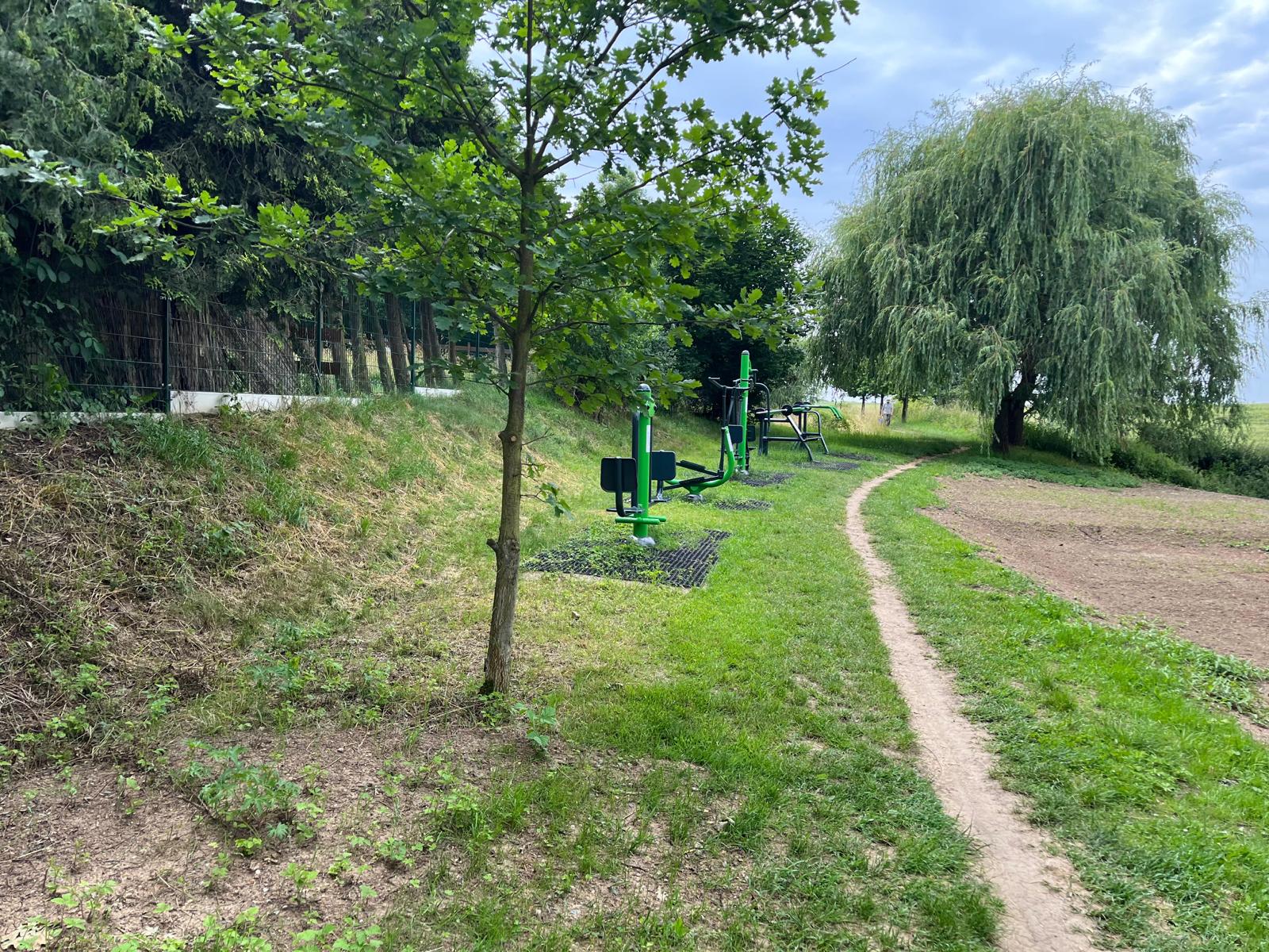 Dále je zde vzpřimování a sedy lehy, lavice, boxovací pytel, tři venkovní fitness stroje s barevné kombinaci antracit -zelená.