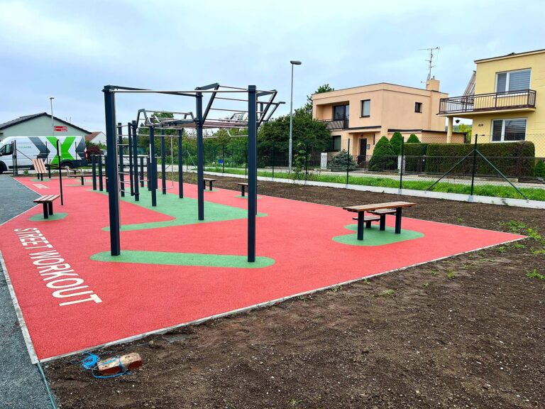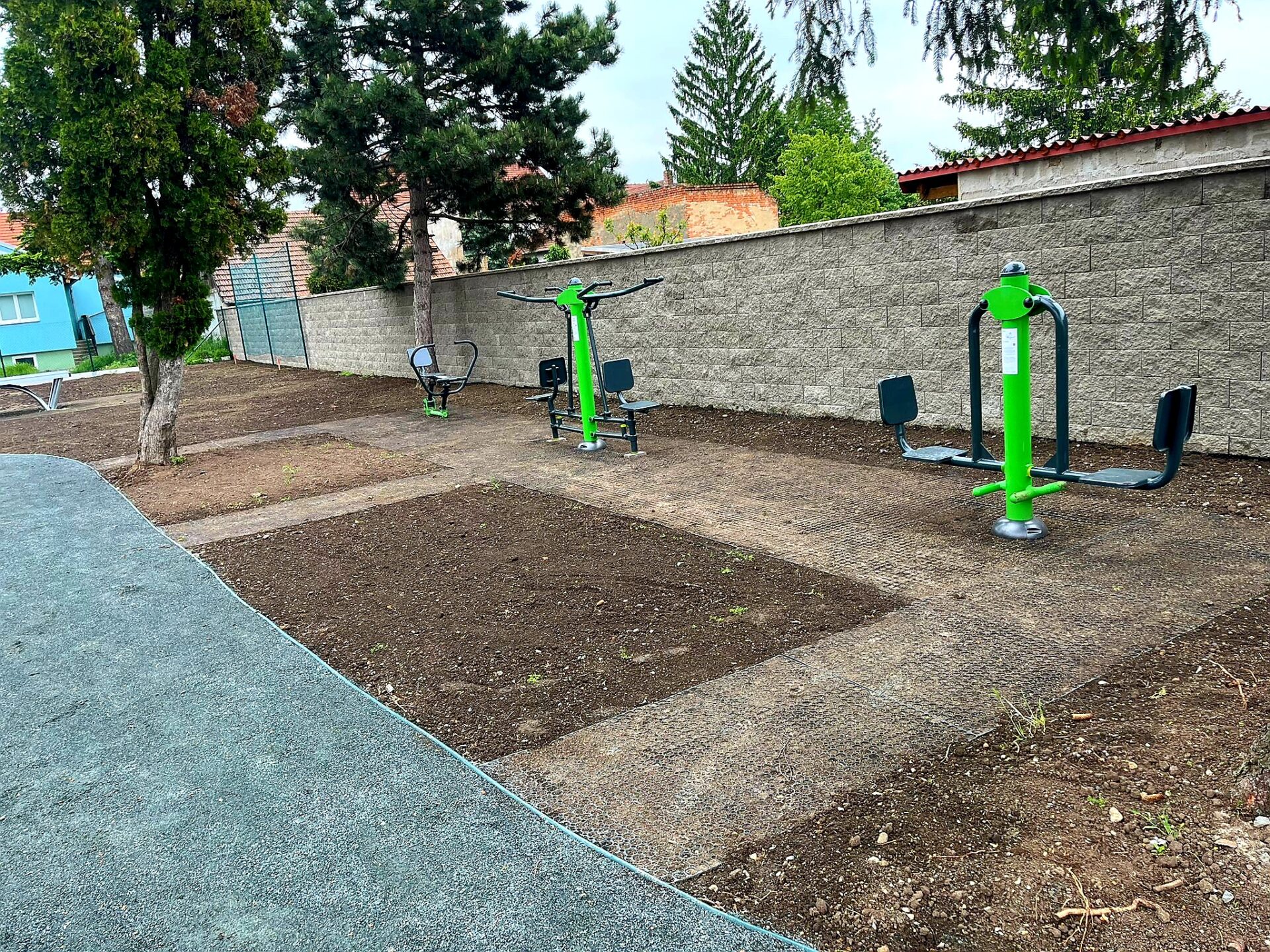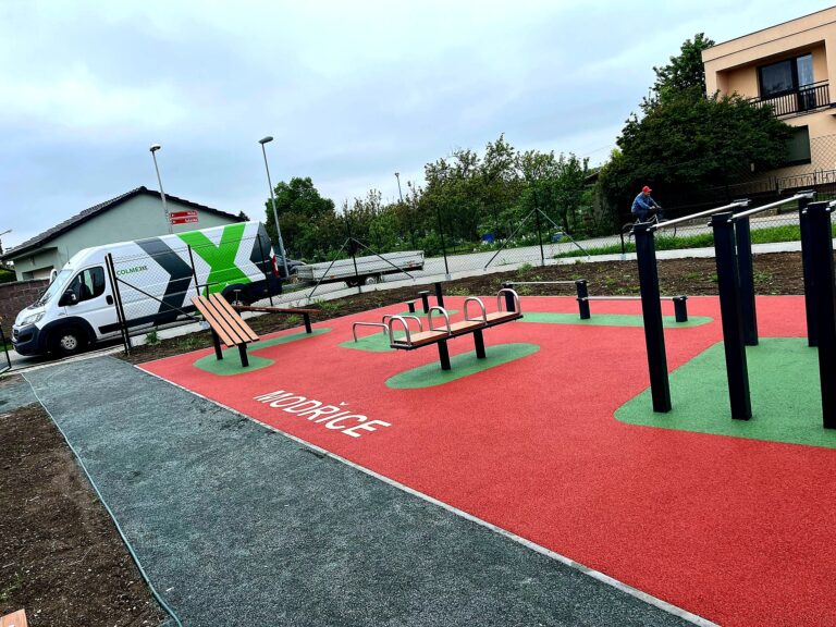 Na sportovišti v Brně v Modřicích si můžete zacvičit na venkovních fitness strojích v barvě antracit – zelená.