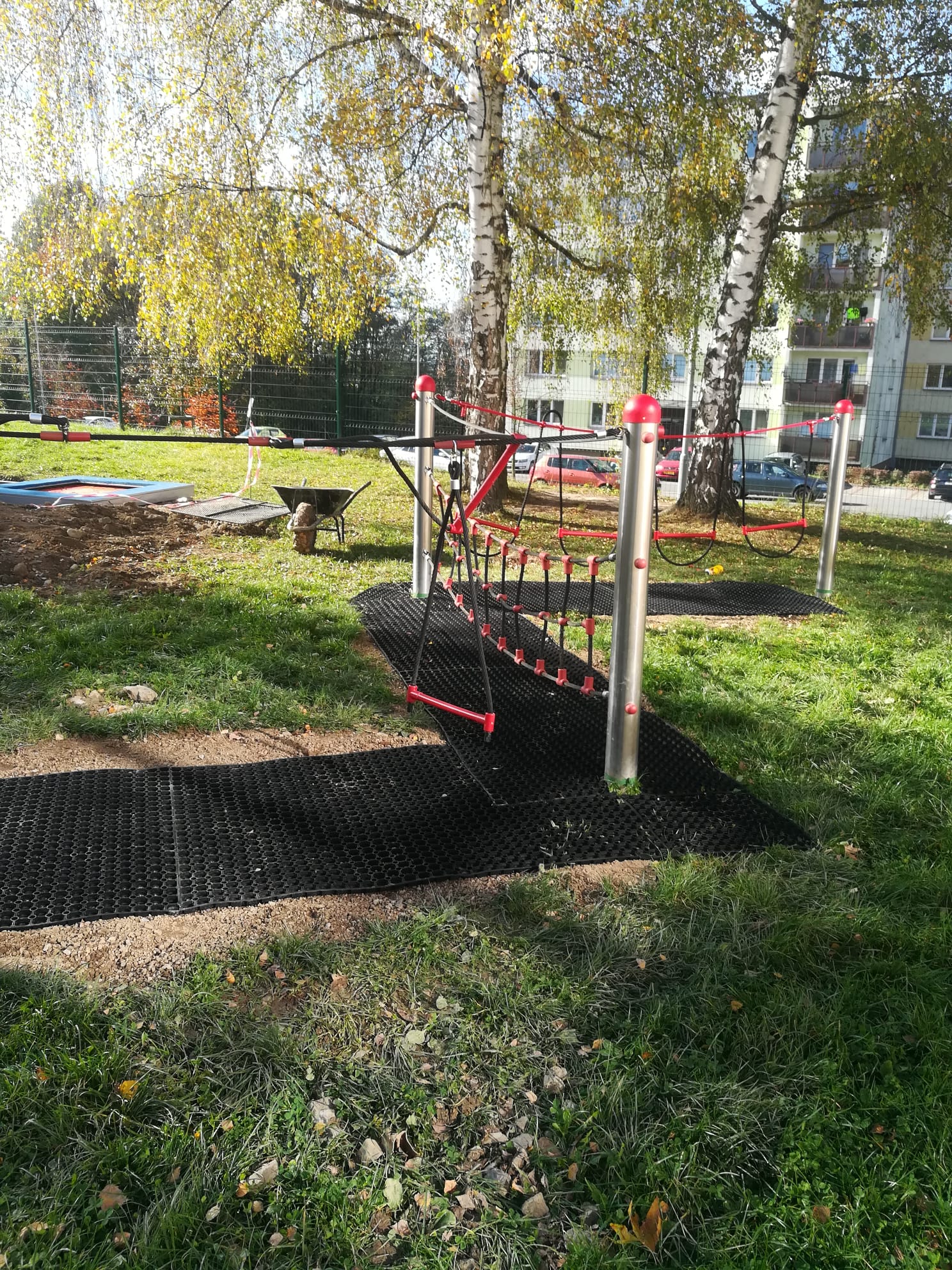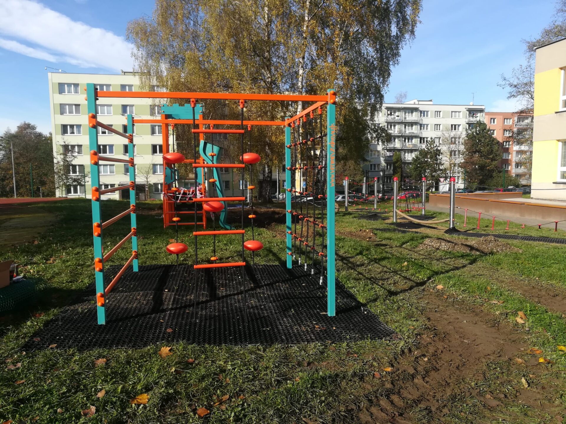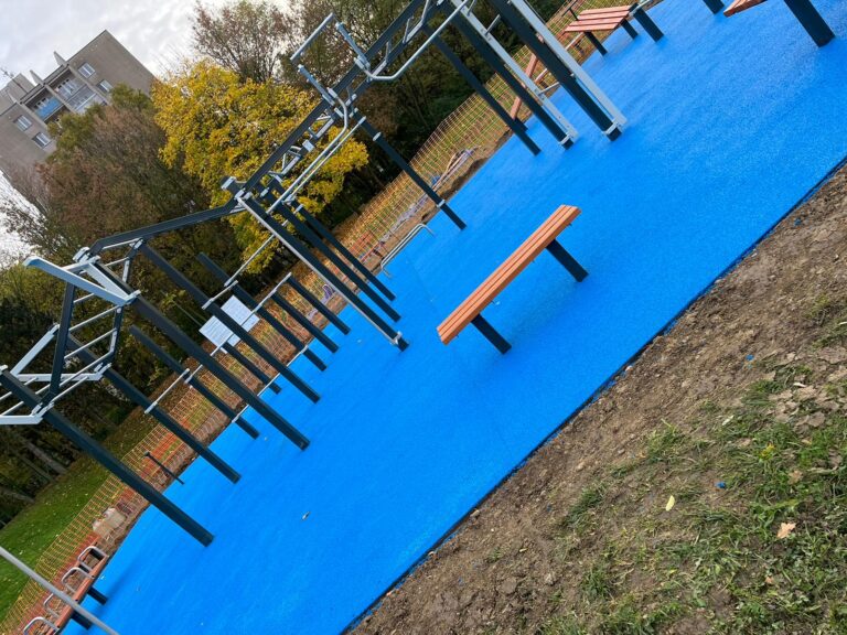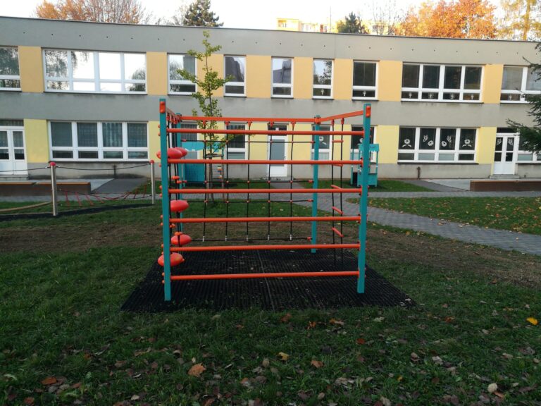 V areálu Základní školy Šeříkova 33 jsme realizovali krásně hřiště s dopadovou plochou v podobě modré lité pryže a A-typovou workoutovou sestavou.