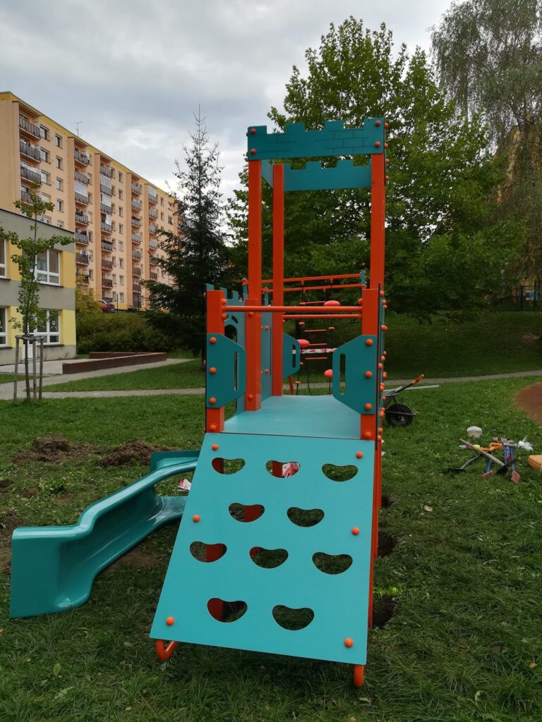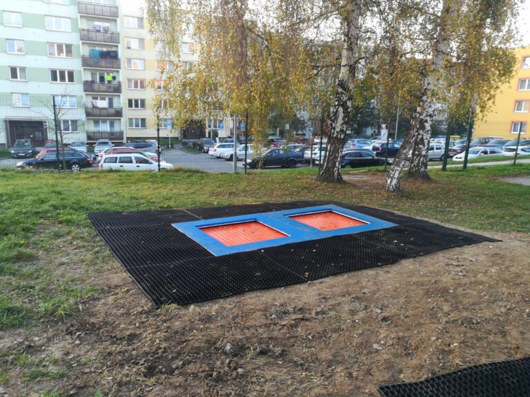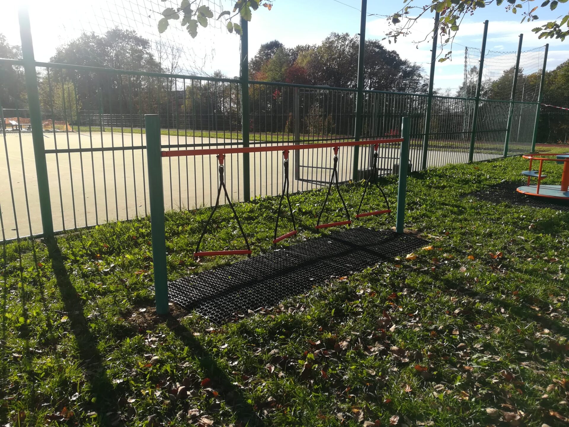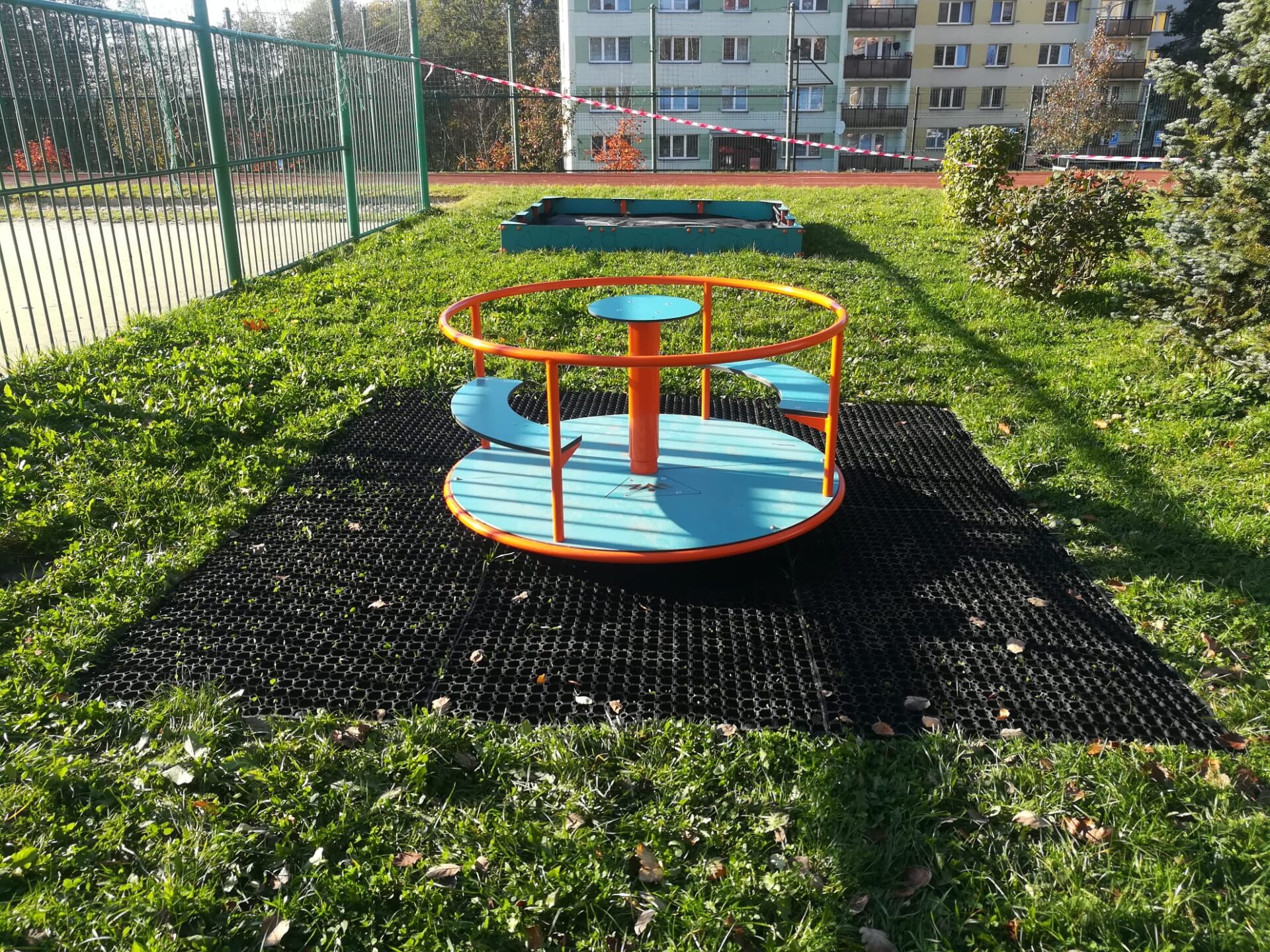 V areálu Základní školy Šeříkova 33 jsme realizovali krásně hřiště s dopadovou plochou v podobě modré lité pryže a A-typovou workoutovou sestavou.