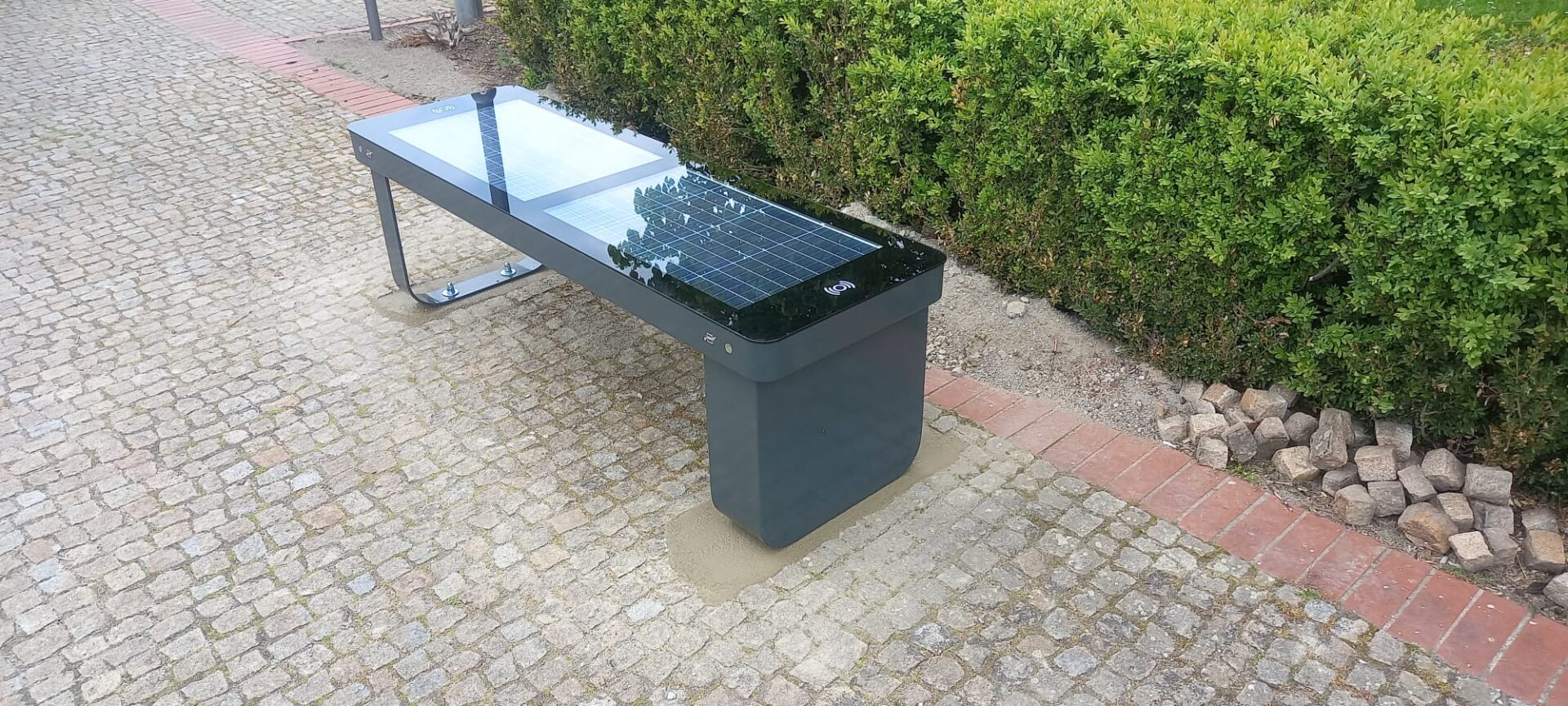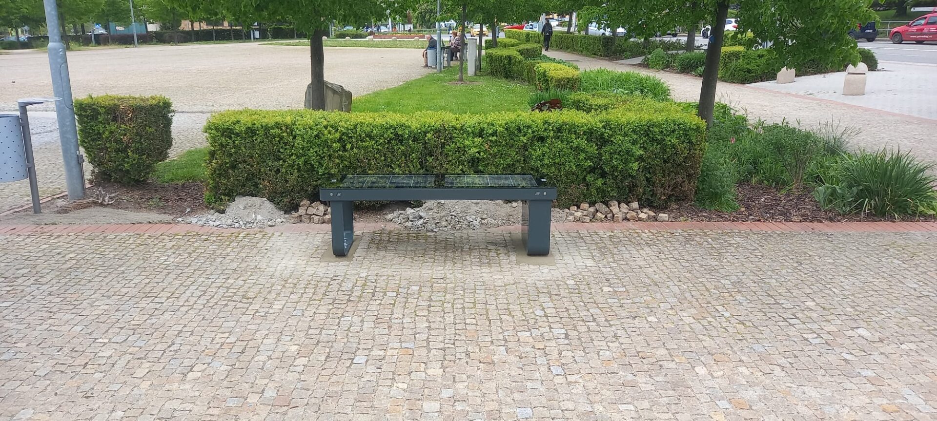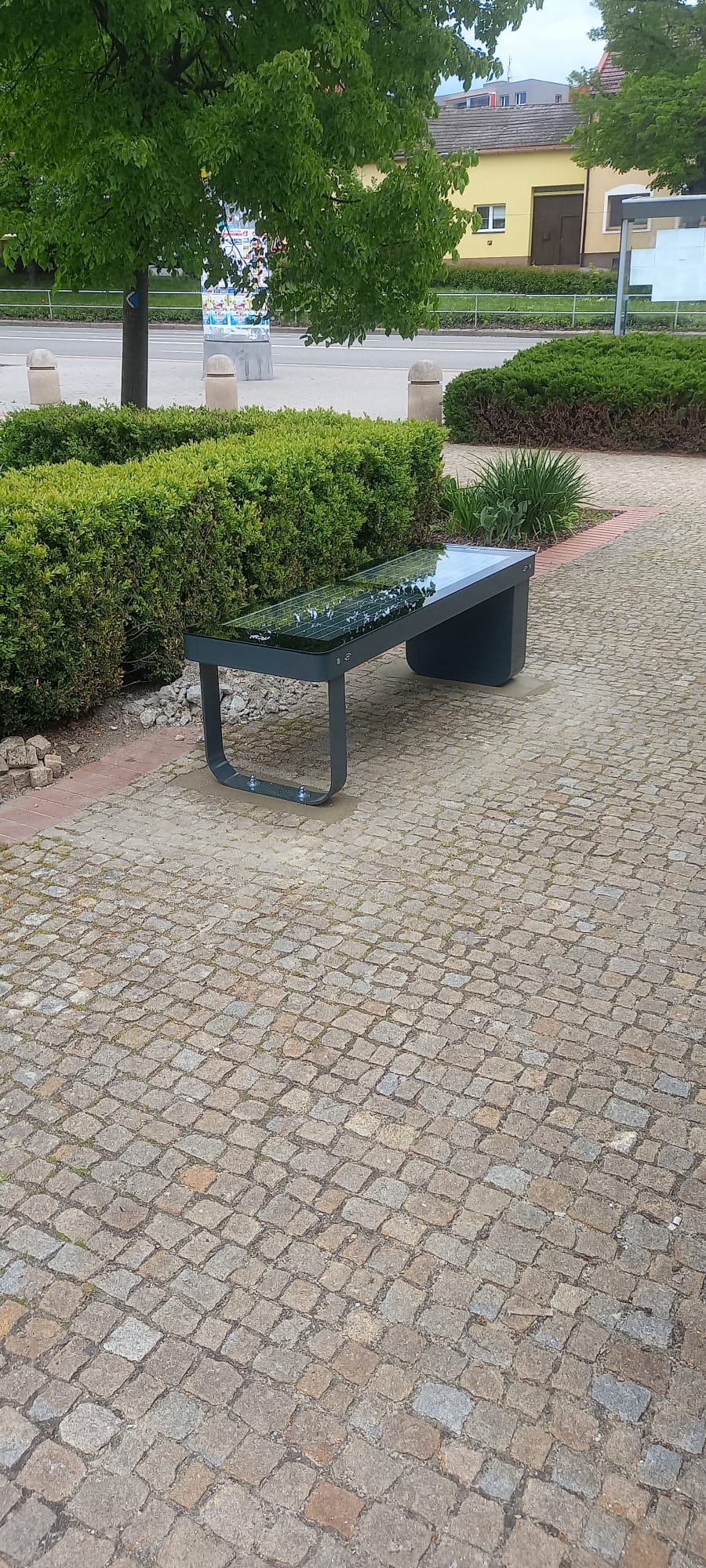 Solární lavičky – technicistní design, trendy vybavení chytrého města či obce, funkční městský mobiliář. Celo-ocelové provedení.