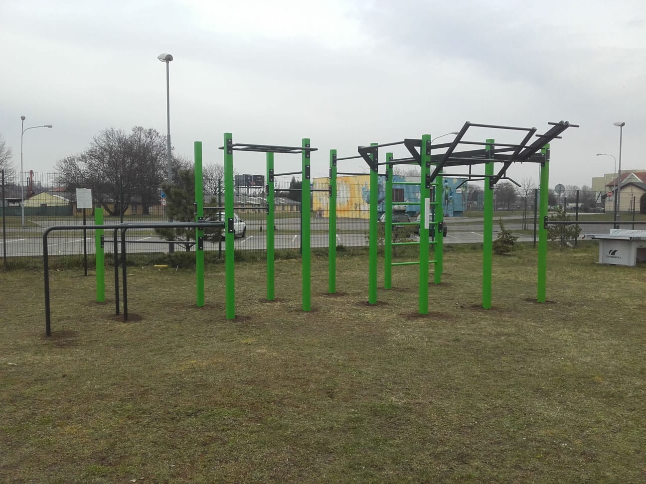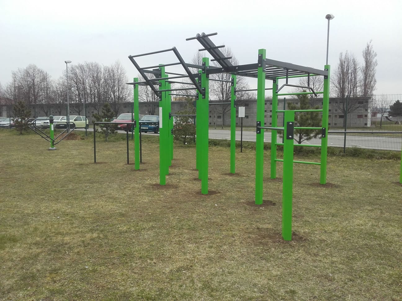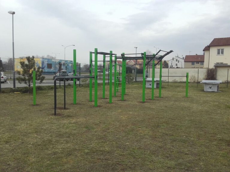 Workoutové hřiště se nachází v areálu školy Tuháčkova .