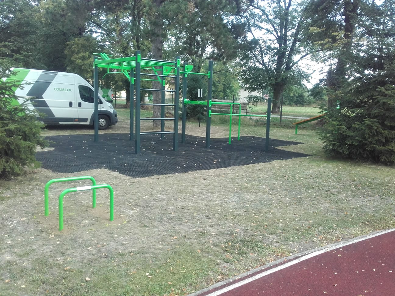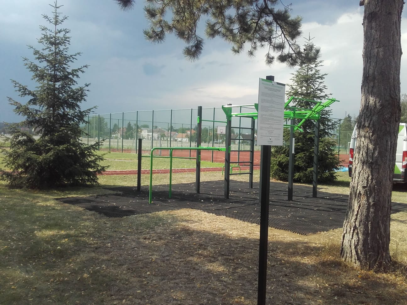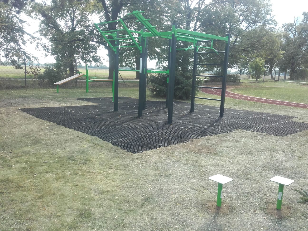 Na workoutovém hřišti v Dolních Beřkovicích najdete vedle workoutové sestavy cvičební prvky pro vzpřimování a sedy lehy, stálky a stepy.