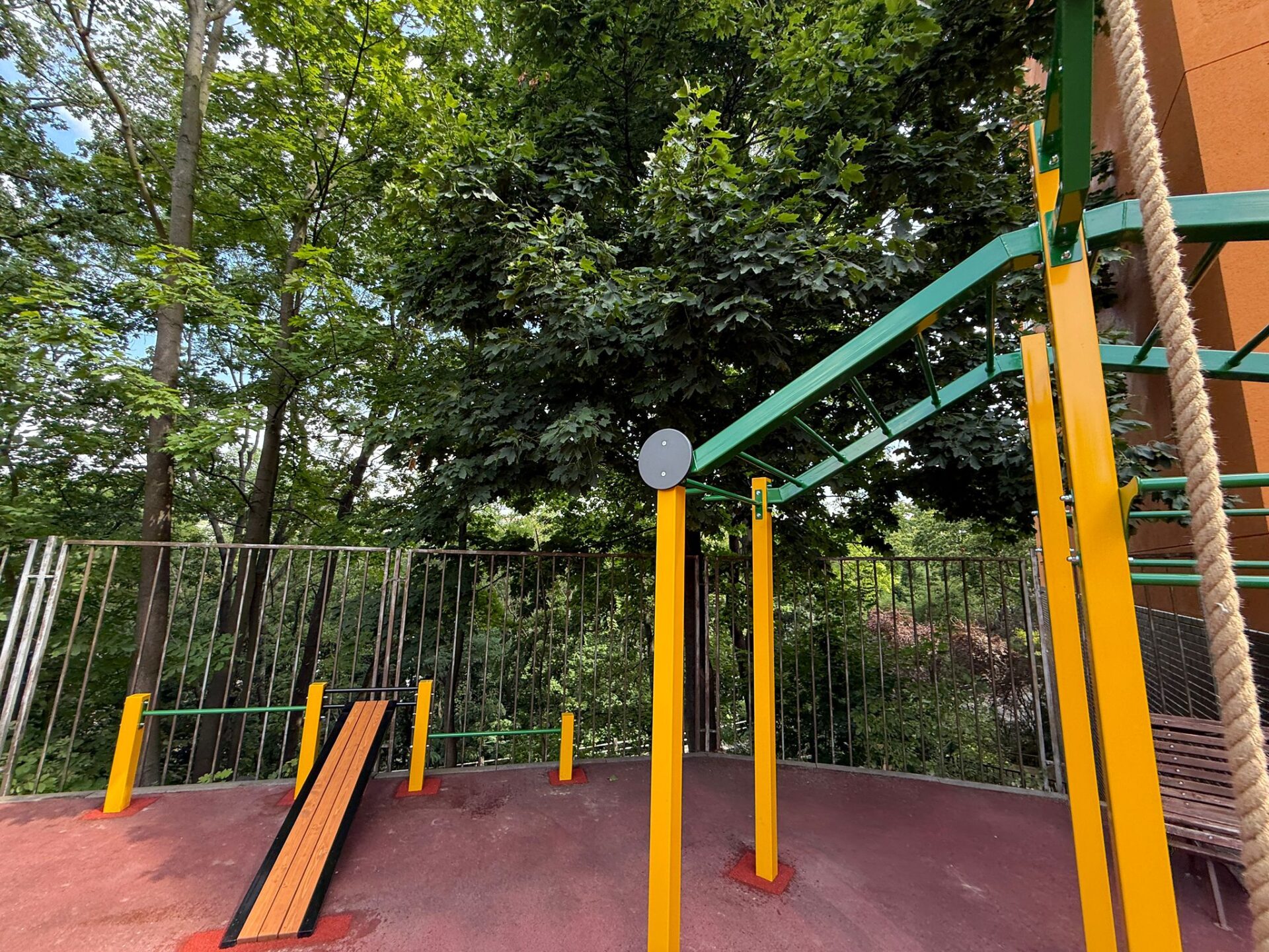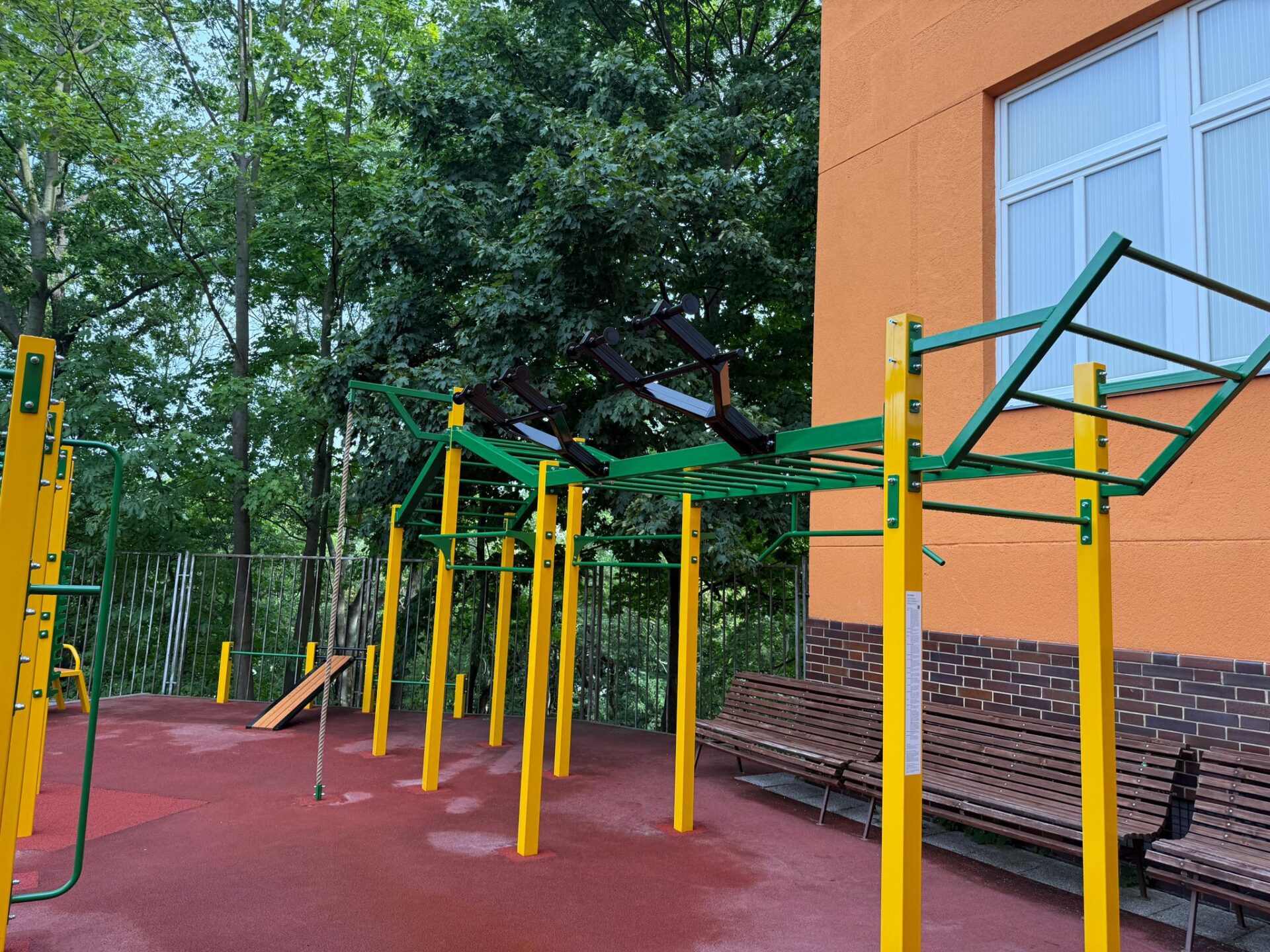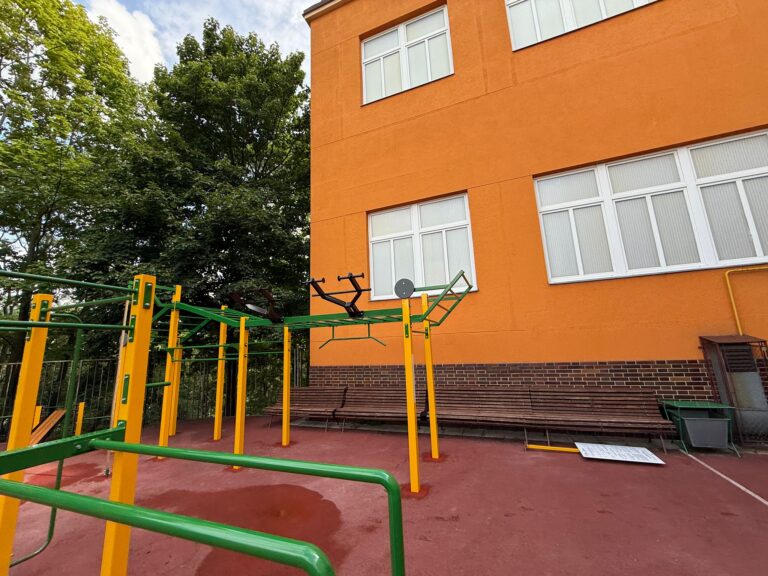 U Gymnázia Nad Kavalírkou na Praze 5 vyrostla street workoutová sestava na přání zákazníka. A-typ nabízí hrazdy, žebřiny, podvěšenou hrazdu i šikmý žebřík pro ručkování v různých výškách, dále pak madlo či závěs pro kruhy/trx, součástí sestavy jsou i bradla a sedy-lehy. Sestava tak poskytuje dokonalý prostor pro komplexní trénink, to vše na litém pryžovém povrchu pro pohodlné dopady.