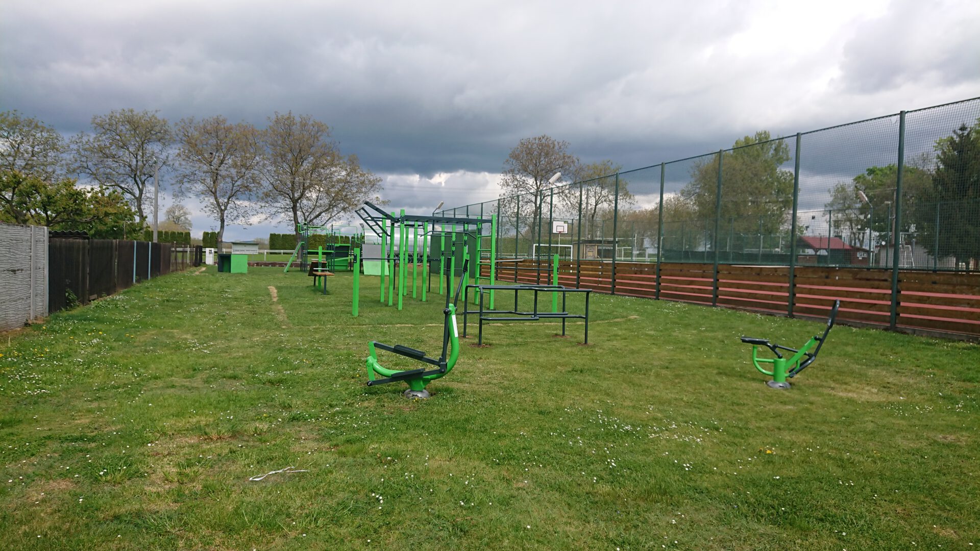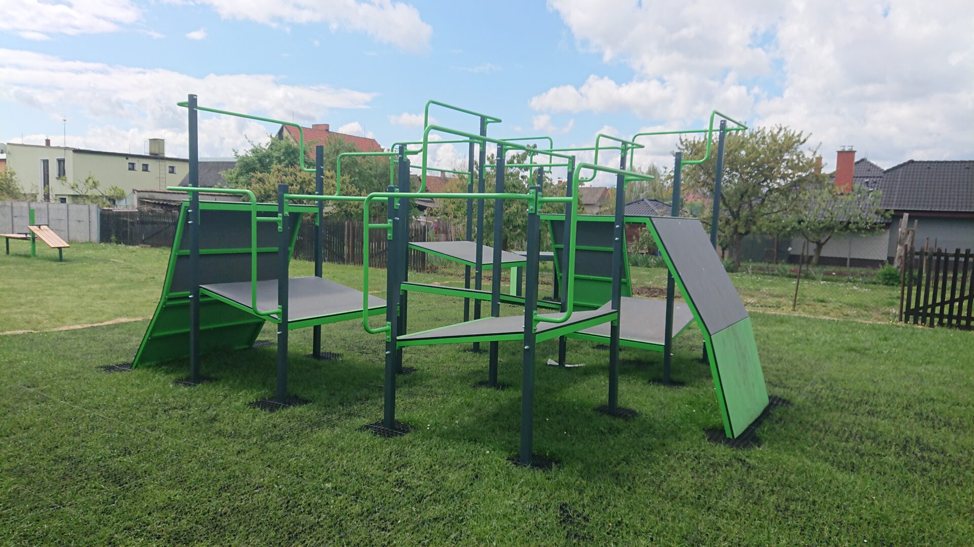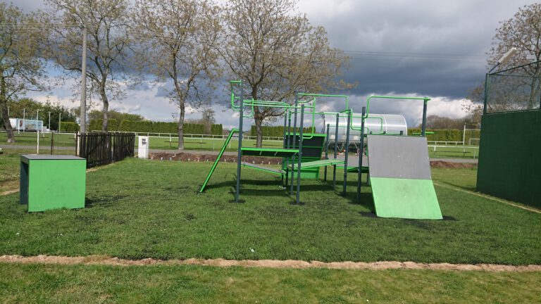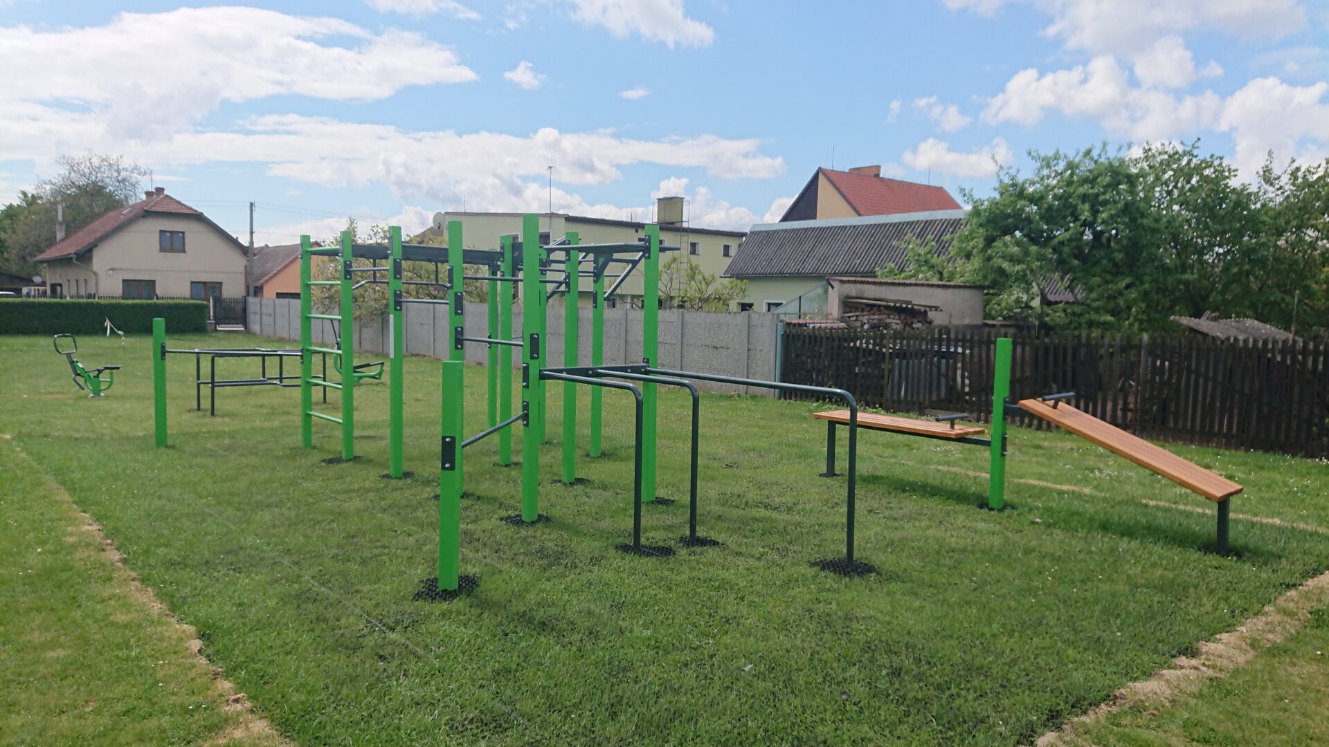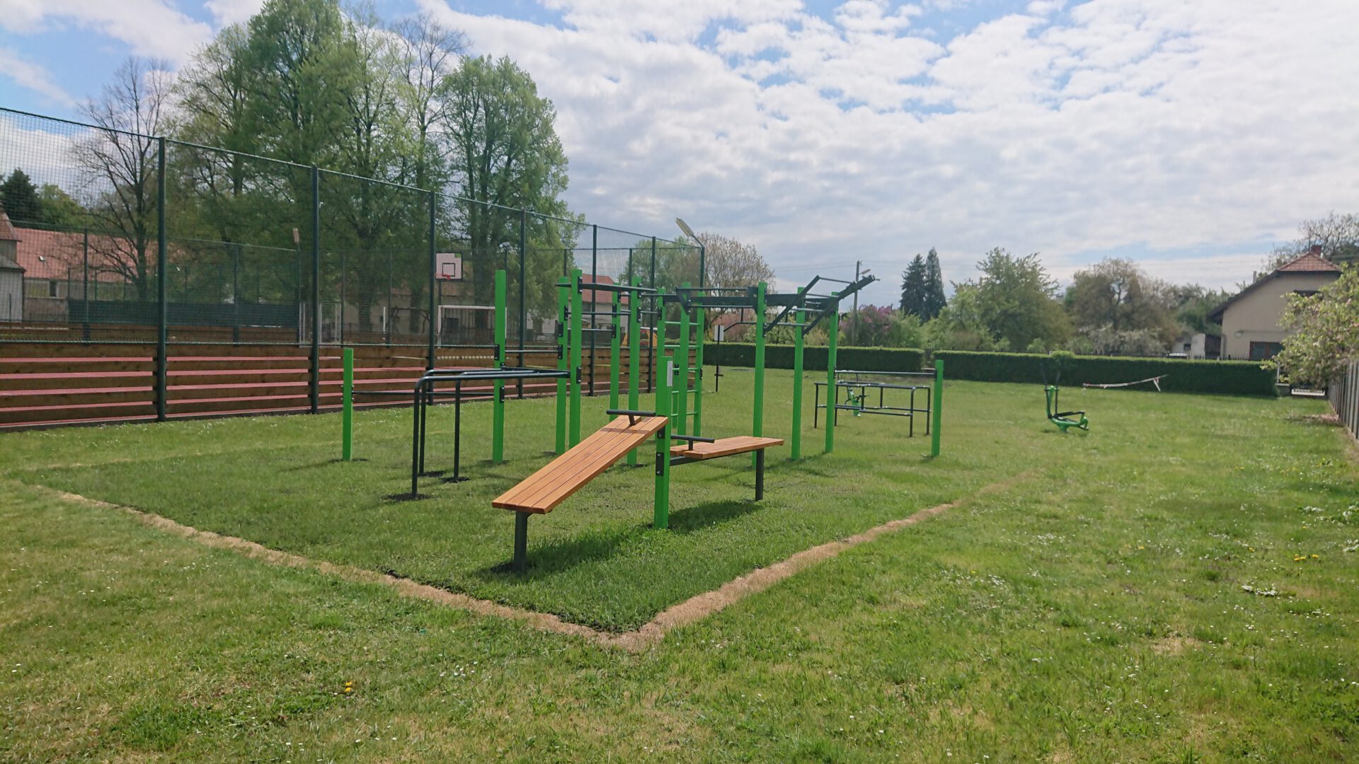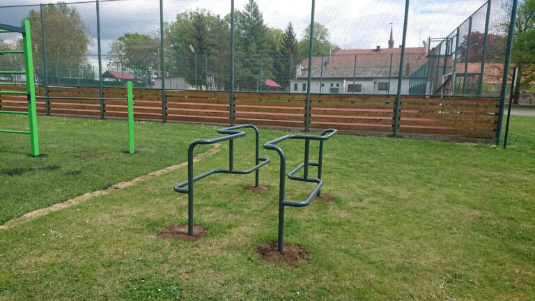 Víceúčelový venkovní fitness park se nachází na sportovišti poblíž fotbalového hřiště.