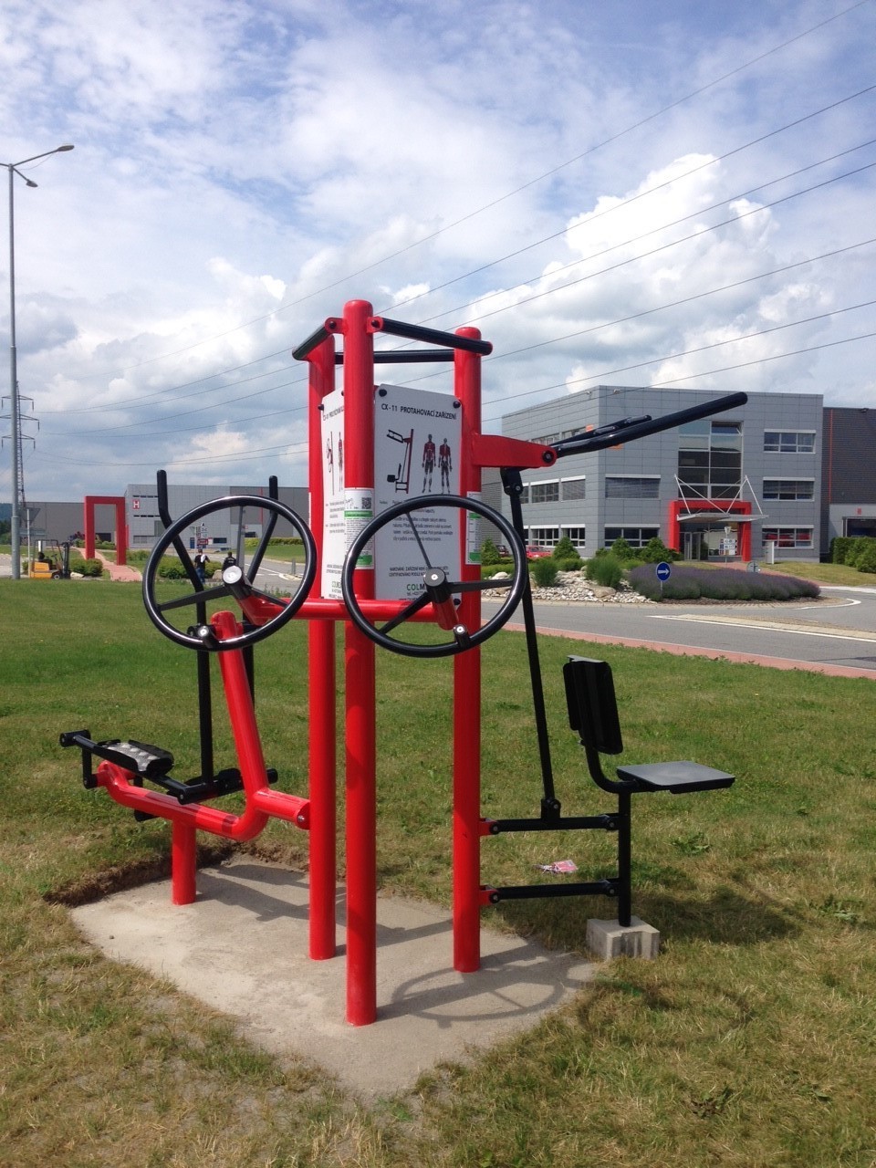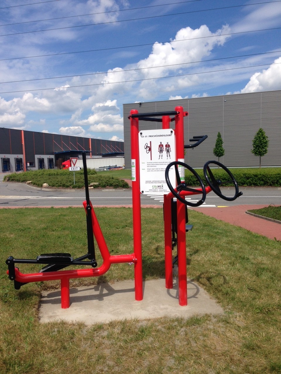 Trojkombinovaný venkovní fitness prvek se nachází v logistickém centru ve Stříteži.
