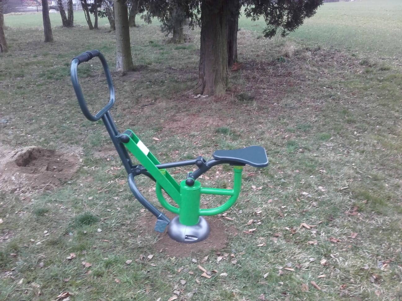 Venkovní fitness stroj se nachází v parku poblíž obecního úřadu.