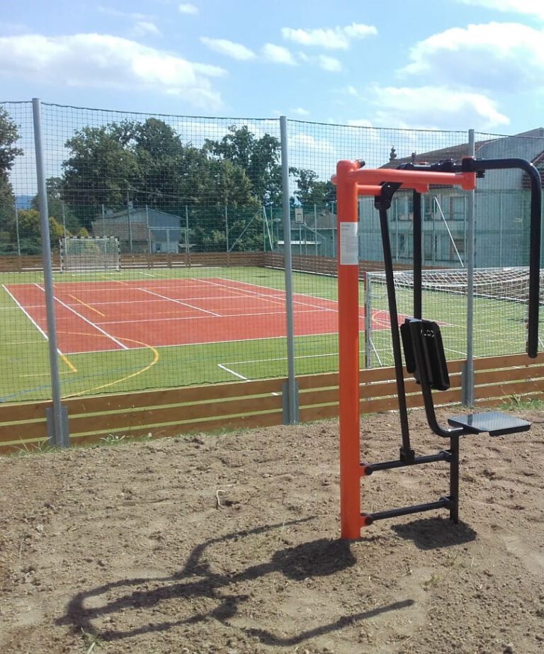 Venkovní fitness stroj, který se nachází u základní školy, slouží pro posilování svalů končetin, ke zlepšování koordinace těla a zvyšování kapacity srdce a plic.
