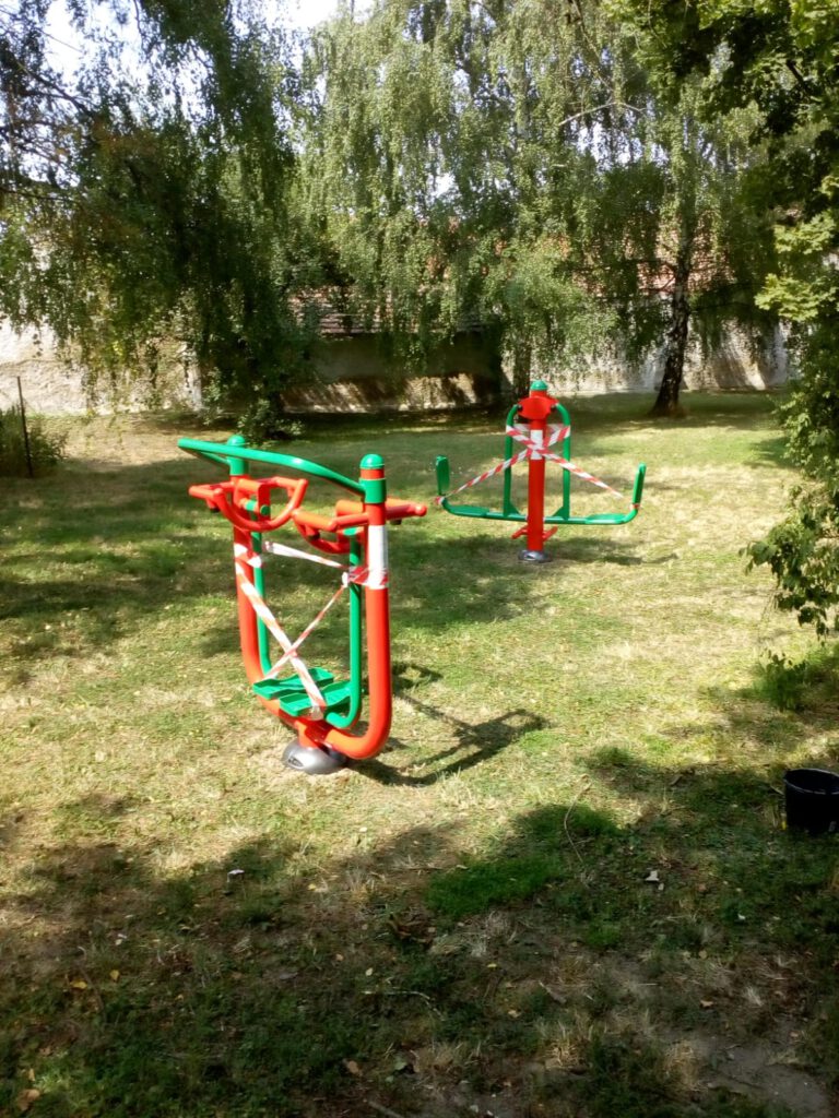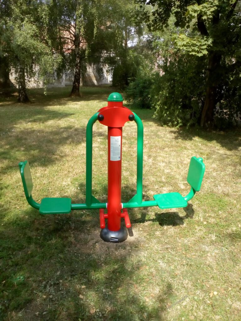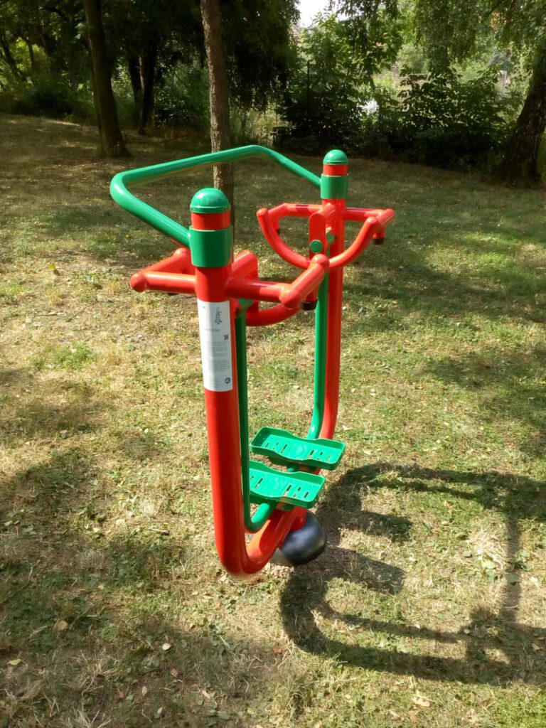 Venkovní fitness stroje v obci Ješín pro procvičování chůze a pro rozvoj a posilování svalů nohou.