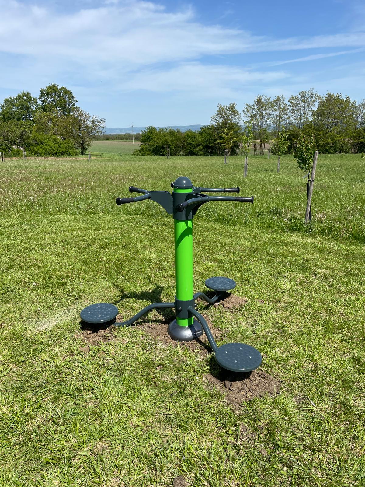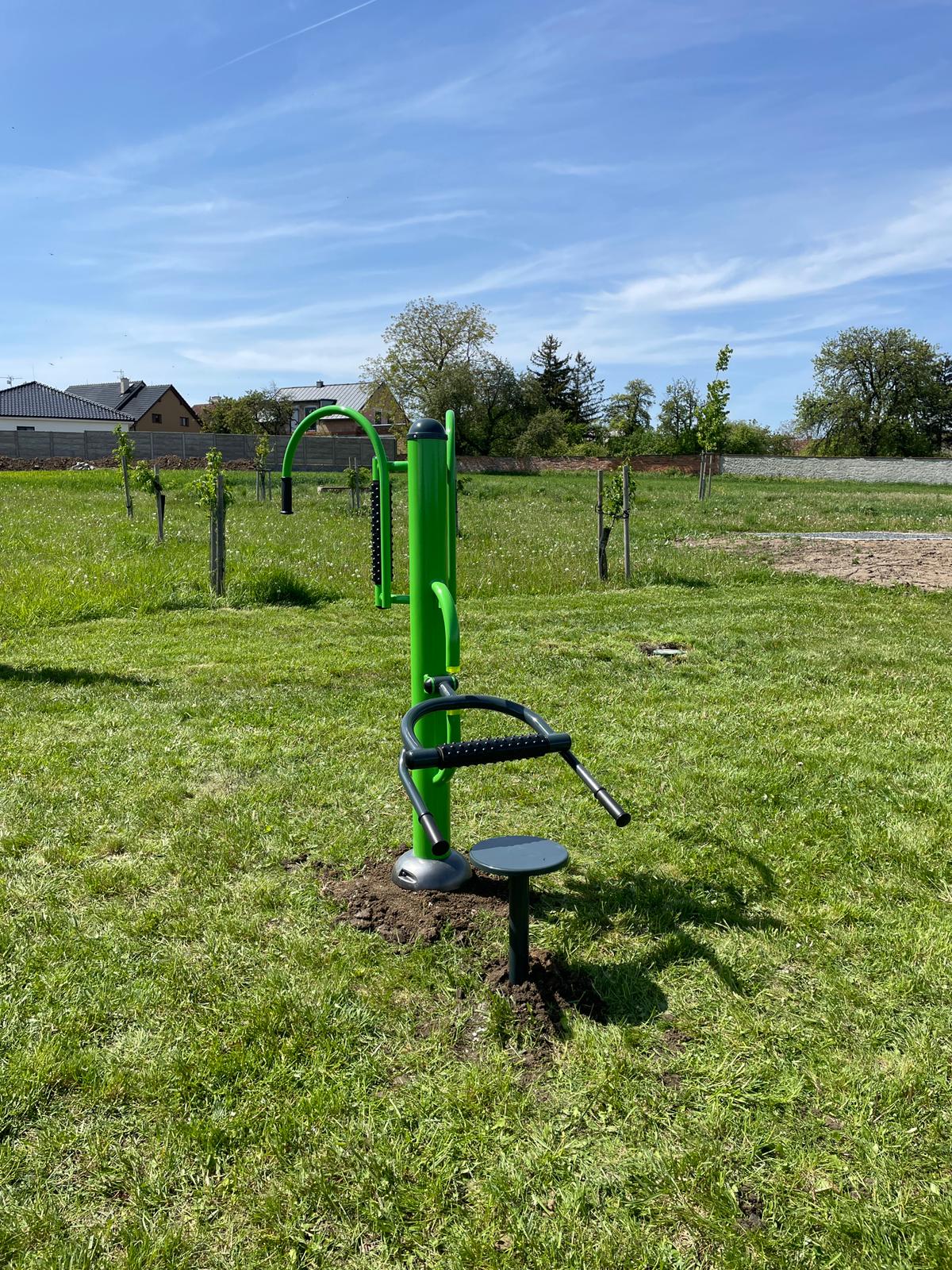 Venkovní fitness stroje v obci Křelov-Břuchotín nabízí prostor pro relaxační cvičení na masážním zařízení, na stroji pro procvičování pasu, na stroji pro cvičení ramen a zad.