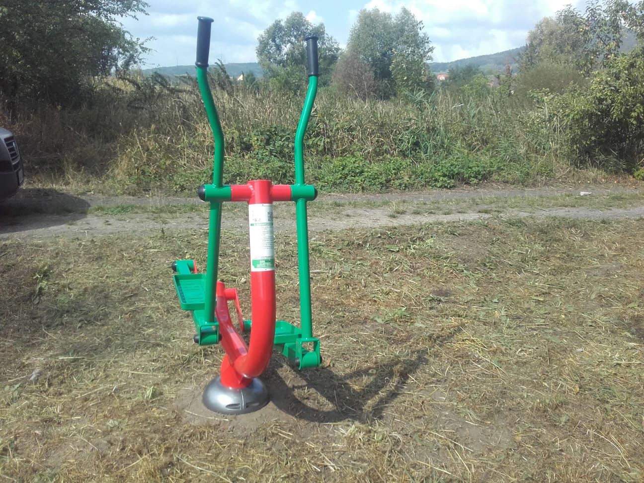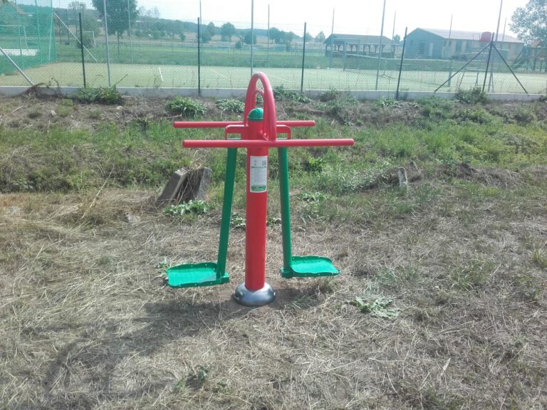 V obci Liběšice můžete vidět venkovní fitness stroje. Celonerezové stroje v barvě zeleno-červené.
