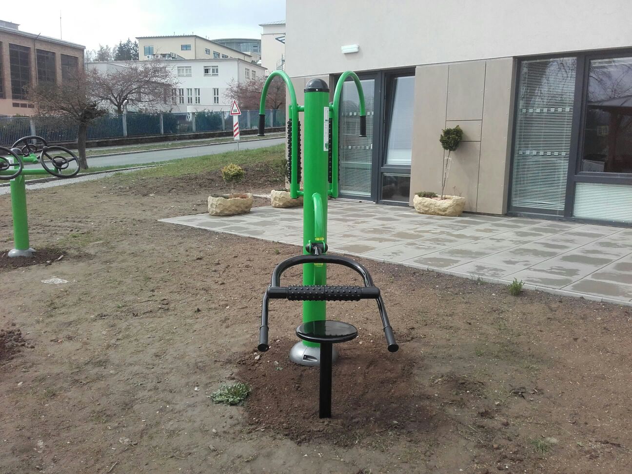 Na venkovních fitness strojích v barvě zeleno-červená si můžete zacvičit v Novém Městě na Moravě.