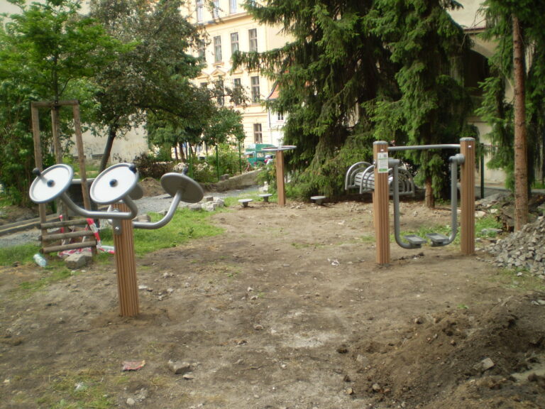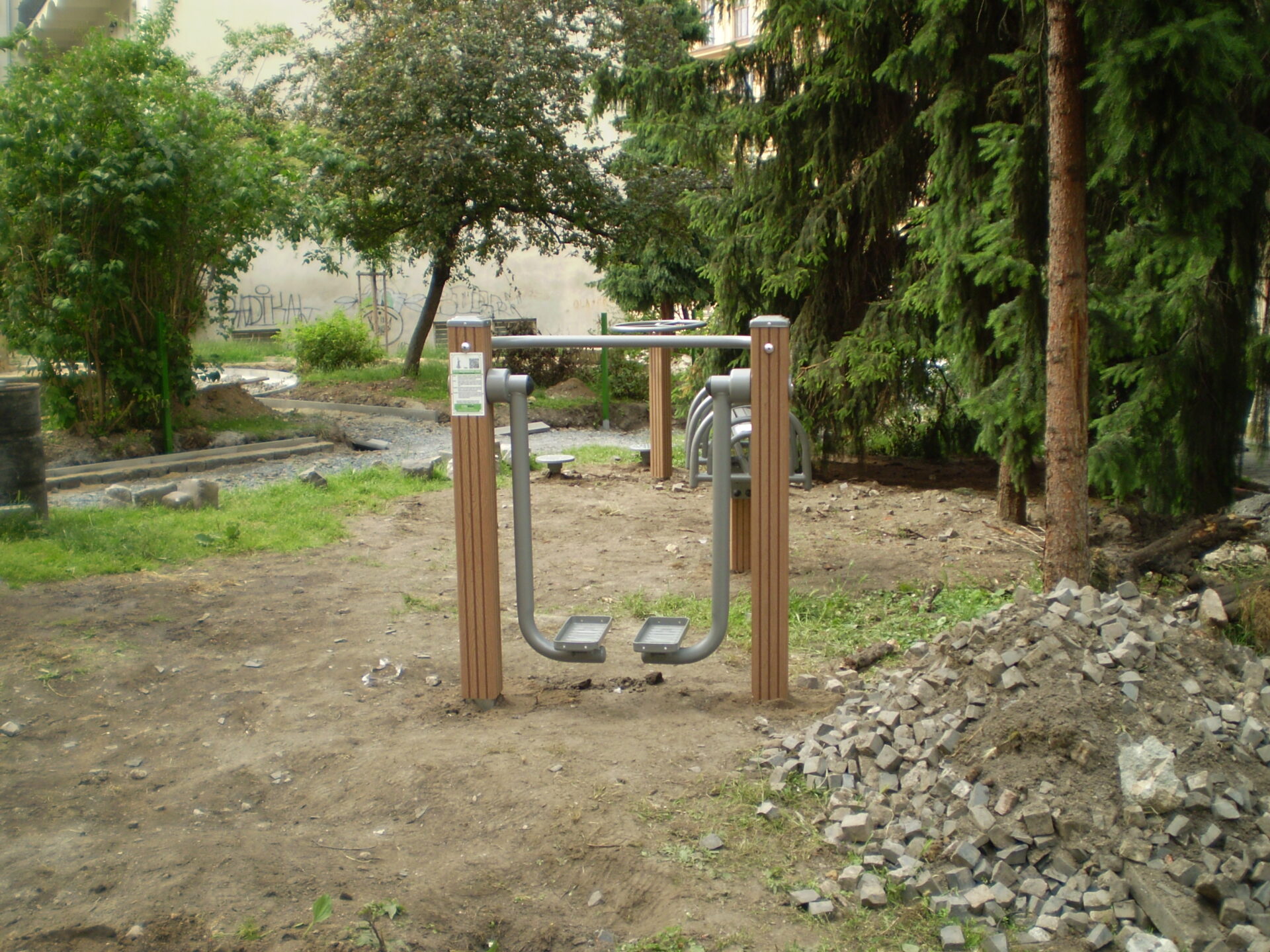Fitness stroje ve vlídném designu dřeva můžete vyzkoušet a protáhnout si celé tělo na dětském hřišti v ulici Vratislavova