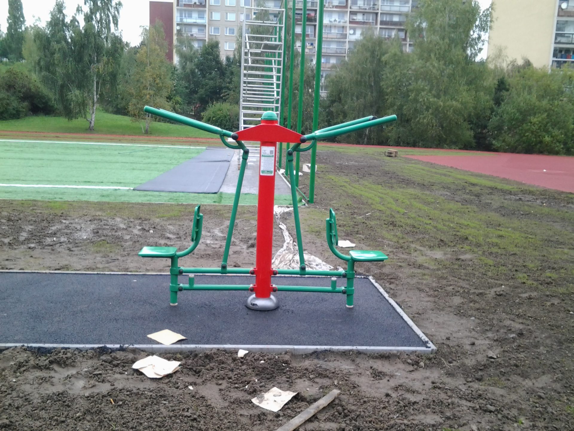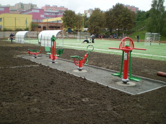 Venkovní fitness stroje v areálu ZŠ Laudova, na Praze 6.