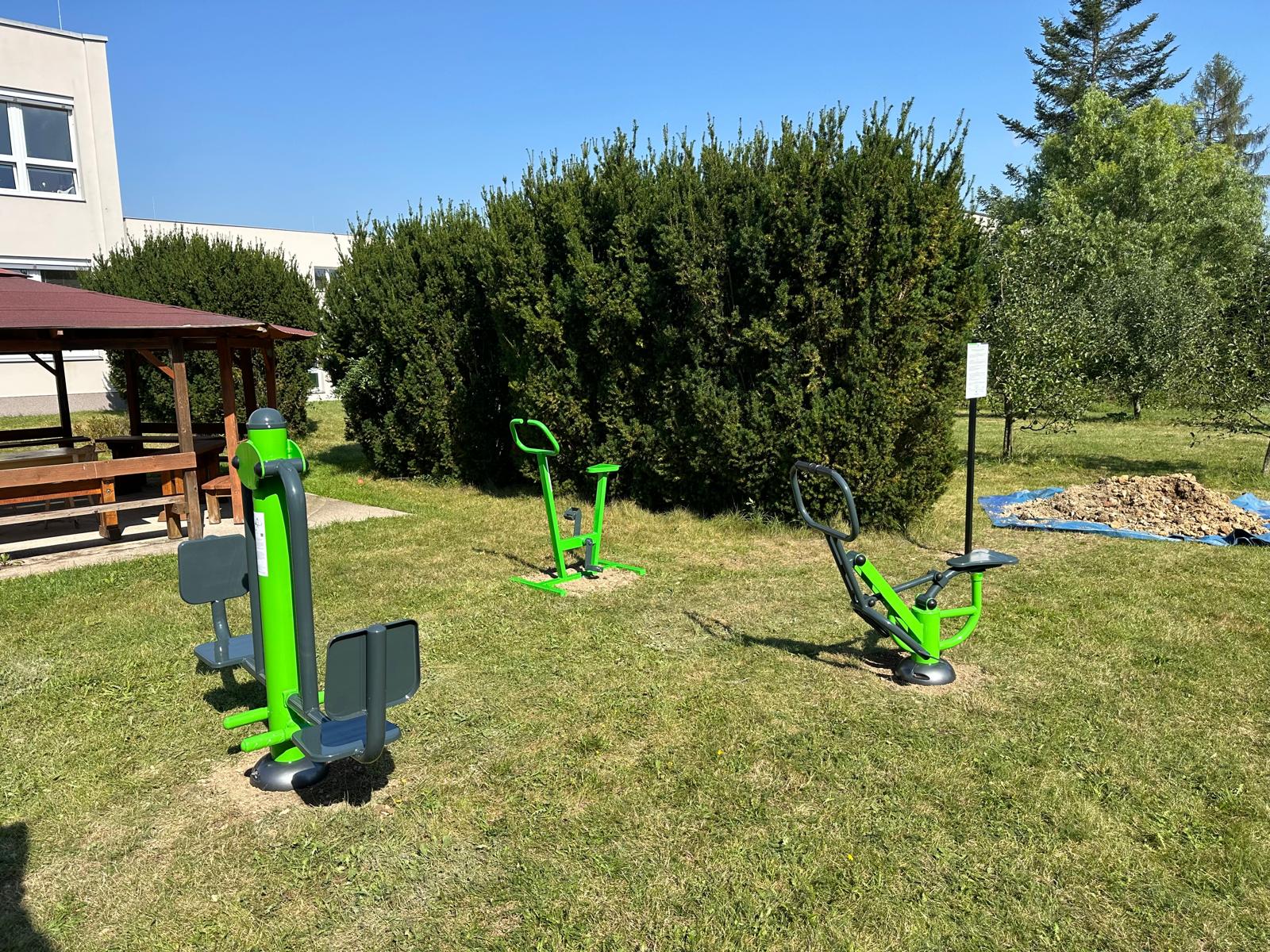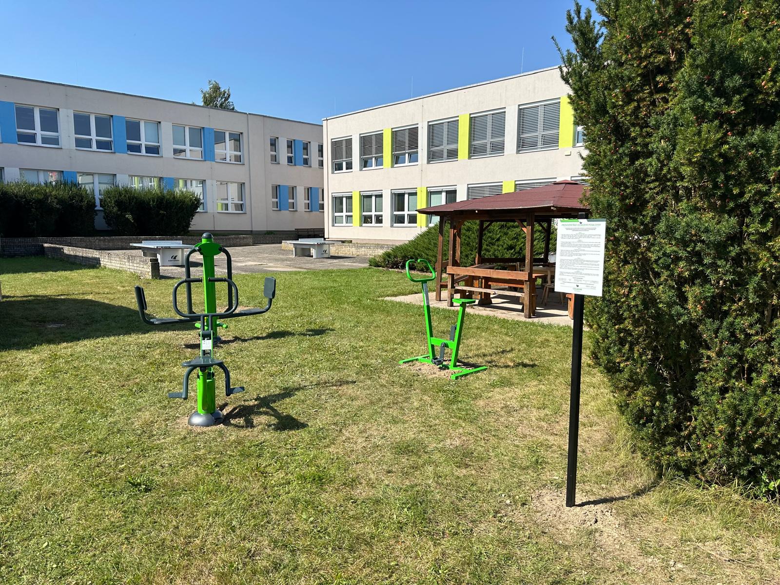 U Základní školy v ulici Školní obce Kaplice stojí venkovní fitness stroje určené pro protažení a posílení těla.