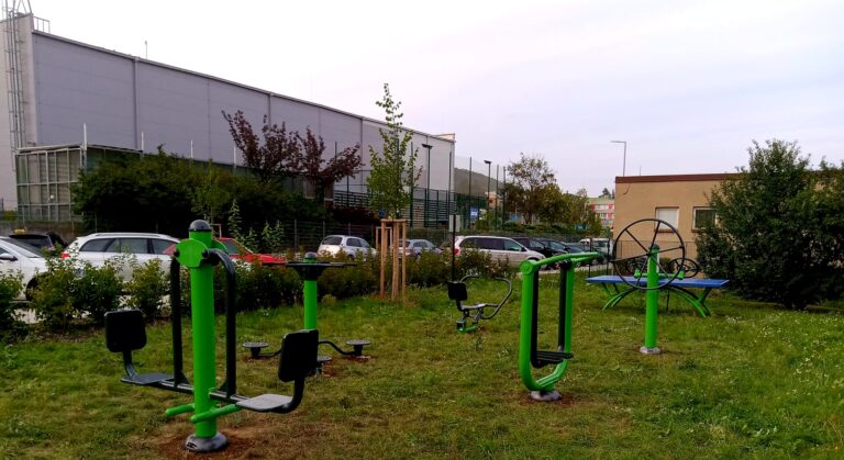 Vedle Základní školy a Praktické jsme na rohu ulice Karla Čapka, měli tu možnost vybudovat venkovní fitness hřiště.