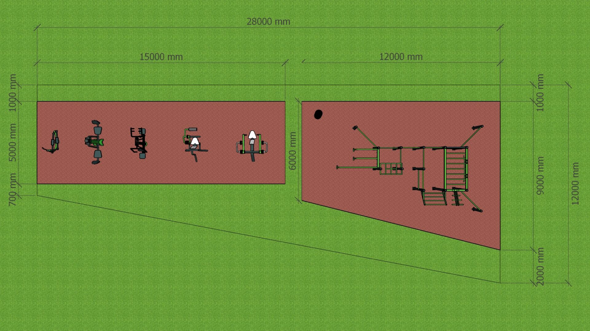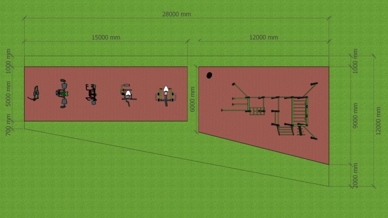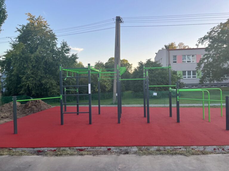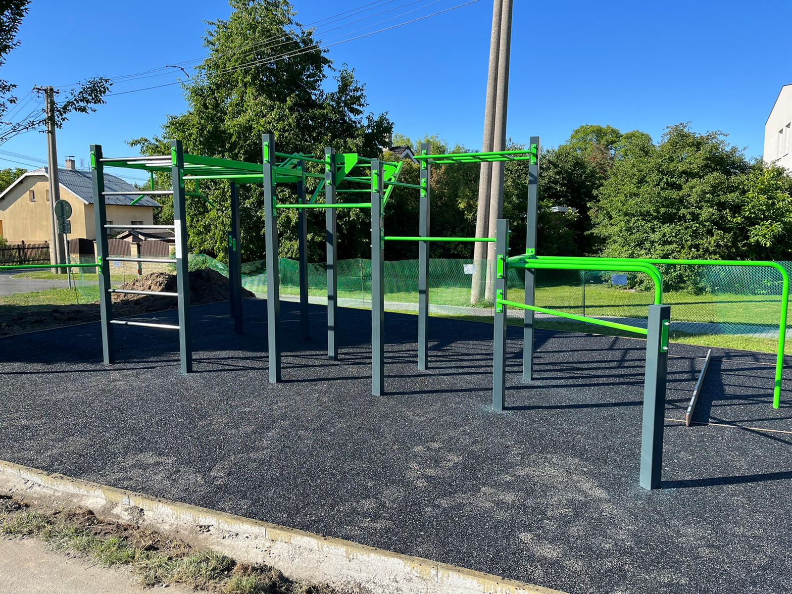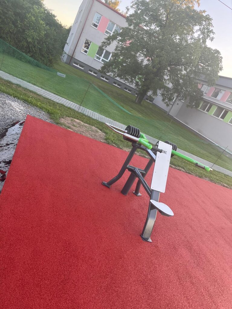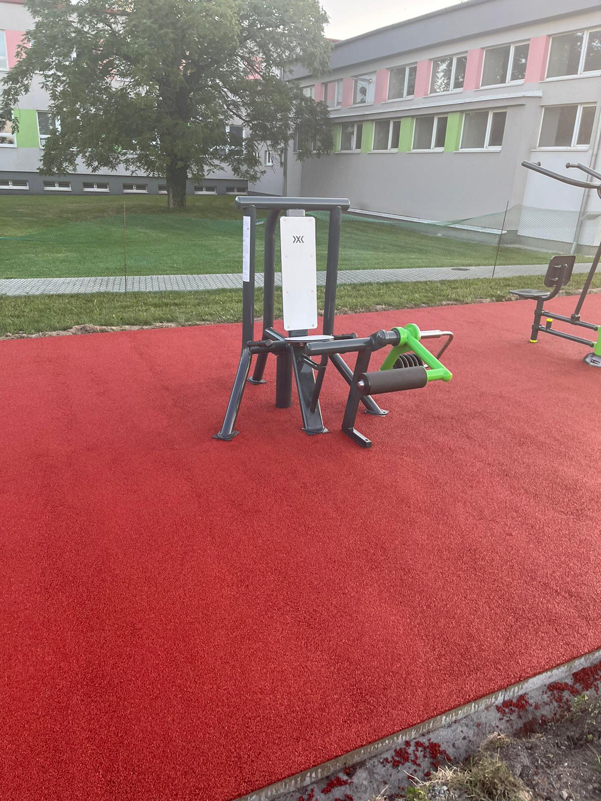 K těmto prvkům jsme přidali také venkovní fitness stroje řady XC. Na hřiště jsme použili jako dopadovou plochu – litou pryž.