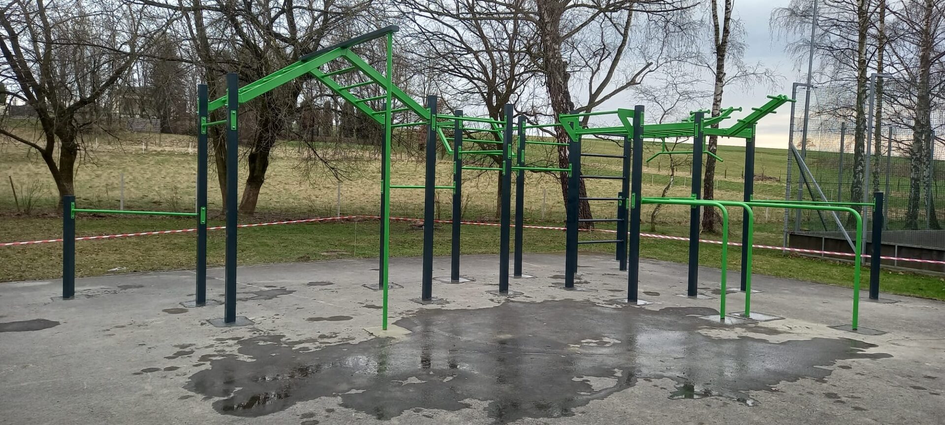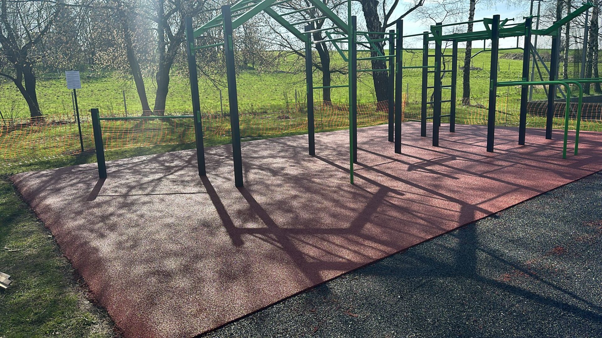 Venkovní posilovna v Jeseníku nad Odrou v Moravskoslezském kraji nabízí velkorysou workoutovou sestavu, fitness stroje k procvičování pasu a chůze, veslovací a elipsovité zařízení pro kondiční trénink a posilovací stroj se zátěží – tlaky na ramena.