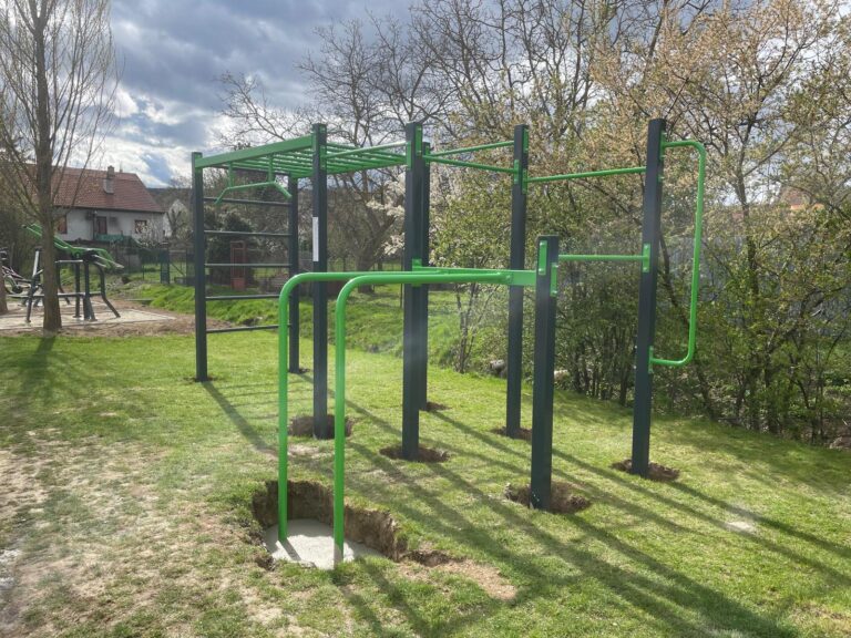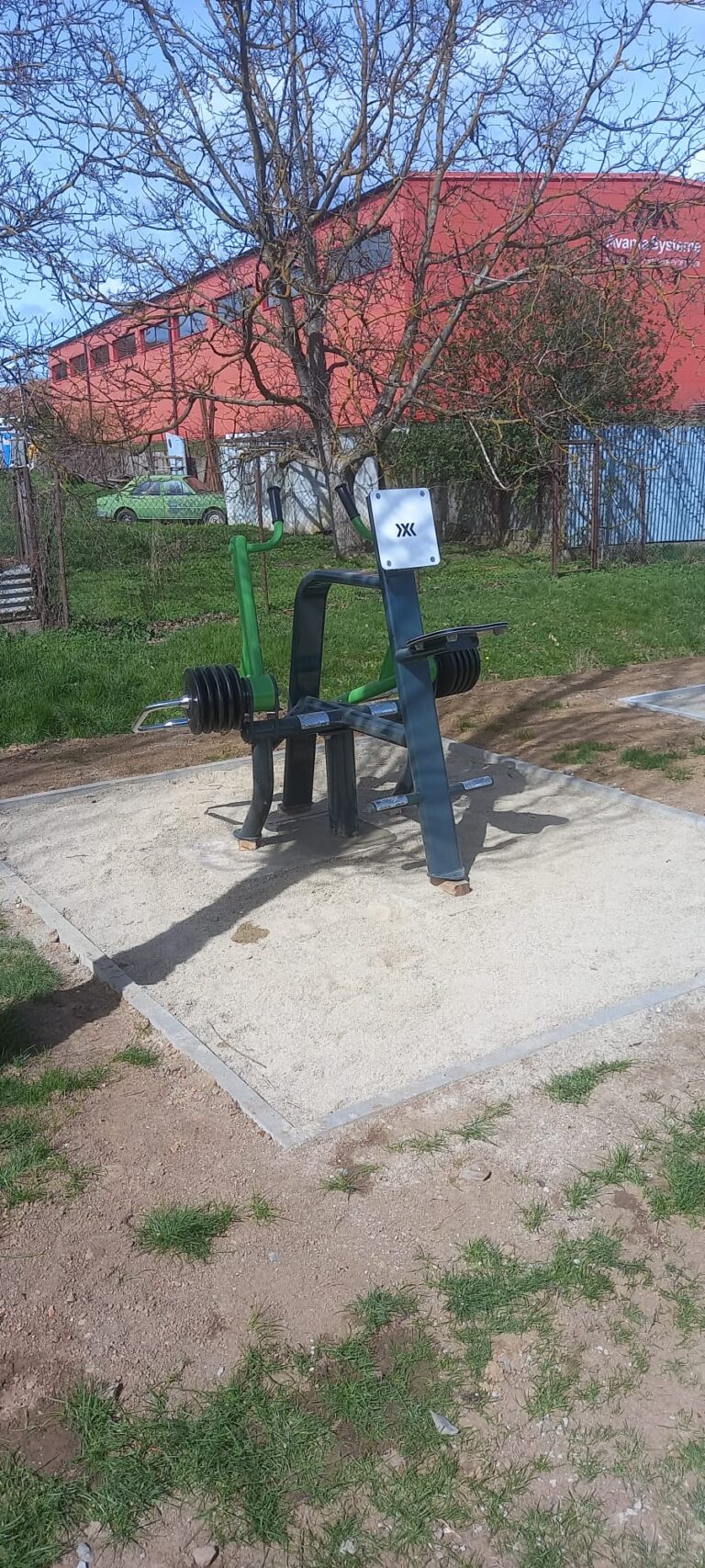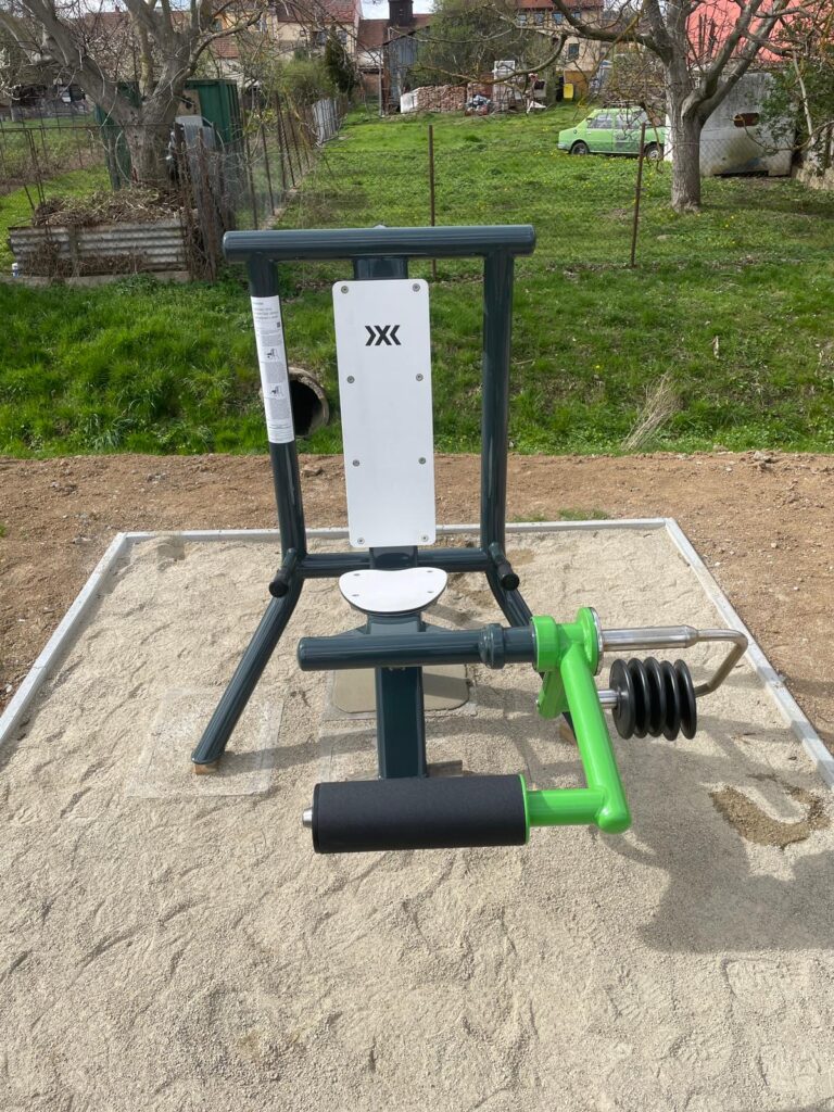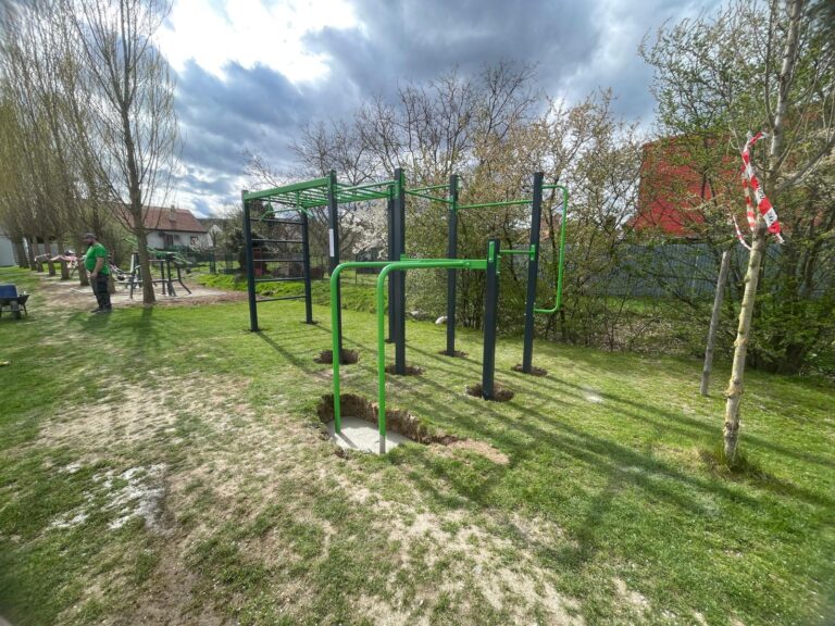 Vedle fotbalového hřiště v obci Popůvky okrese Brno v Jihomoravském kraji stojí venkovní posilovna s fitness stroji se zátěží a street workout v A-typovém provedení.