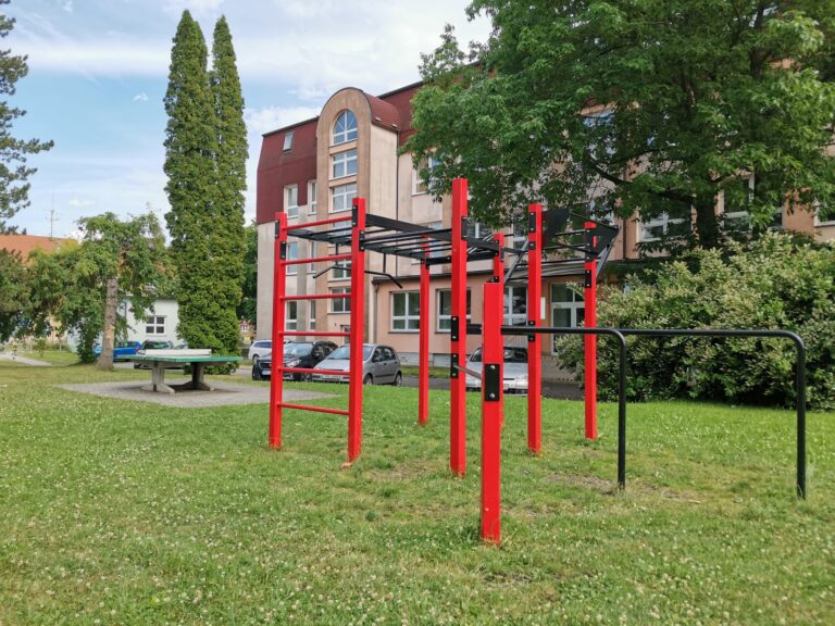 V obci Blovice u areálu gymnázia si můžete zacvičit na workoutové sestavě Florida v barevné kombinaci červeno-černé barvy s bezpečnou dopadovou plochou. Perfektní kombinace malé plochy s největší dosaženou přidanou hodnotou. Workout Florida na první pohled uchvátí svojí dokonalou konstrukcí a množstvím cvičebních prvků.