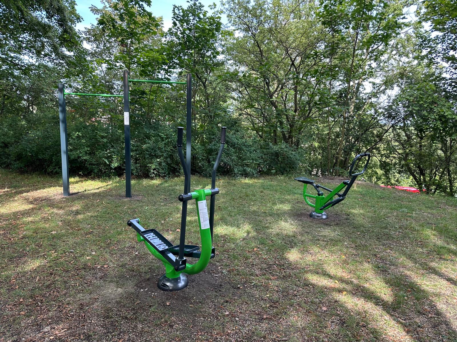 V obci Vinařice na Kladensku si můžete zacvičit na workoutové sestavě v barevném provedení antracit/zelená, která krásně zapadá do okolní zalesněné krajiny.