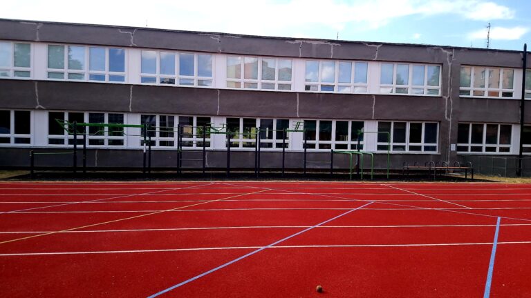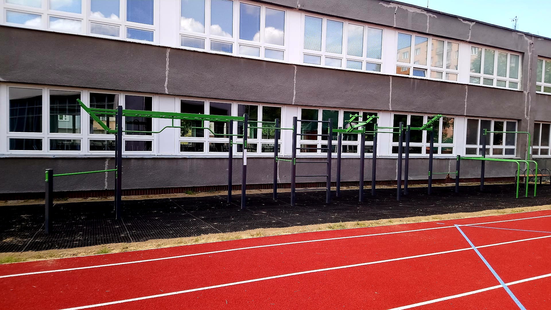 Na 11. základní škole si můžete zacvičit na workoutové sestavě s lavicí se stálky, jako bezpečnostní plochu zvolila škola, gumovou bezpečnostní dopadovou plochu.