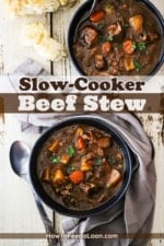 EXPERT TIP: Once the slow-cooker beef stew has cooked for 8 to 10 hours, it’s time to thicken the sauce a little. We use a cornstarch slurry which is ¼ cup of cornstarch mixed with 4 tablespoons of water. Pour it into the stew and it will thicken quickly. You can also mix ¼ cup of all-purpose flour with ½ cup of the stew sauce and then stir it in and cook for another 30 minutes.